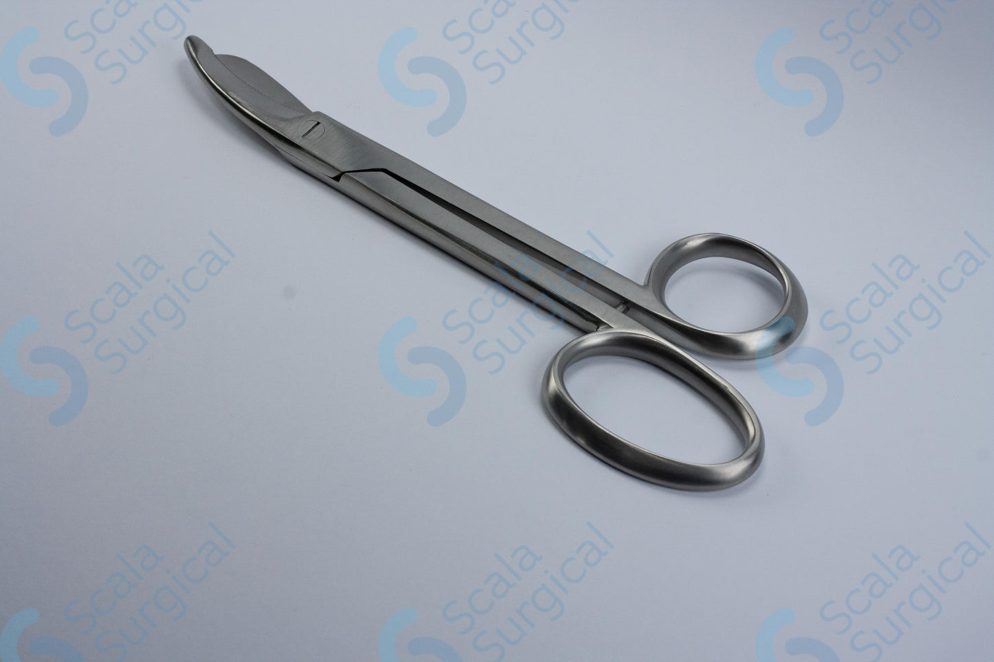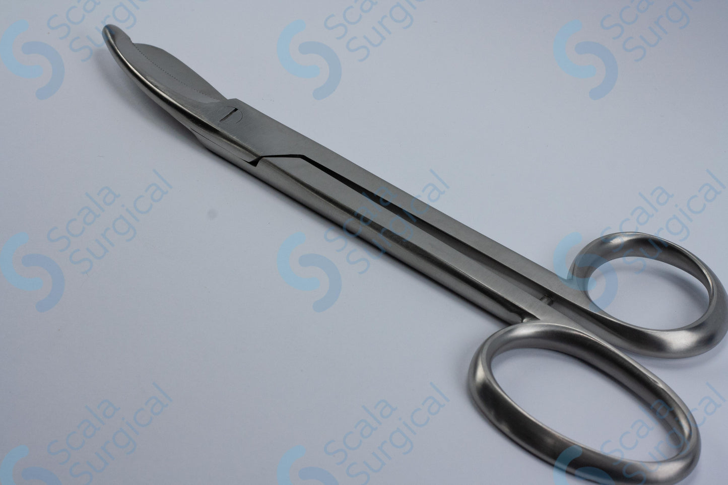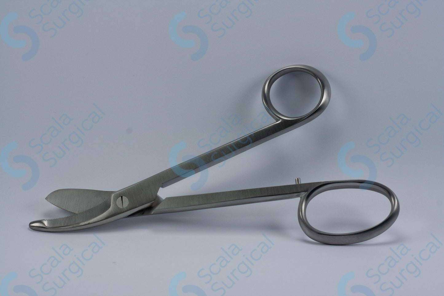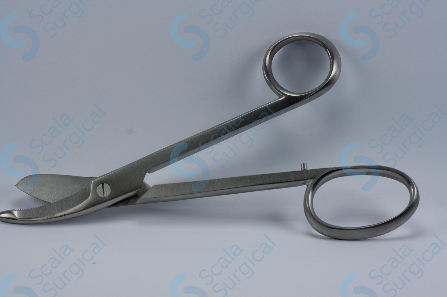 This item is used to cut plaster casts for medical purposes. The serrated lower blade is designed to be used with a handle to safely and efficiently cut through the plaster.
