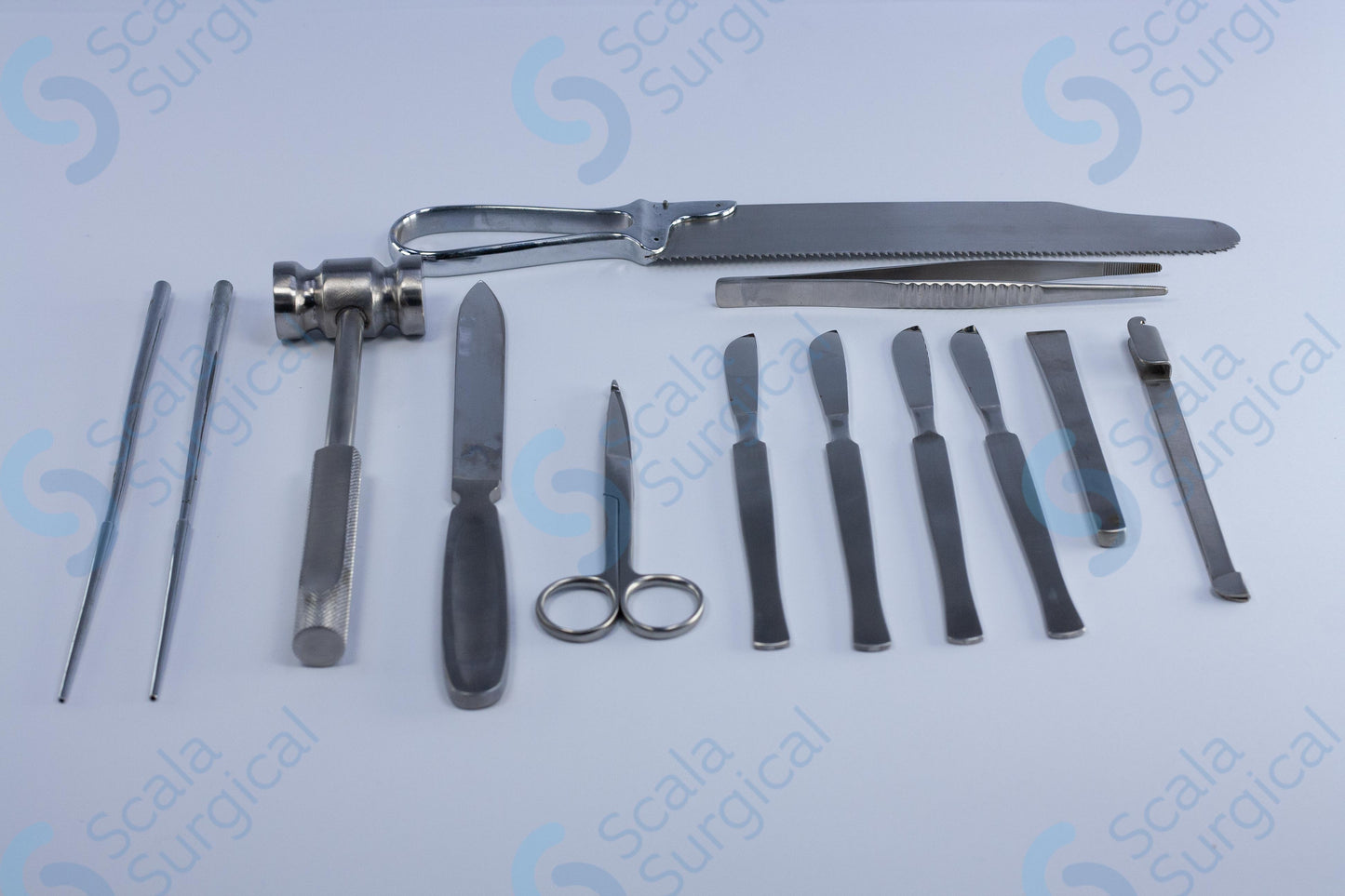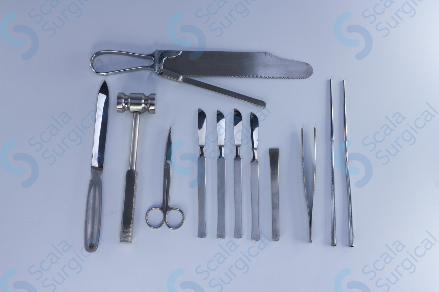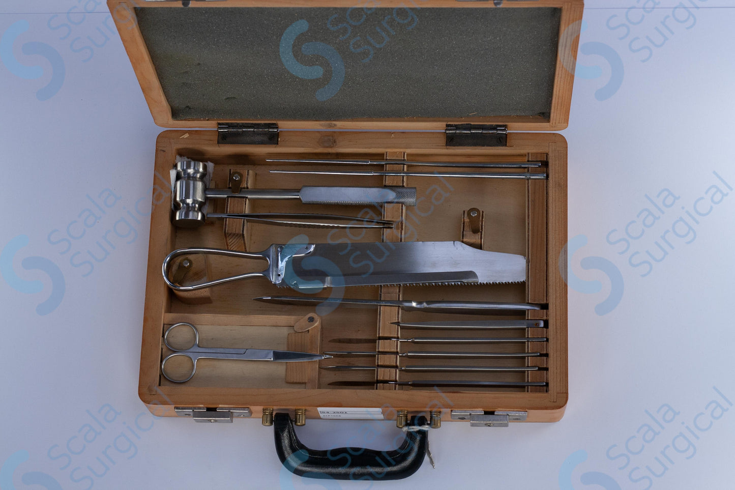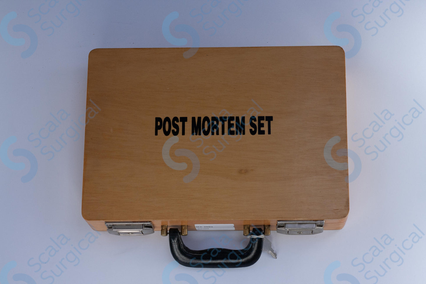 A Post Mortem Amputation Set 2 is a set of surgical instruments that is used to perform amputations on bodies after death. It includes items such as scalpels, forceps, and saws that are used to remove limbs from the body.