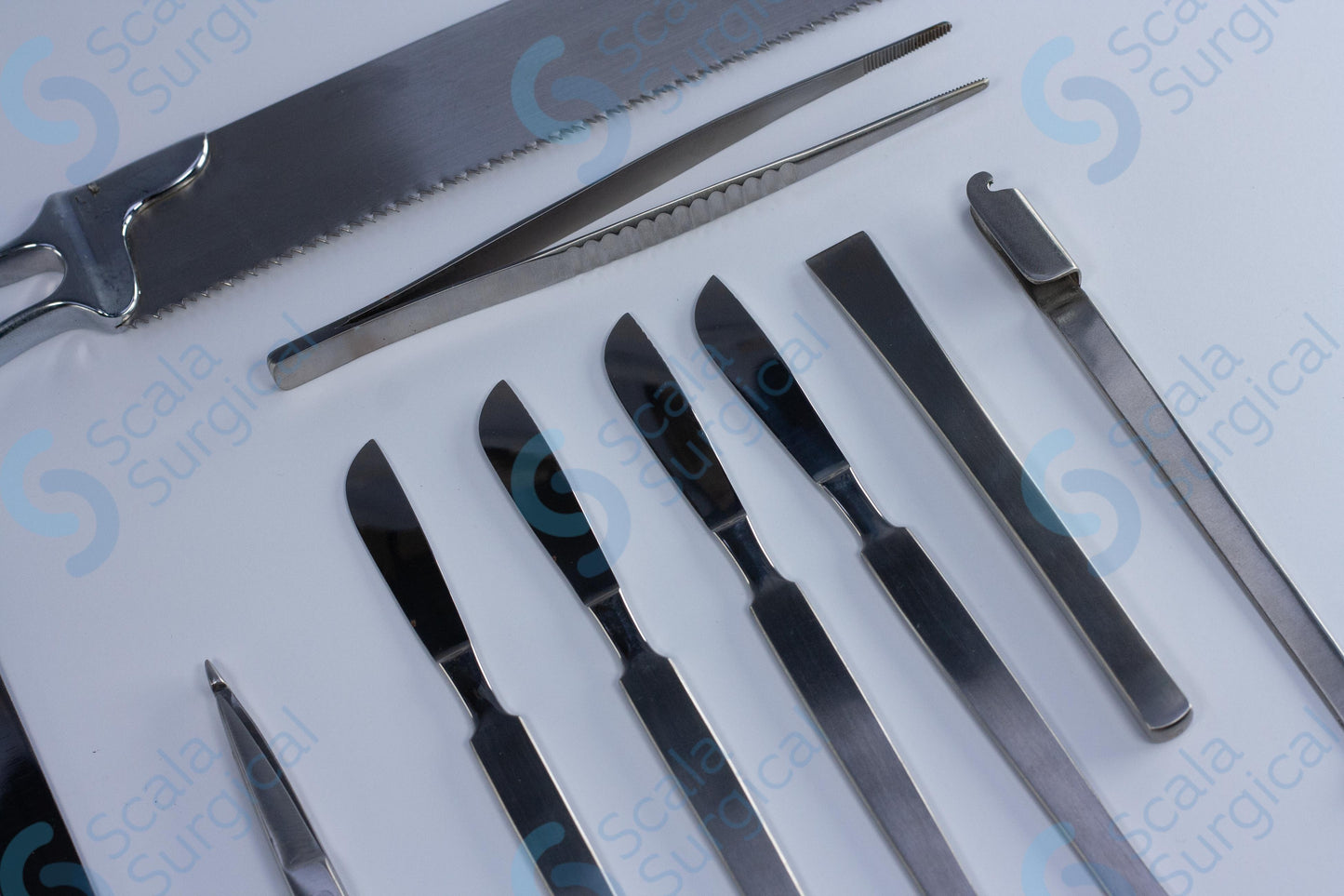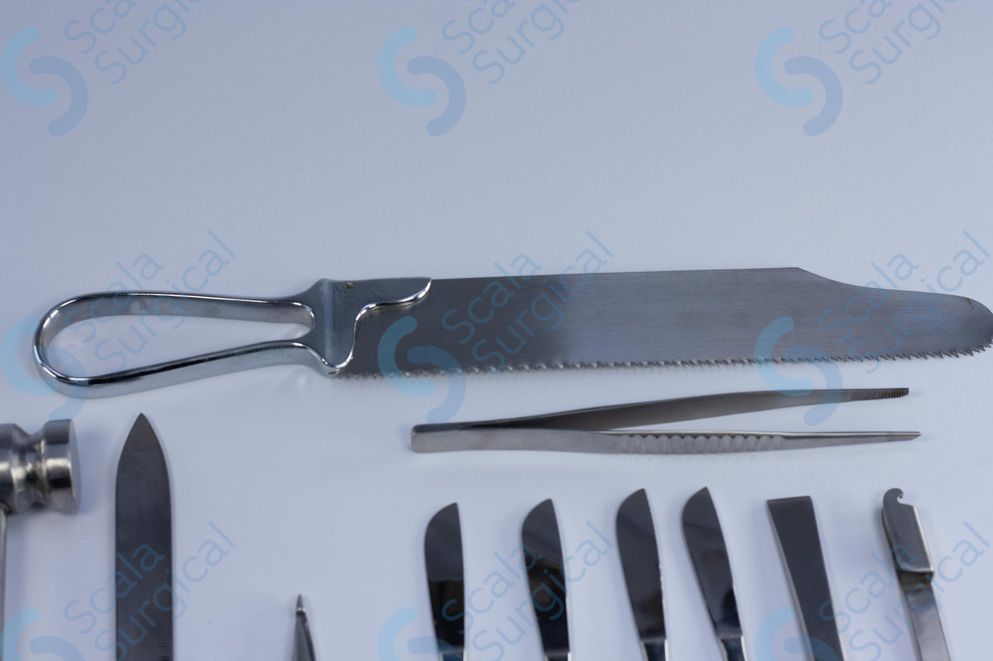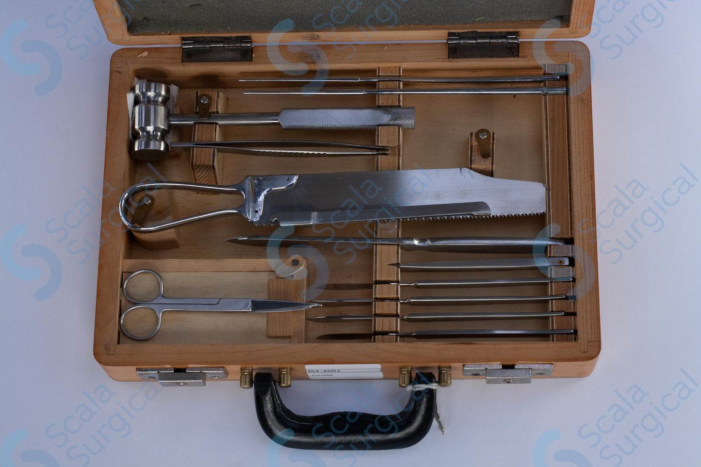 A Post Mortem Amputation Set 2 is a set of surgical instruments that is used to perform amputations on bodies after death. It includes items such as scalpels, forceps, and saws that are used to remove limbs from the body.