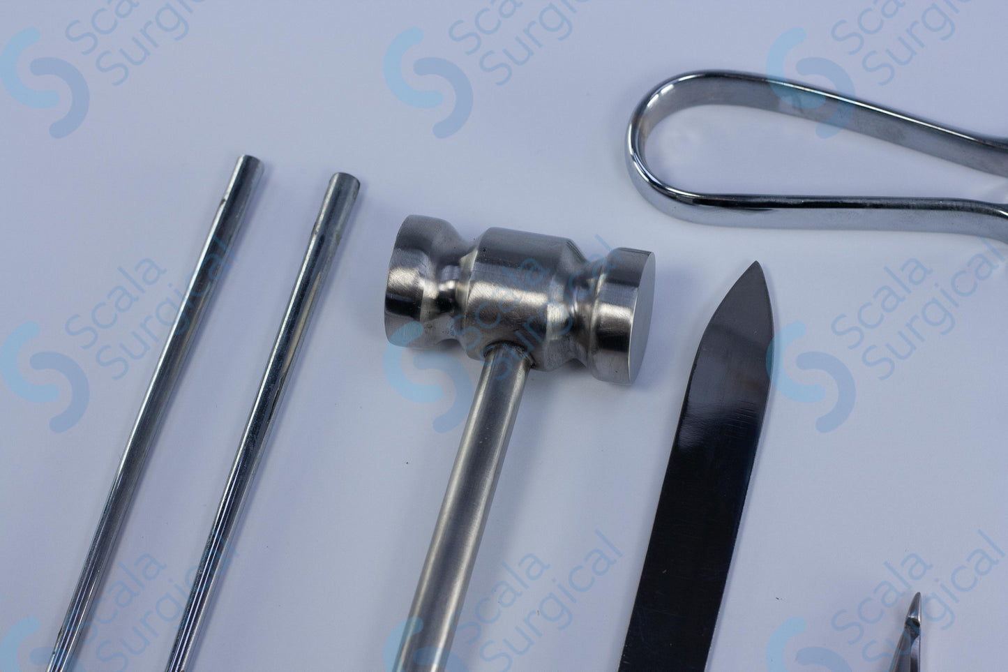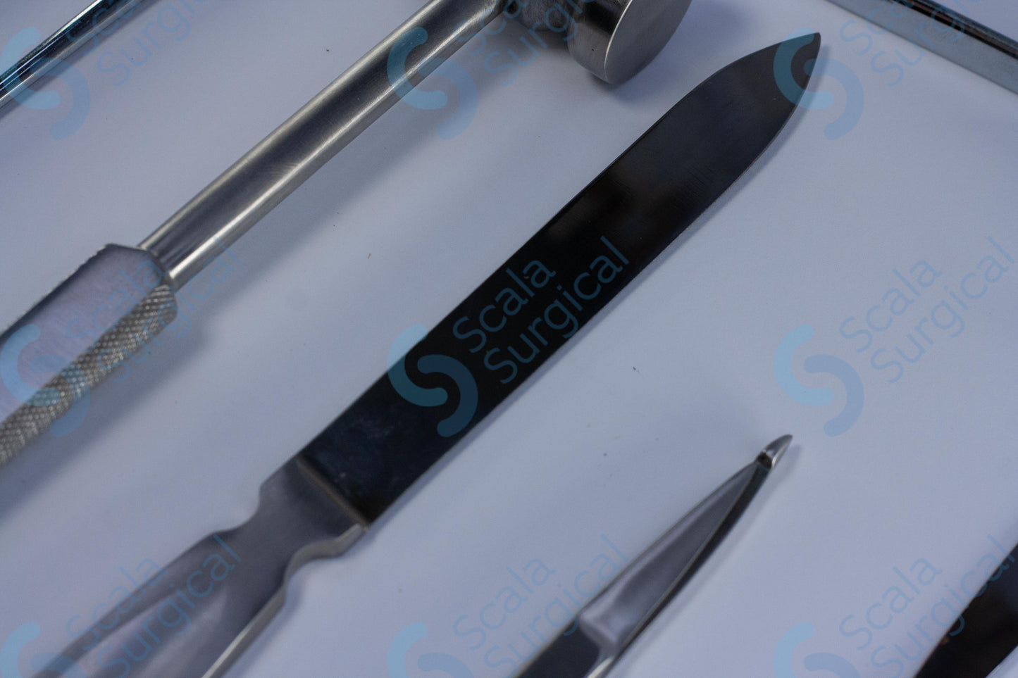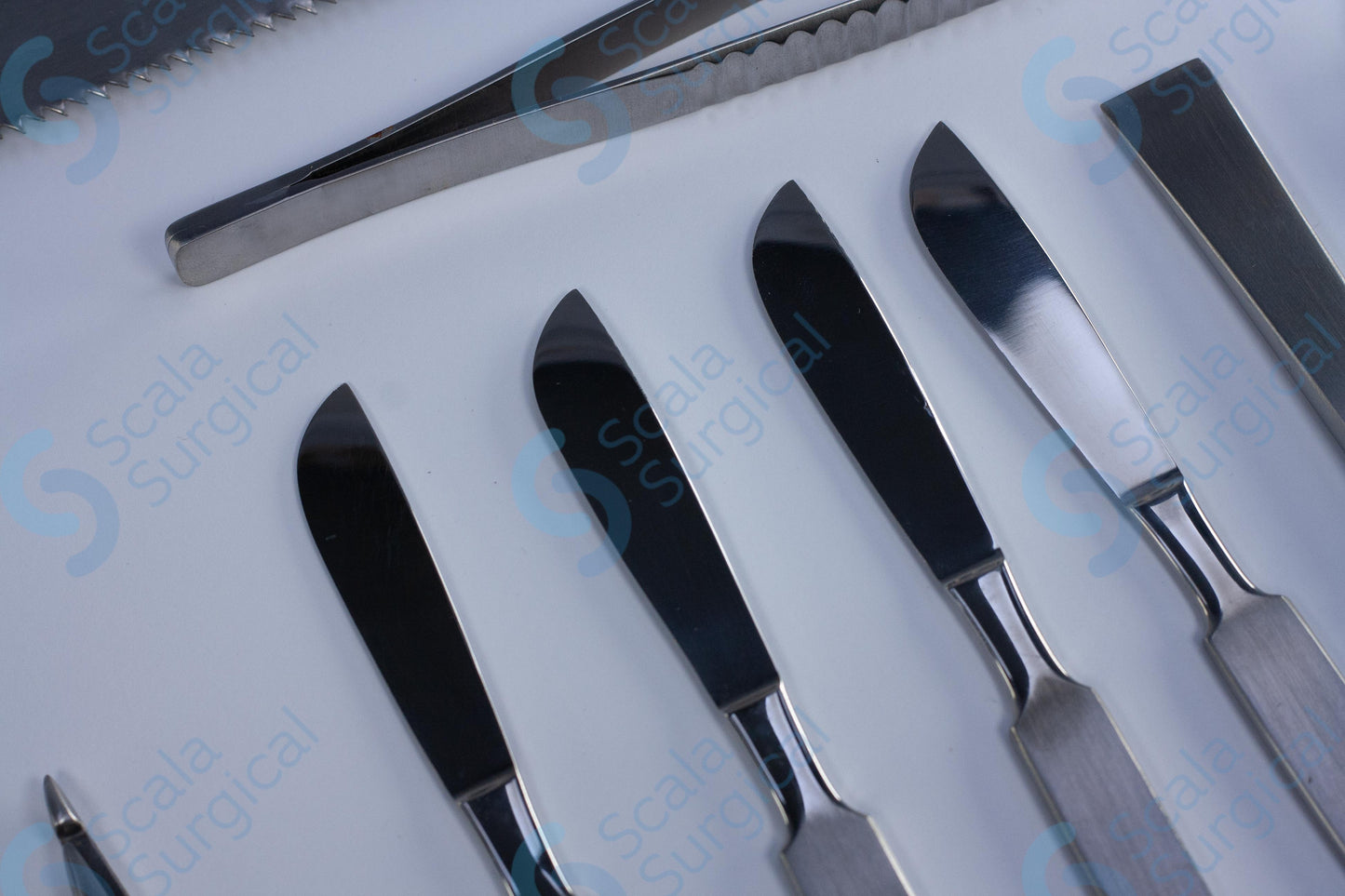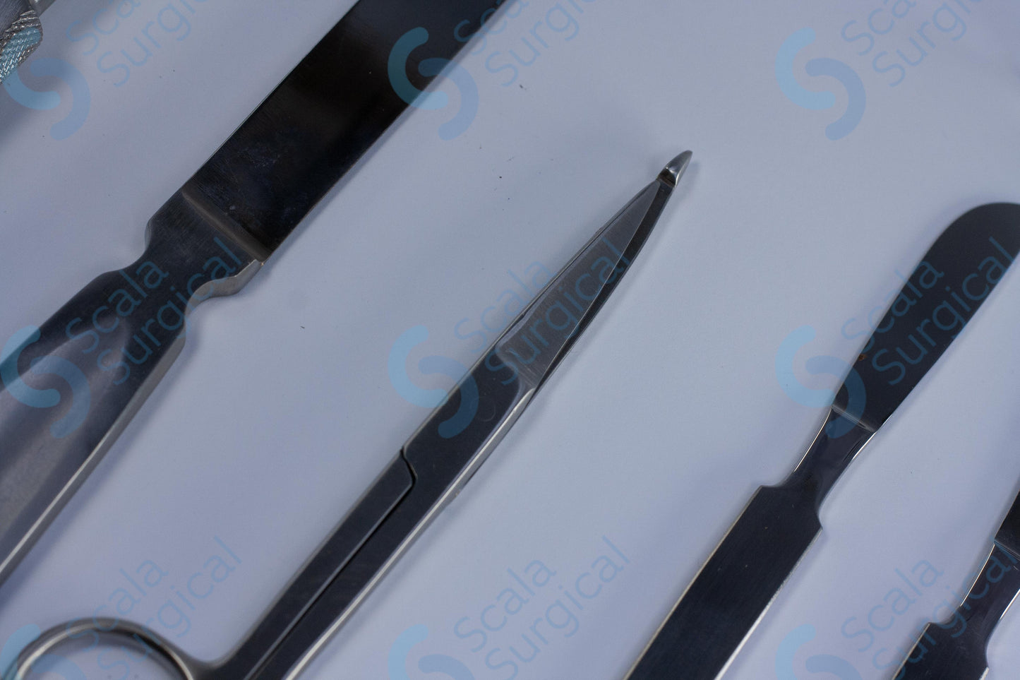 A Post Mortem Amputation Set 2 is a set of surgical instruments that is used to perform amputations on bodies after death. It includes items such as scalpels, forceps, and saws that are used to remove limbs from the body.