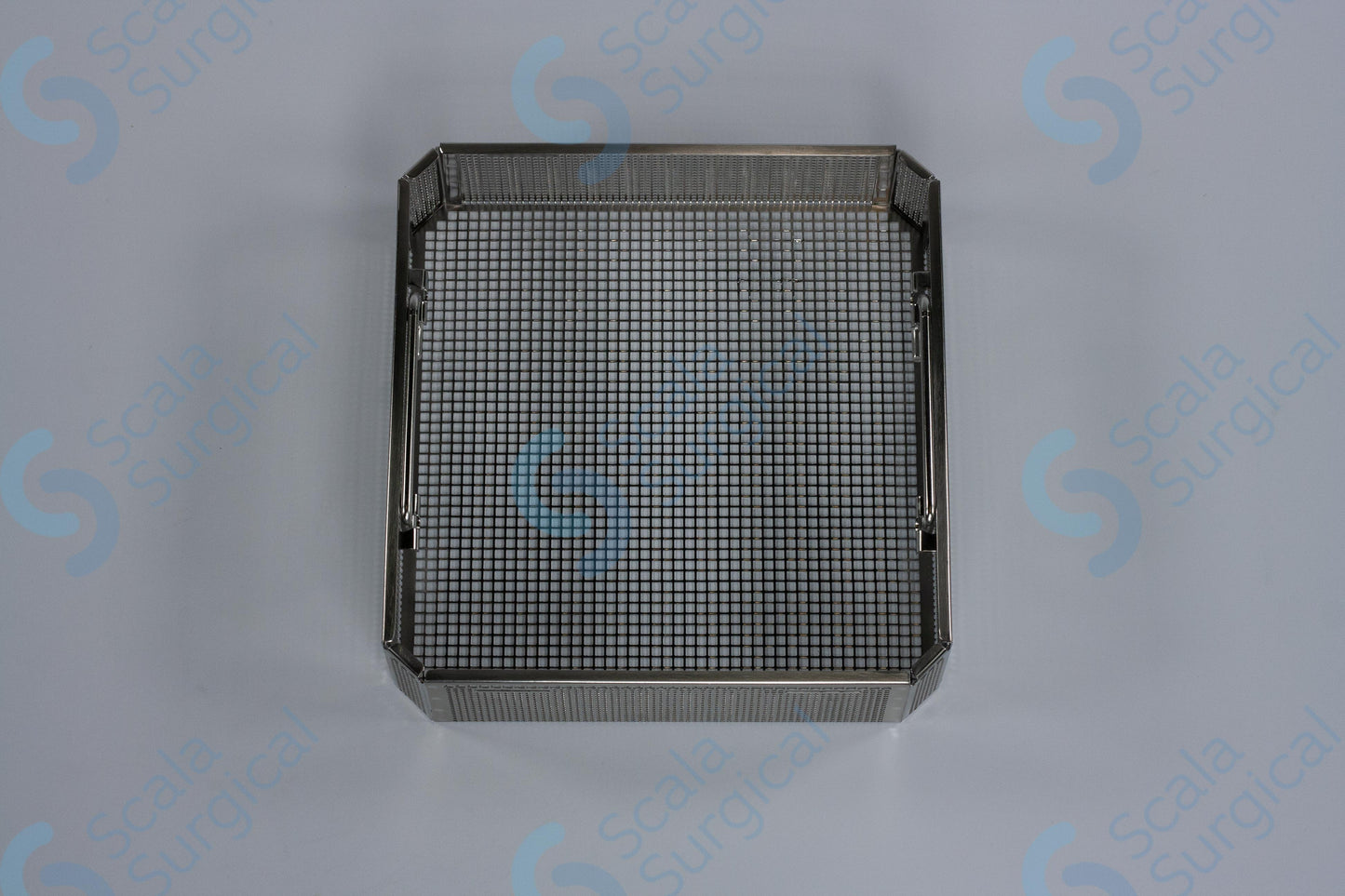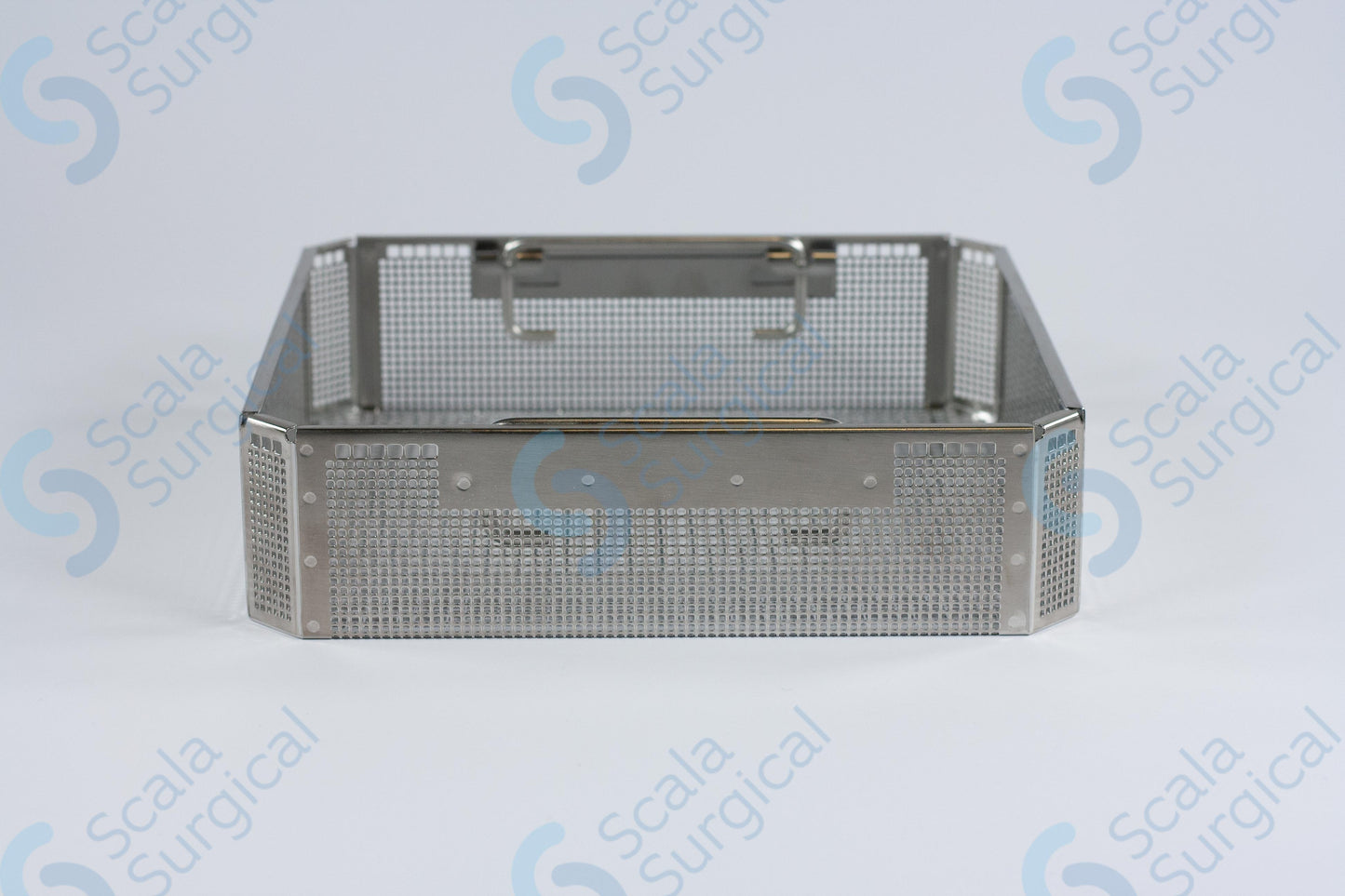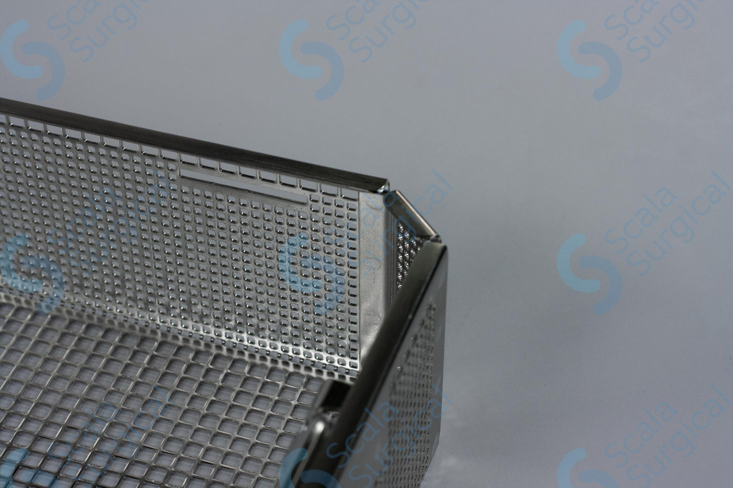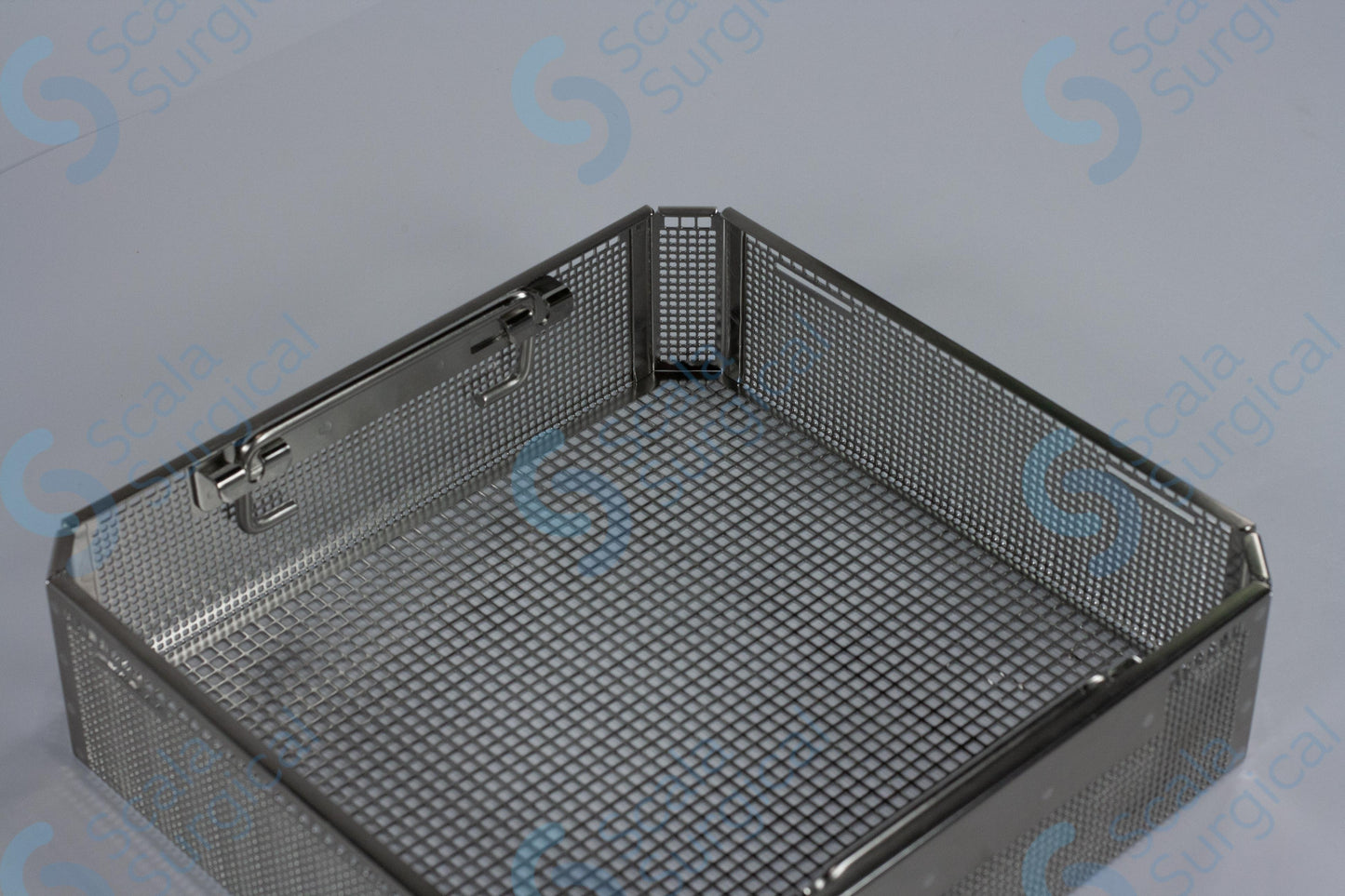 A pressed metal basket without feet is used to store and transport surgical instruments. It is made of stainless steel, has holes punched into it to allow easy draining of liquid and optimal drying.