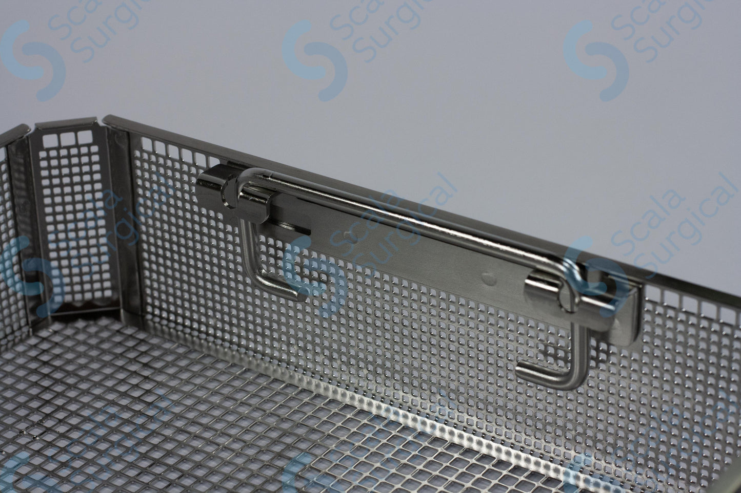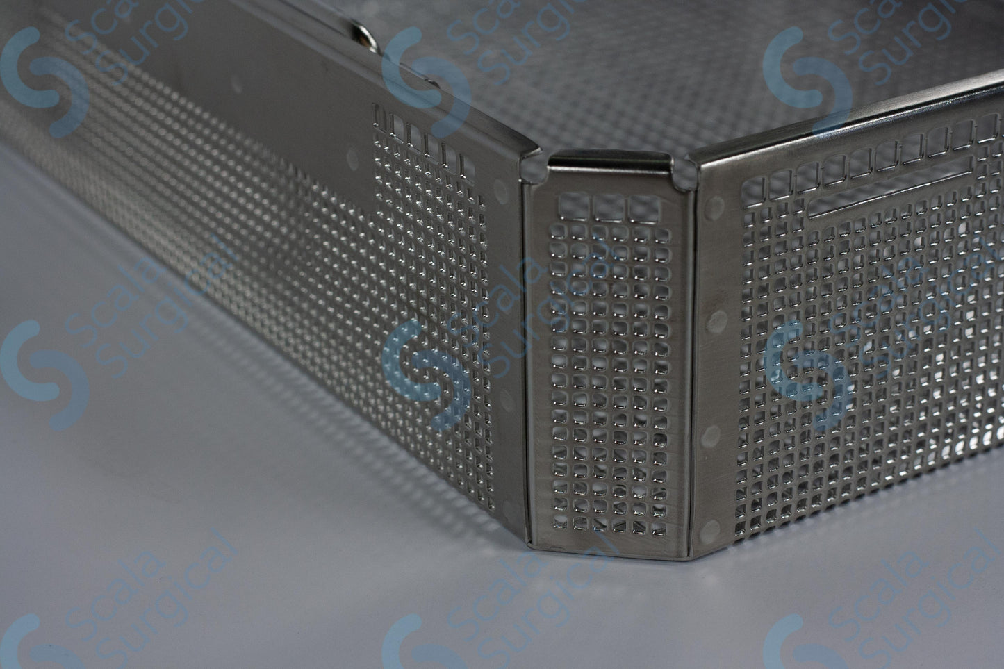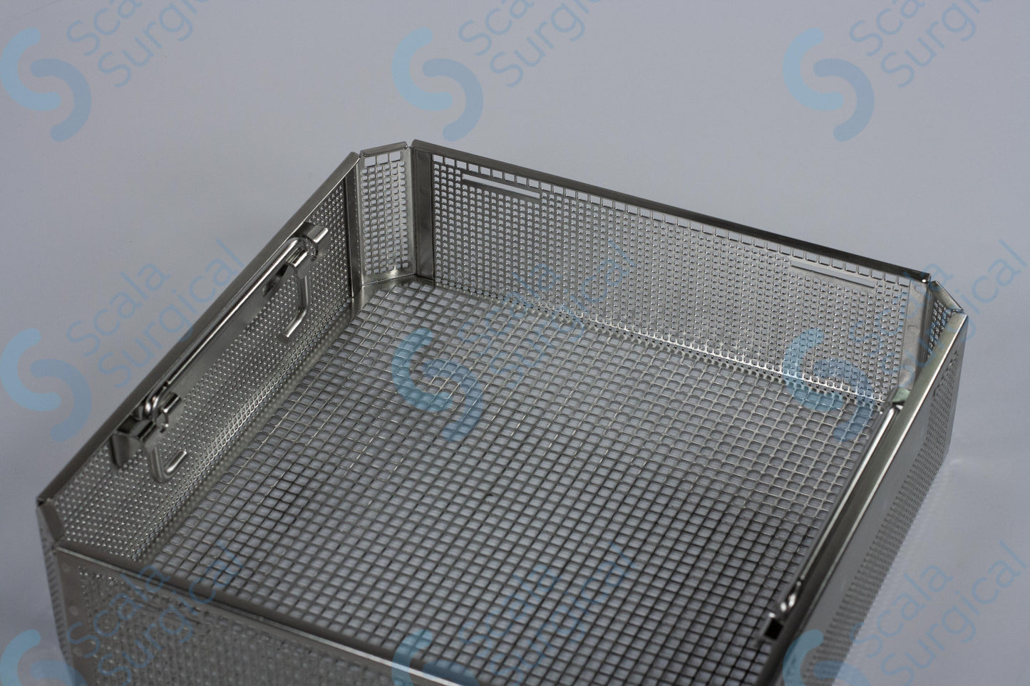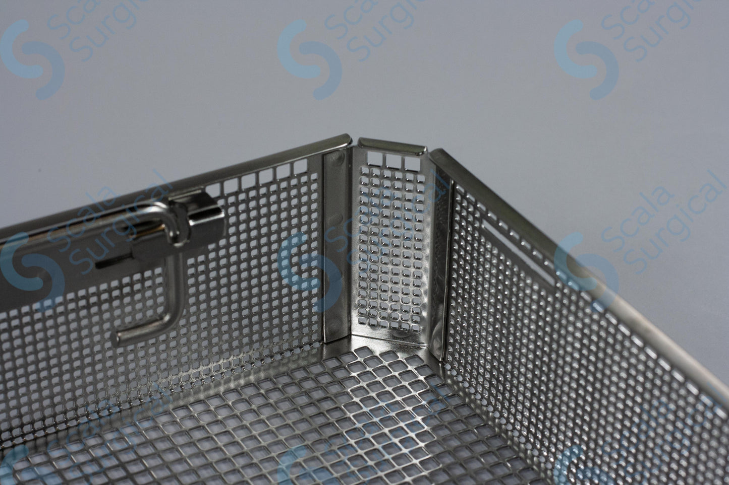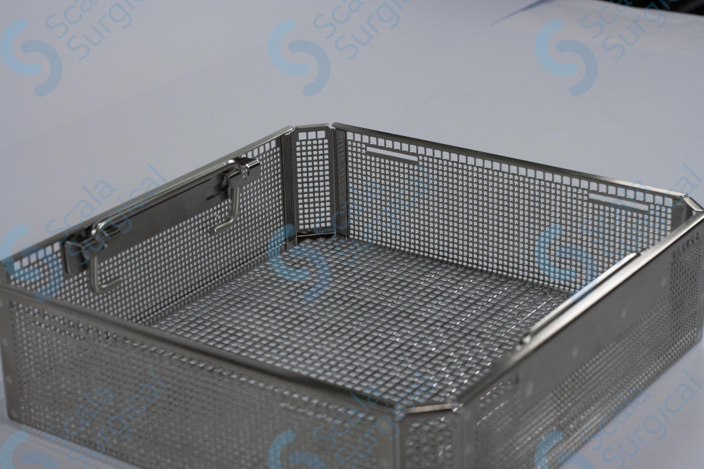 A pressed metal basket without feet is used to store and transport surgical instruments. It is made of stainless steel, has holes punched into it to allow easy draining of liquid and optimal drying.