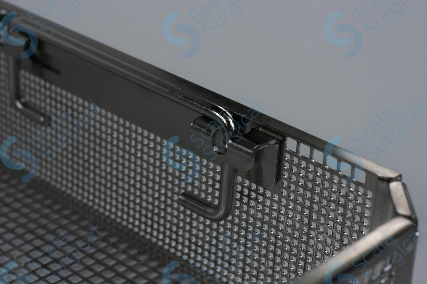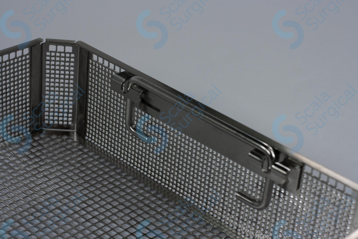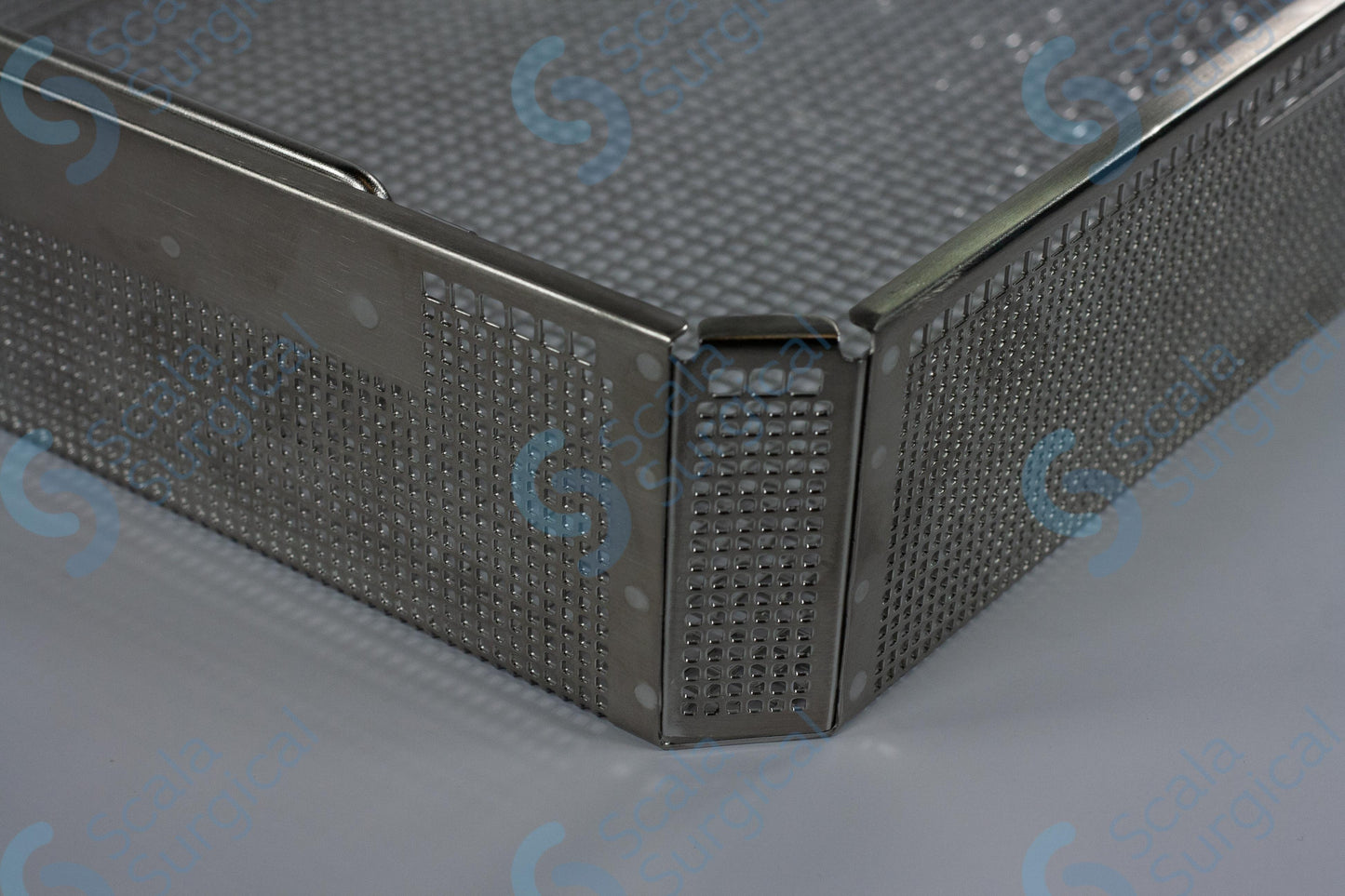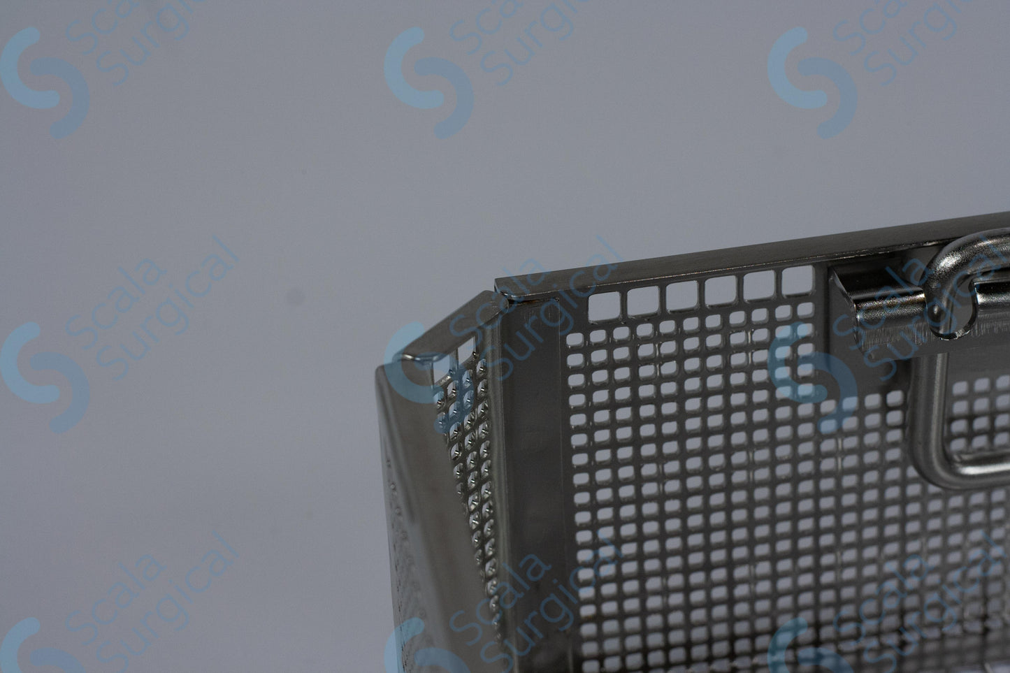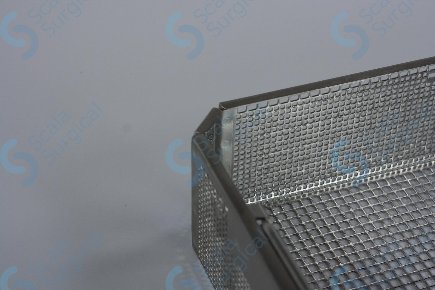 A pressed metal basket without feet is used to store and transport surgical instruments. It is made of stainless steel, has holes punched into it to allow easy draining of liquid and optimal drying.