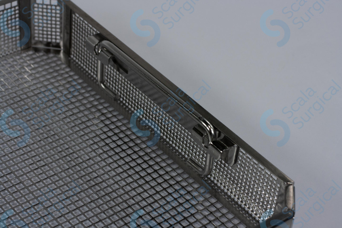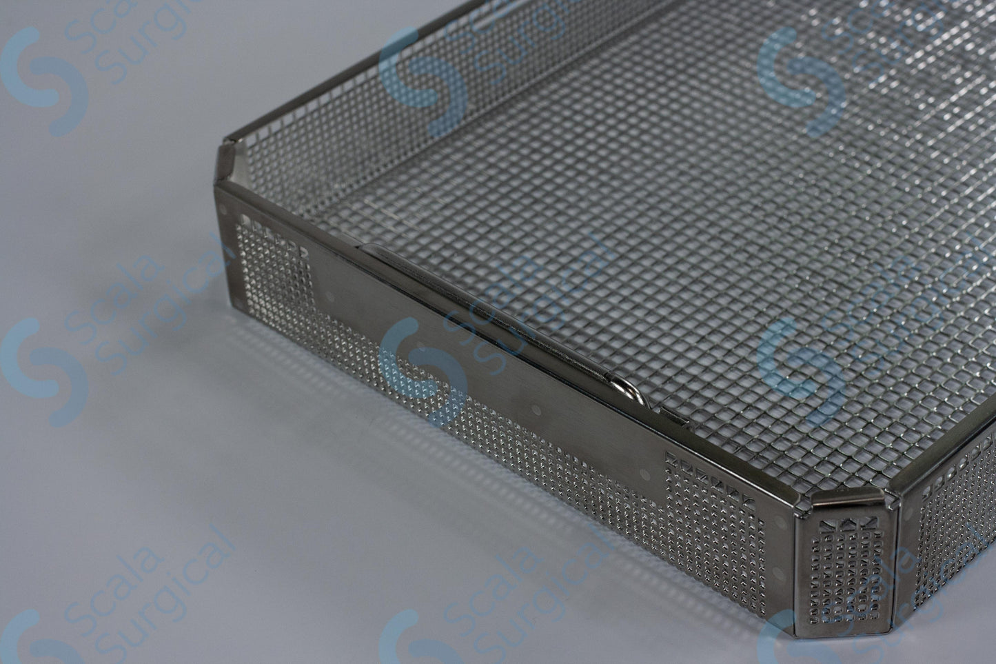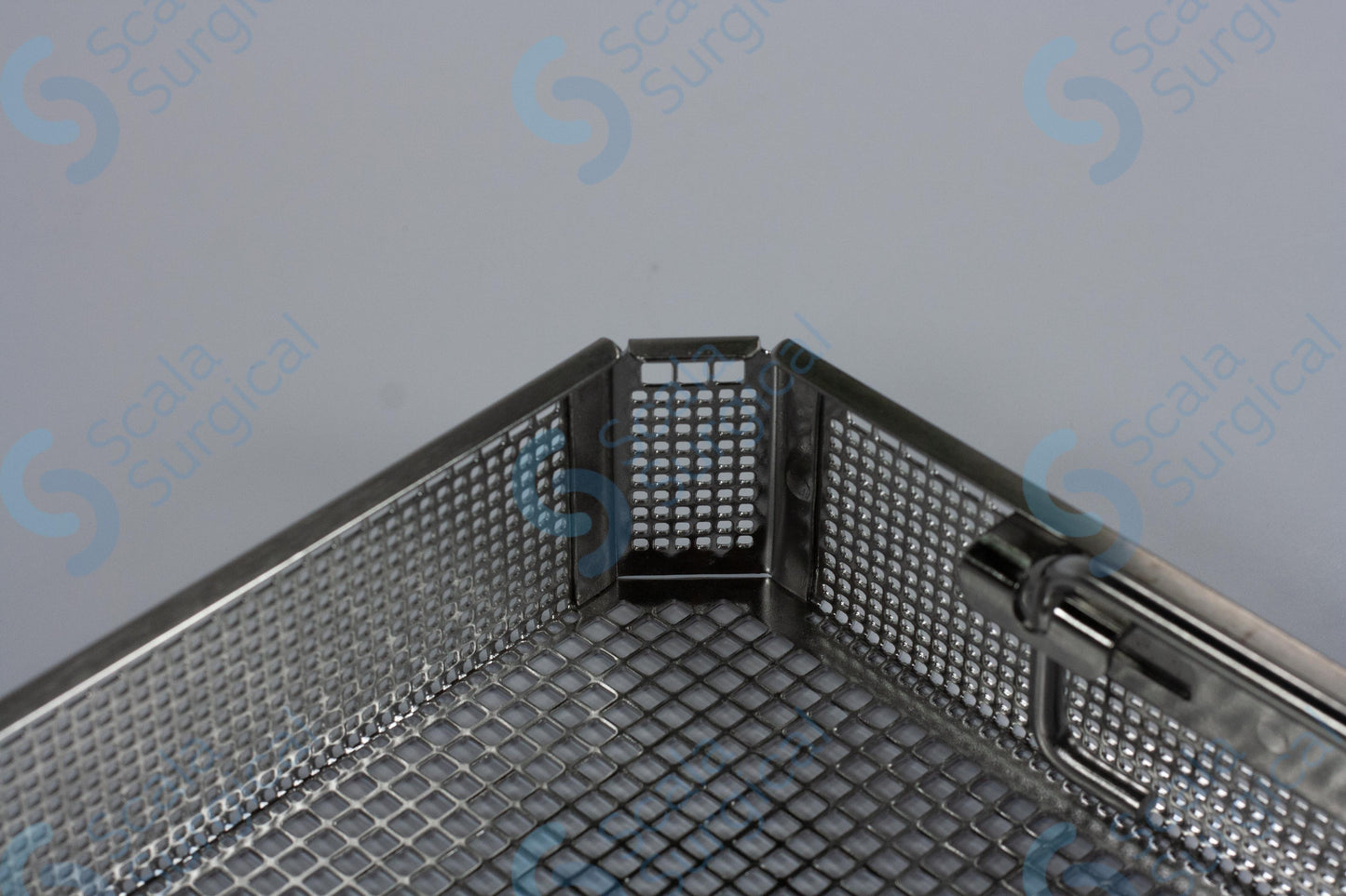 A pressed metal basket without feet is used to store and transport surgical instruments. It is made of stainless steel, has holes punched into it to allow easy draining of liquid and optimal drying.