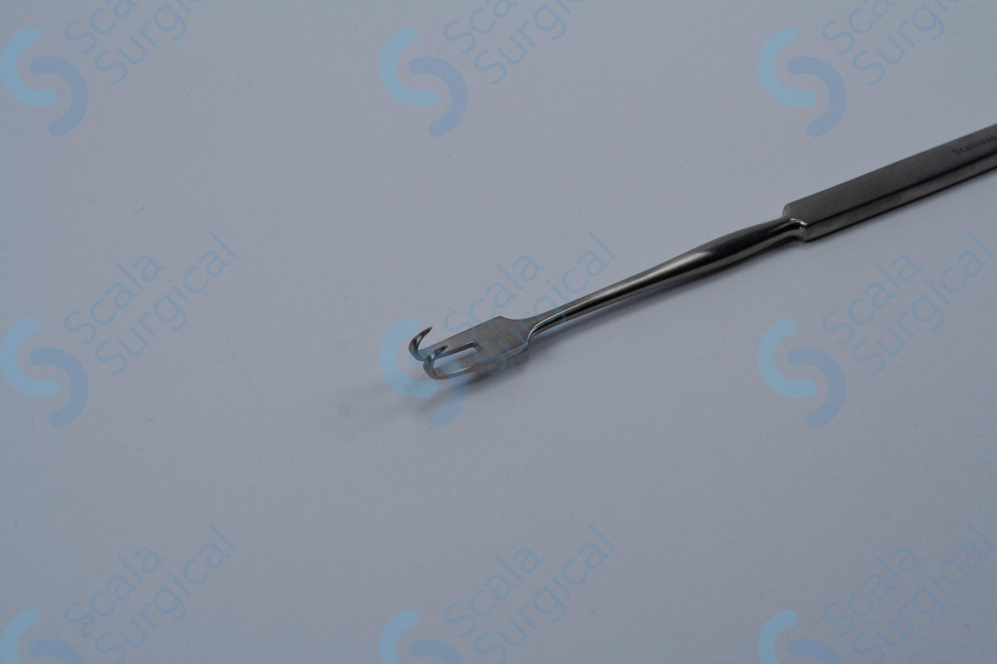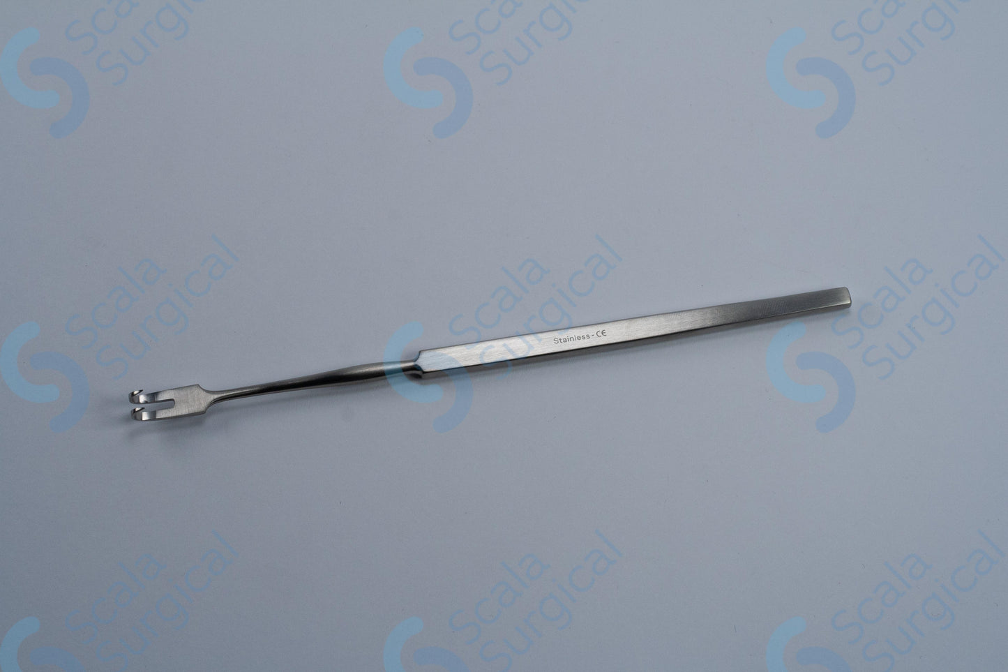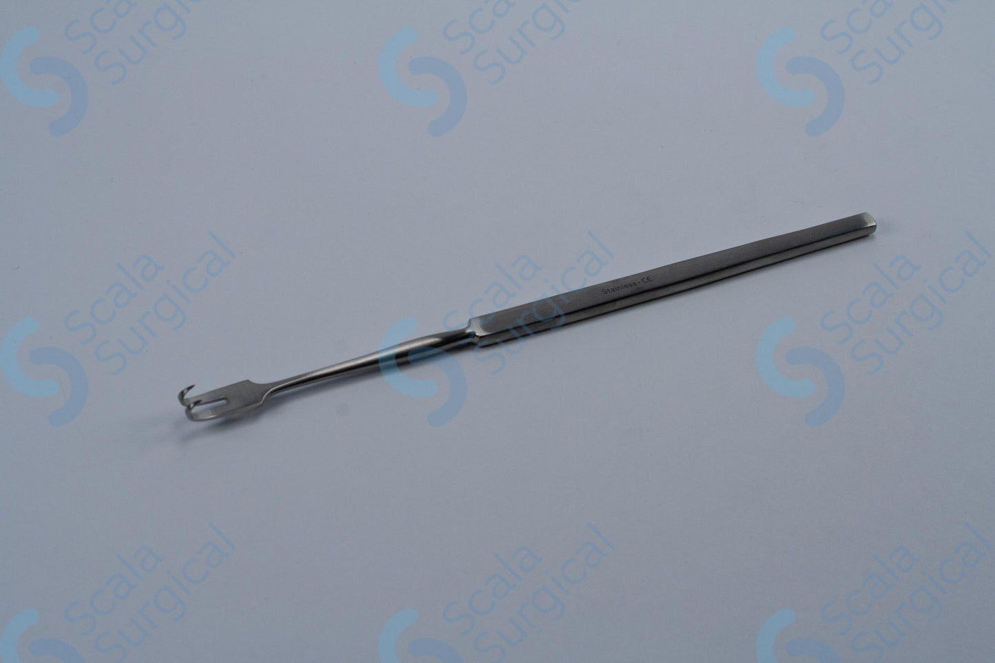 A hook retractor with two sharp prongs is a surgical instrument typically used to hold back tissue or organs during a medical procedure. It can be used to separate and hold the edges of a wound apart, allowing a surgeon to have an unobstructed view of the area.