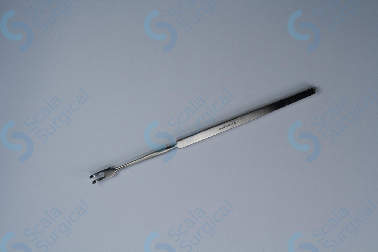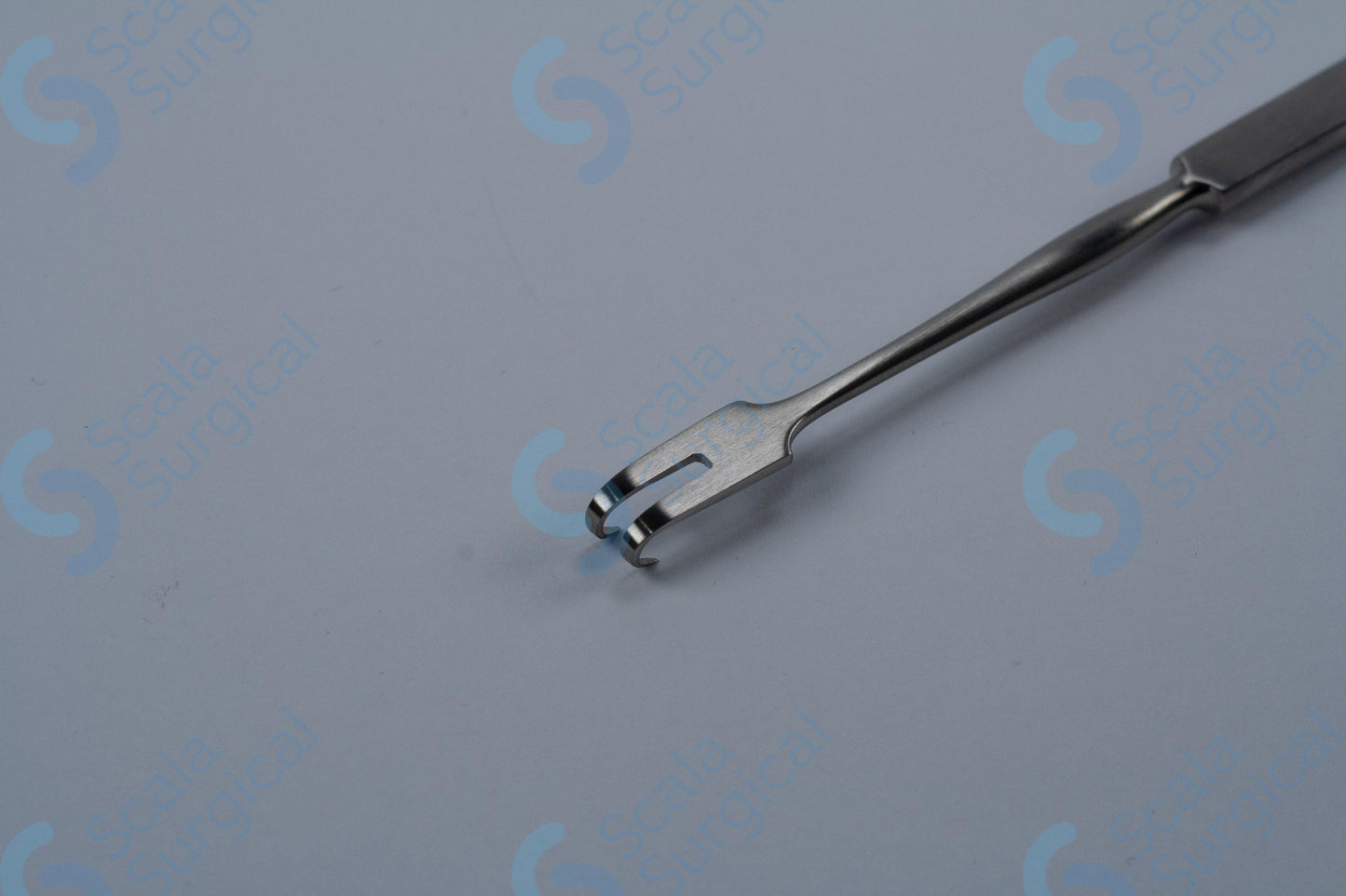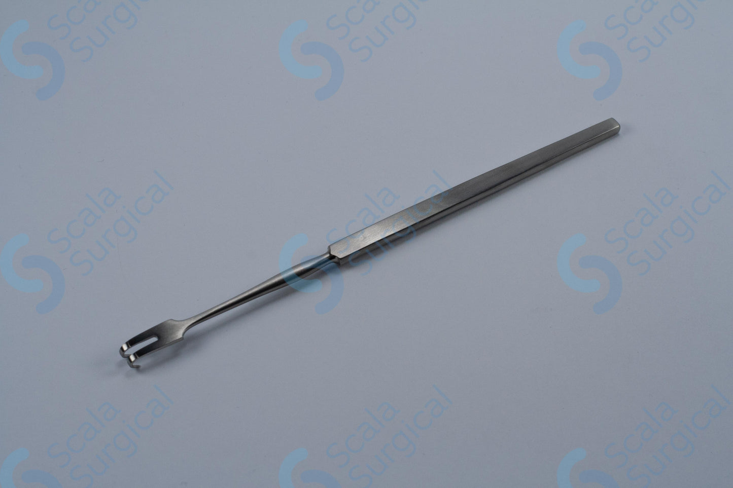 A hook retractor with two sharp prongs is a surgical instrument typically used to hold back tissue or organs during a medical procedure. It can be used to separate and hold the edges of a wound apart, allowing a surgeon to have an unobstructed view of the area.