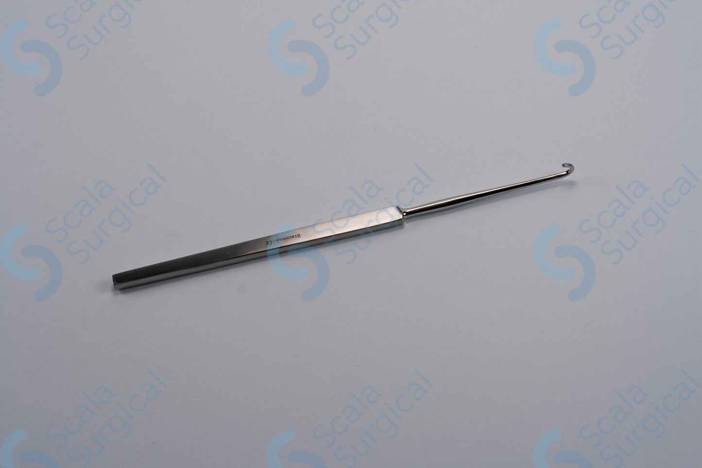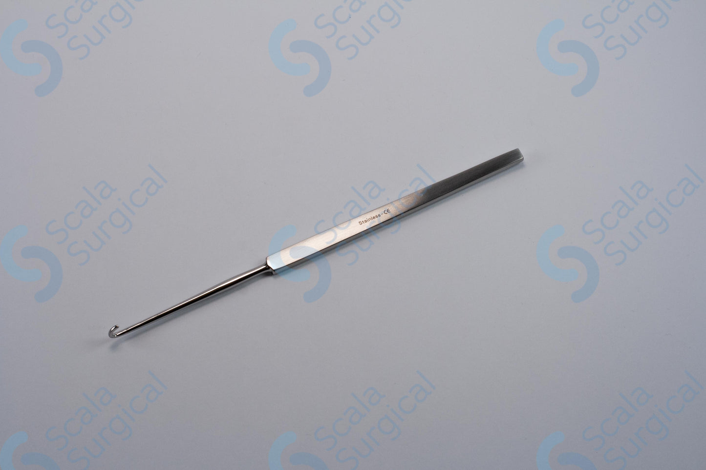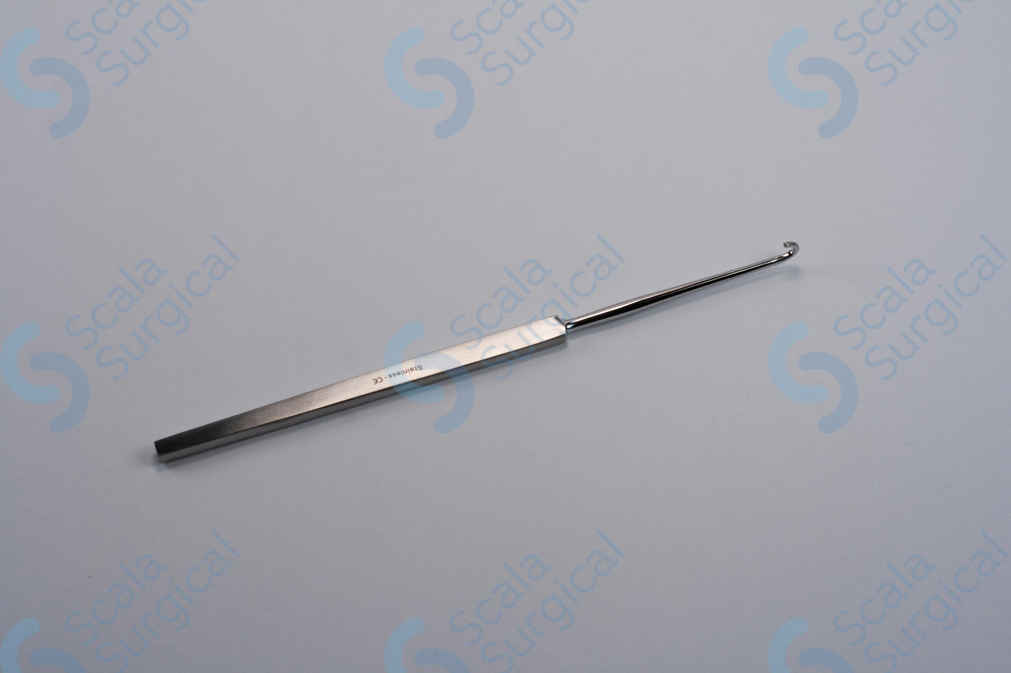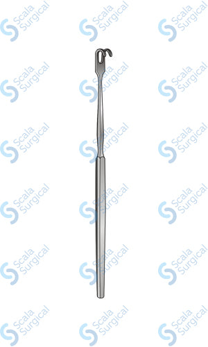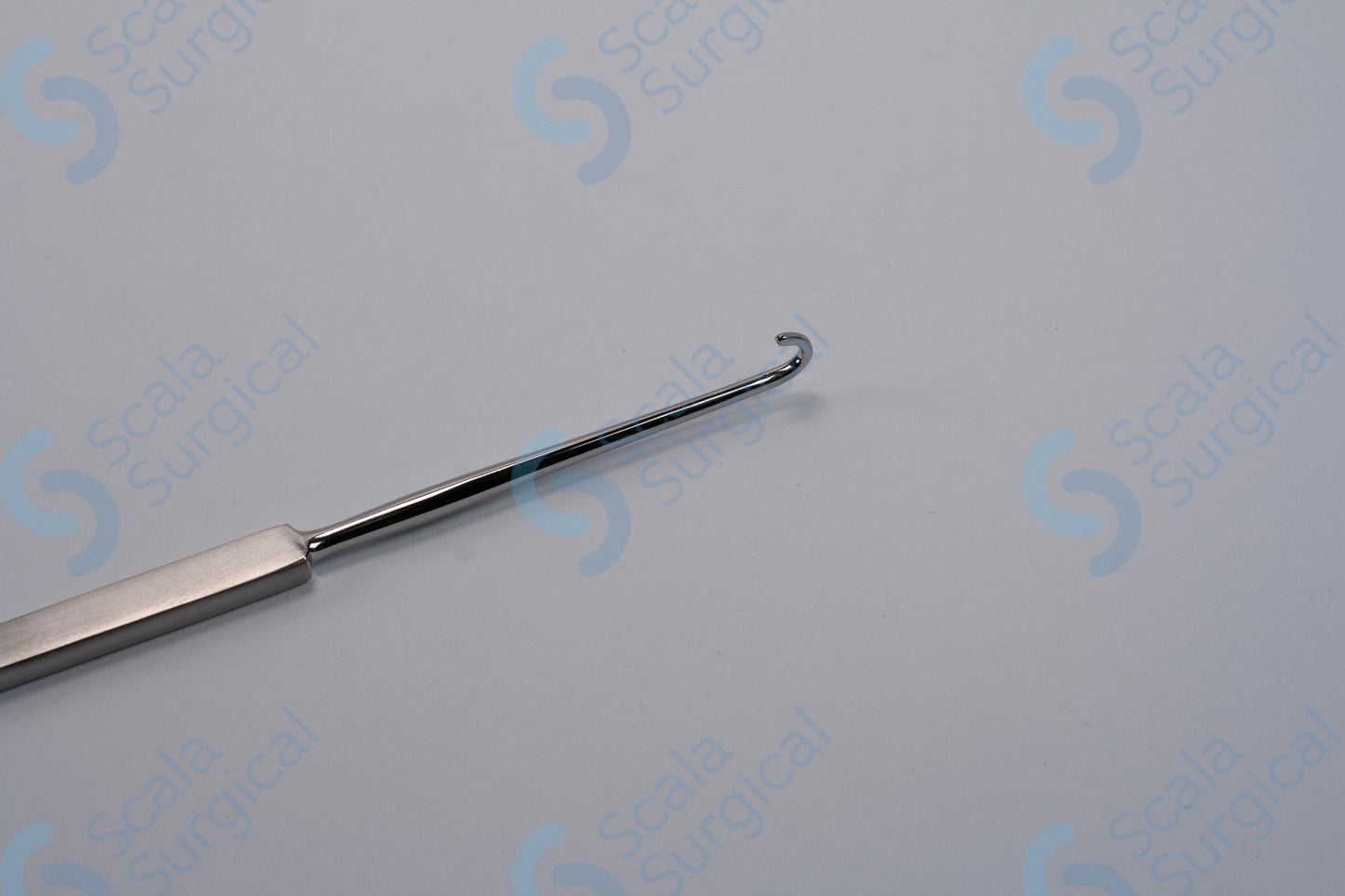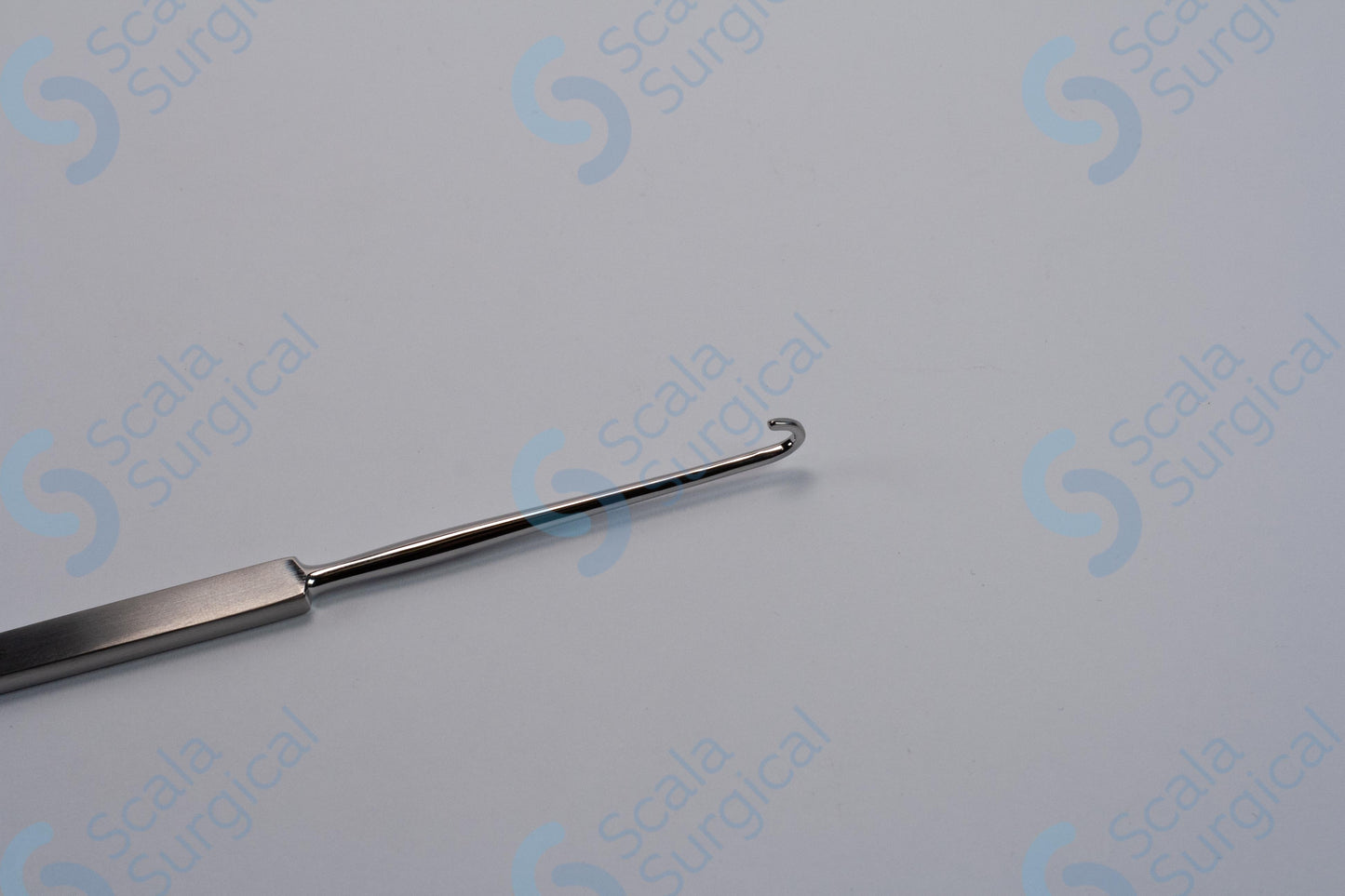 A hook retractor with one prong and a blunt end is used in surgical procedures to hold tissue and organs away from the surgical area to provide better access. It is commonly used in abdominal and thoracic surgeries.