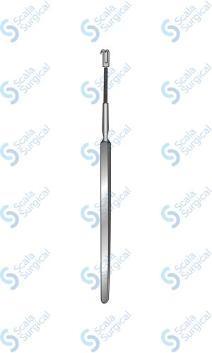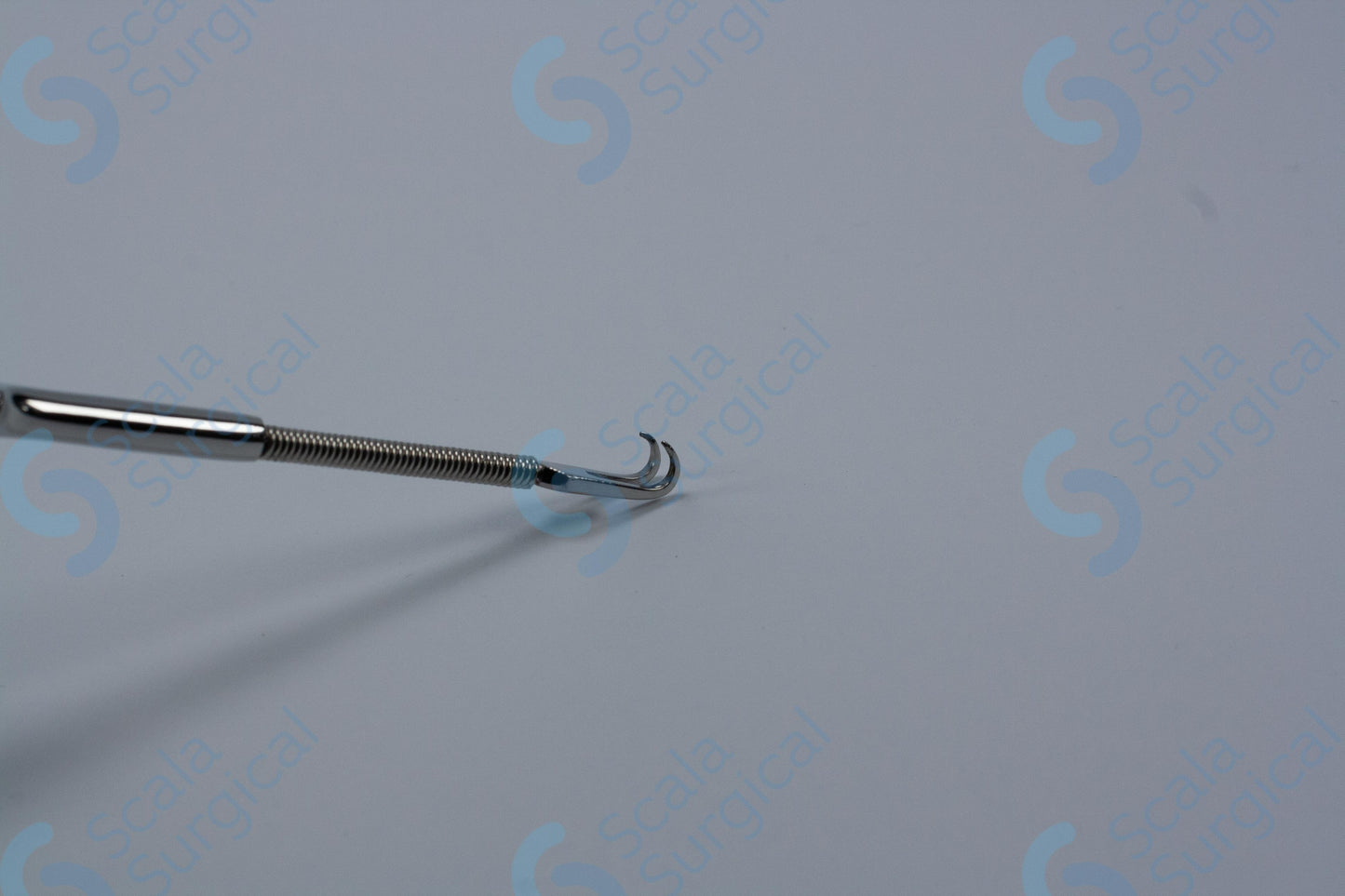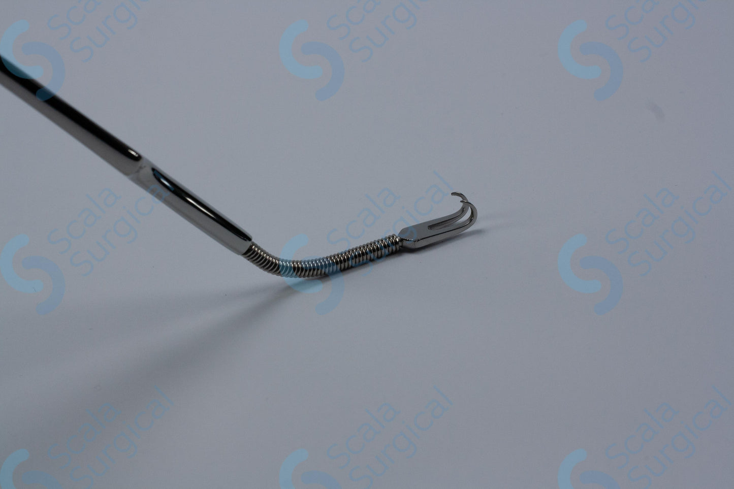 A hook retractor with a flexible shaft and two sharp prongs is used in surgery to gently spread tissue apart in order to access underlying structures. It is typically used in minimally invasive procedures such as laparoscopy.