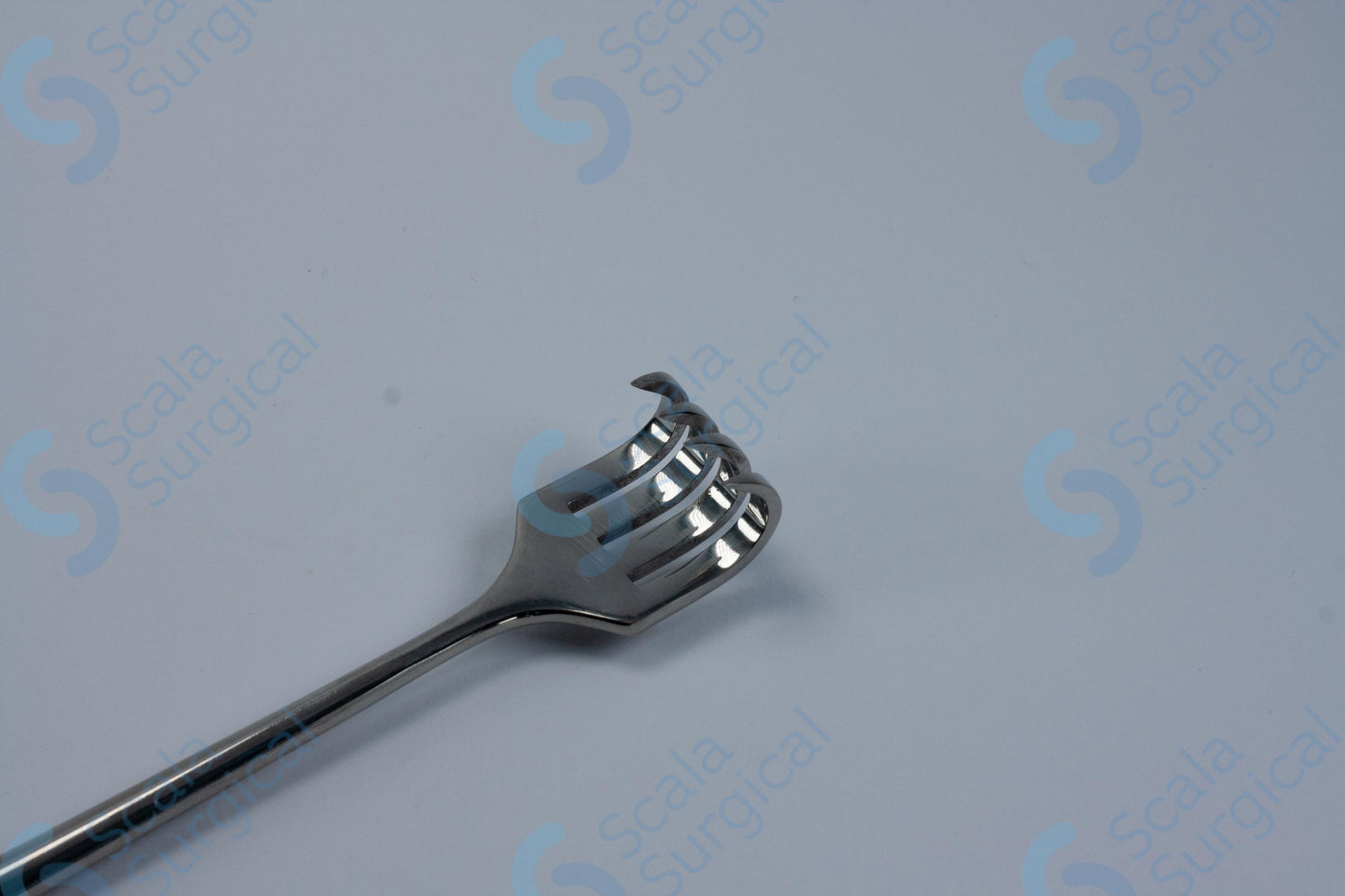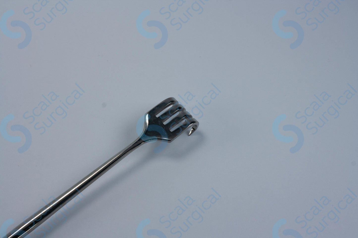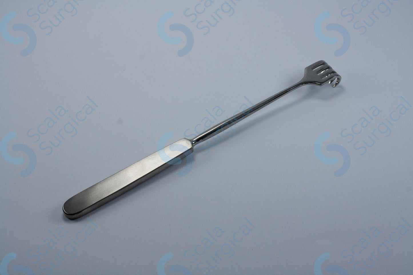 The Lempert Retractor is a surgical instrument used to hold back tissues or organs to expose a specific area of the body during surgery. It is typically used during abdominal, thoracic, or cardiac procedures. The 4 sharp prongs of the retractor are designed to firmly hold back tissues and the blade width of 22mm (241.3mm or 9? inch) allows for a wide range of retraction.