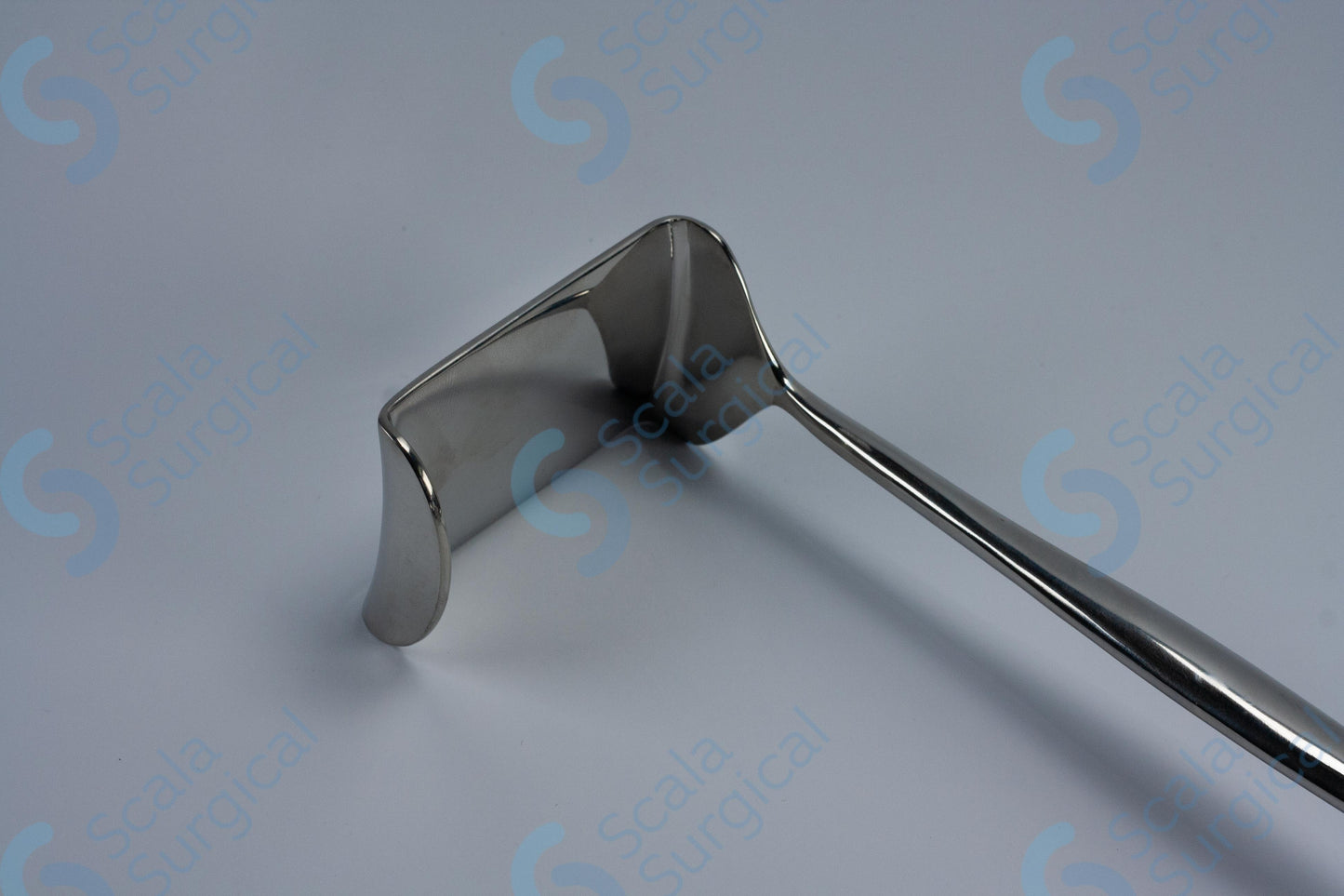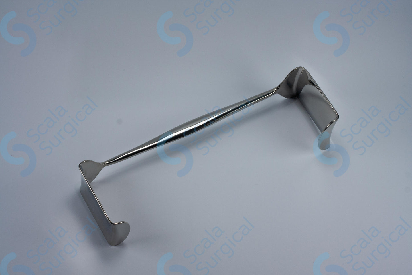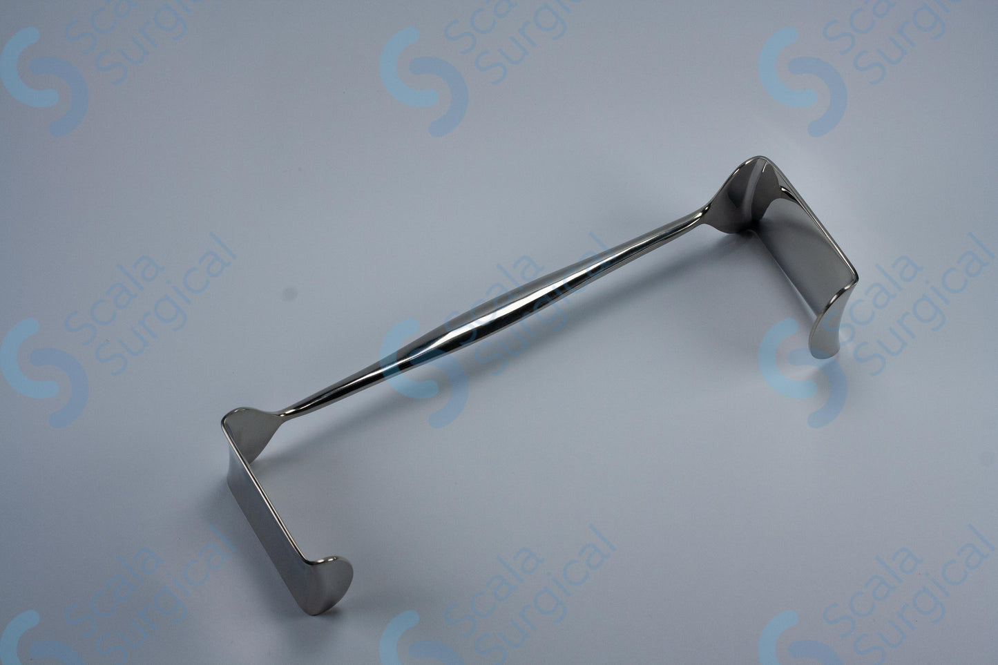 The Morris Retractor is a surgical instrument used to separate and hold back tissue during a surgical procedure. It has two ends with different blade widths and depths, allowing the surgeon to access different areas of the body.