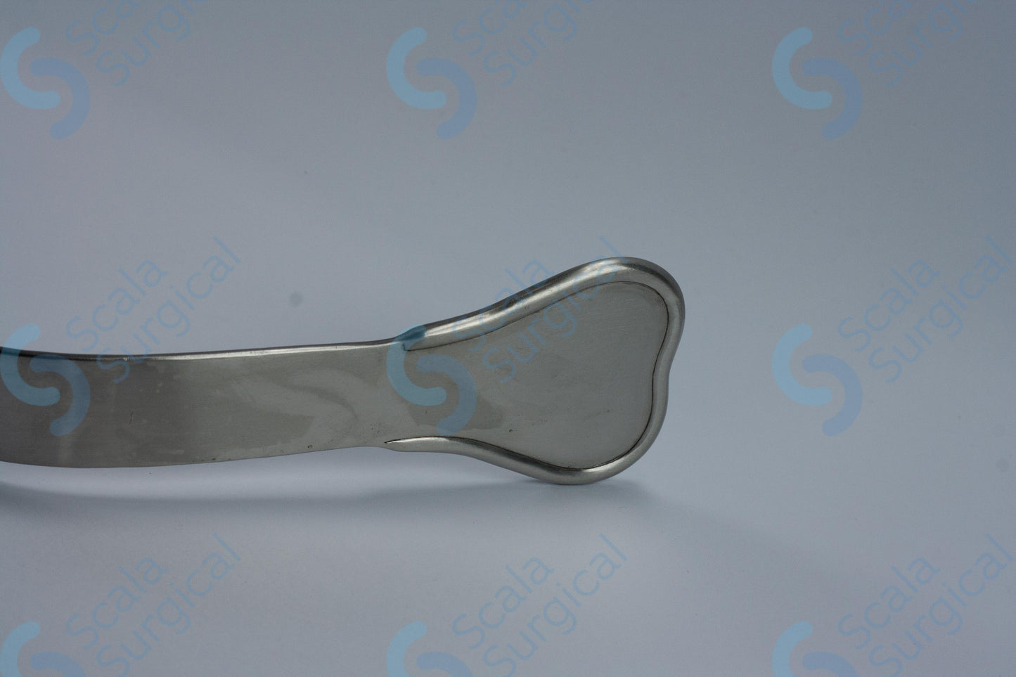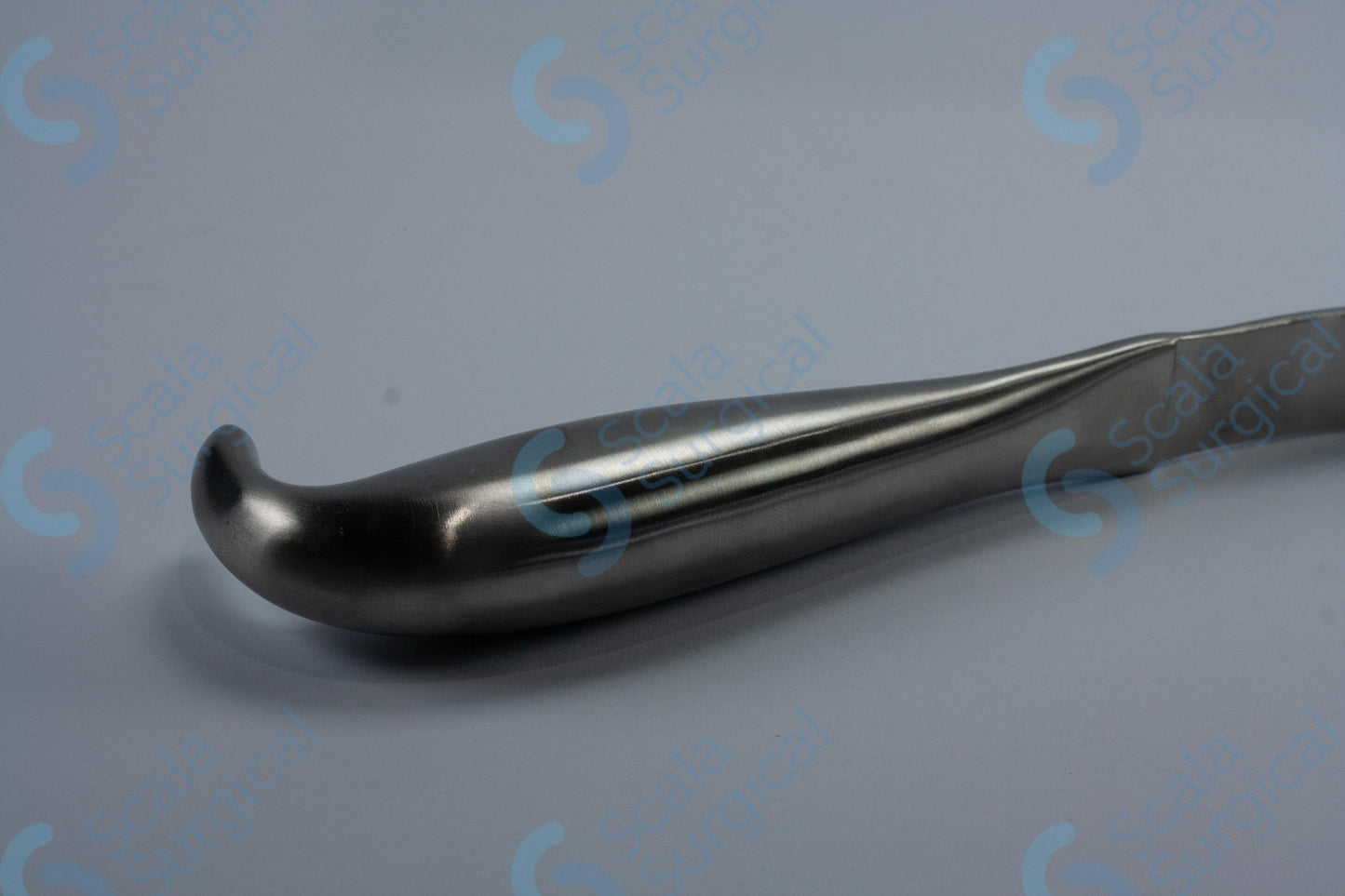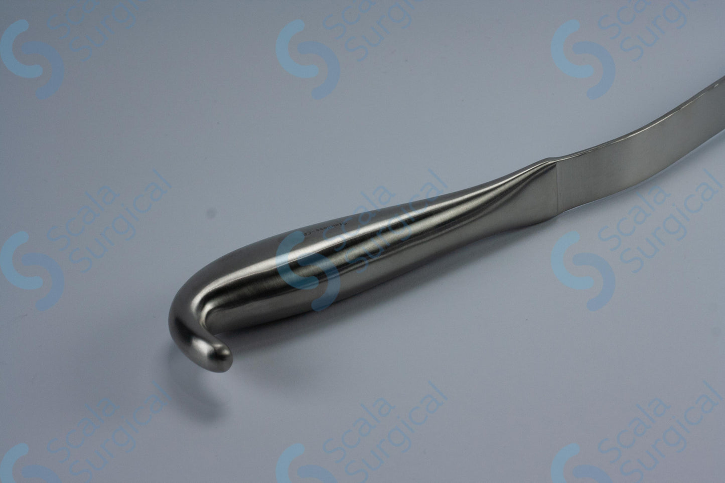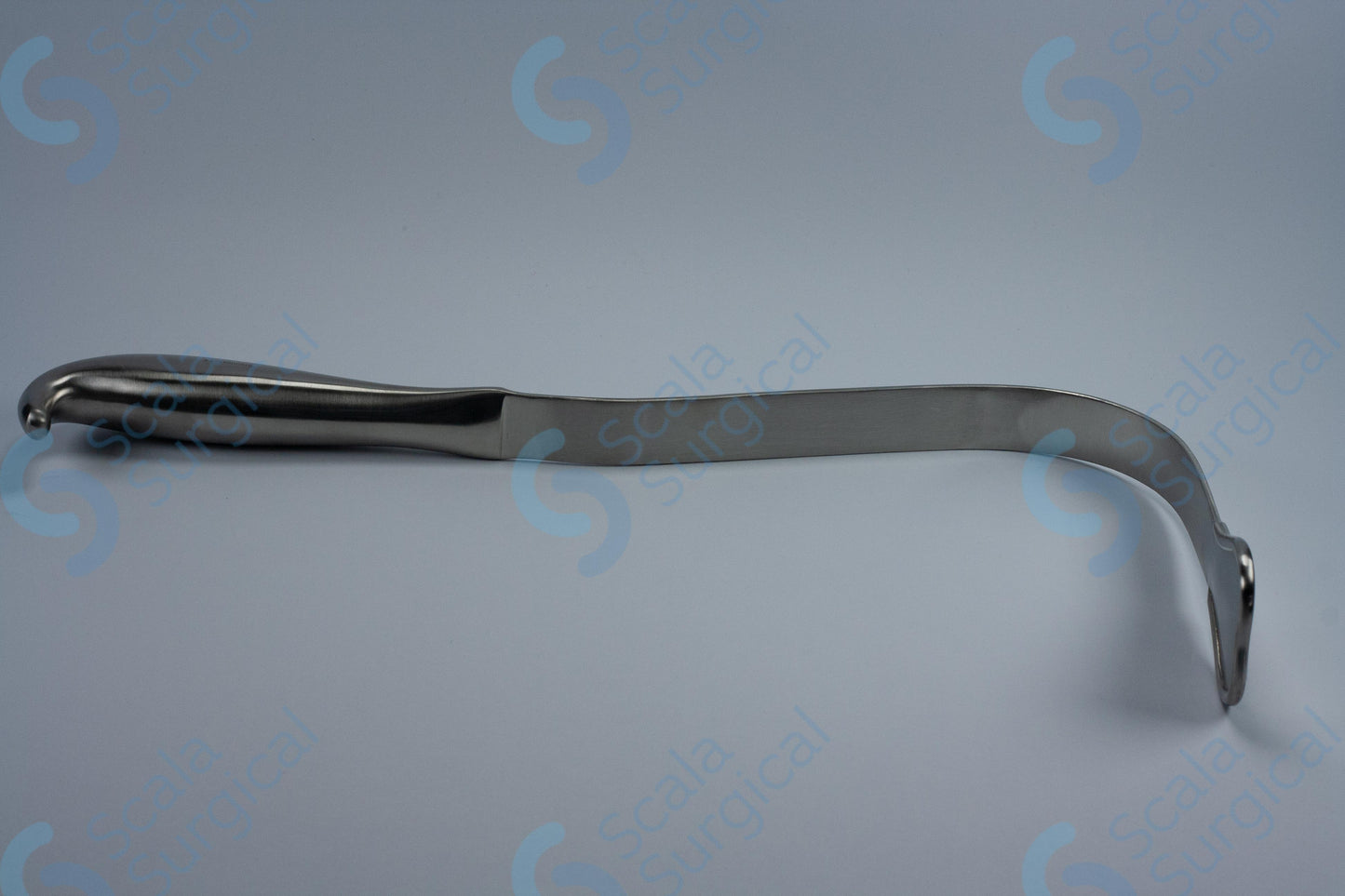 The Harrington Retractor is a surgical instrument used to hold back tissue or organs in order to provide an unobstructed view of the surgical site. It is typically used during abdominal and thoracic surgery. The small size of this particular retractor indicates that it is designed for use in smaller surgical sites.