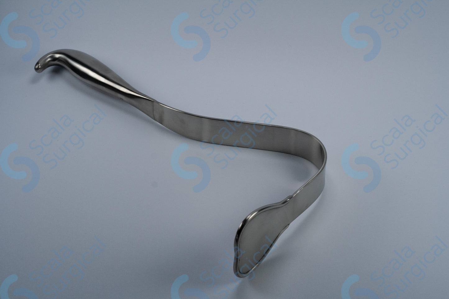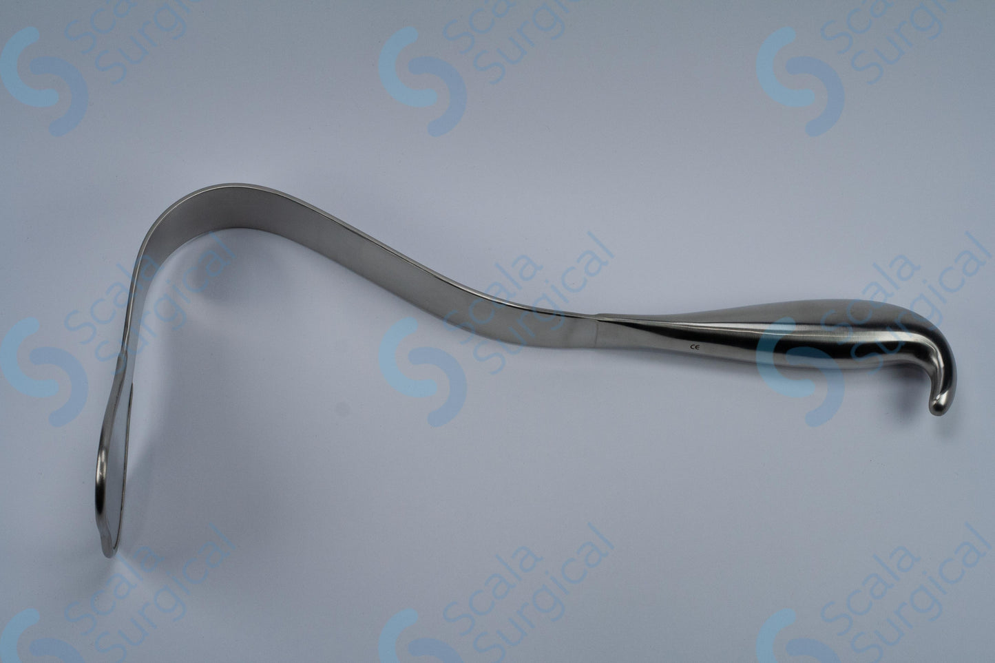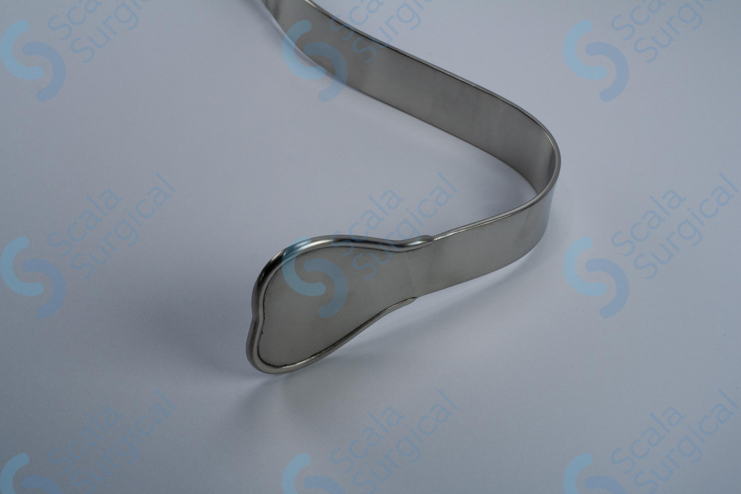 The Harrington Retractor is a surgical tool used to hold tissue apart during an operation. It has two flat blades with a handle at one end. The blades are hinged together, allowing them to move apart and hold open a wide area of tissue. The large size of this particular retractor has an end of blade width of 64mm and a total length of 304.8mm (12 inches).