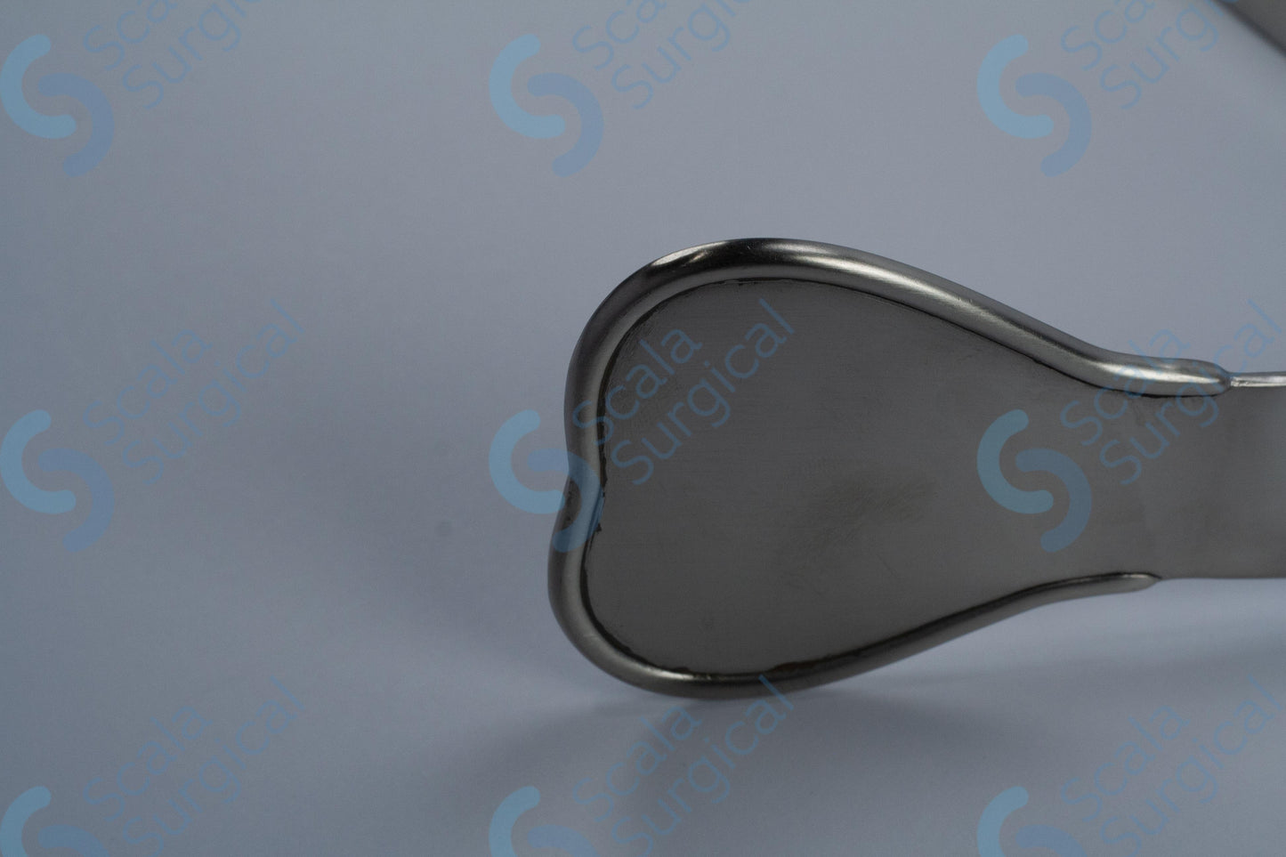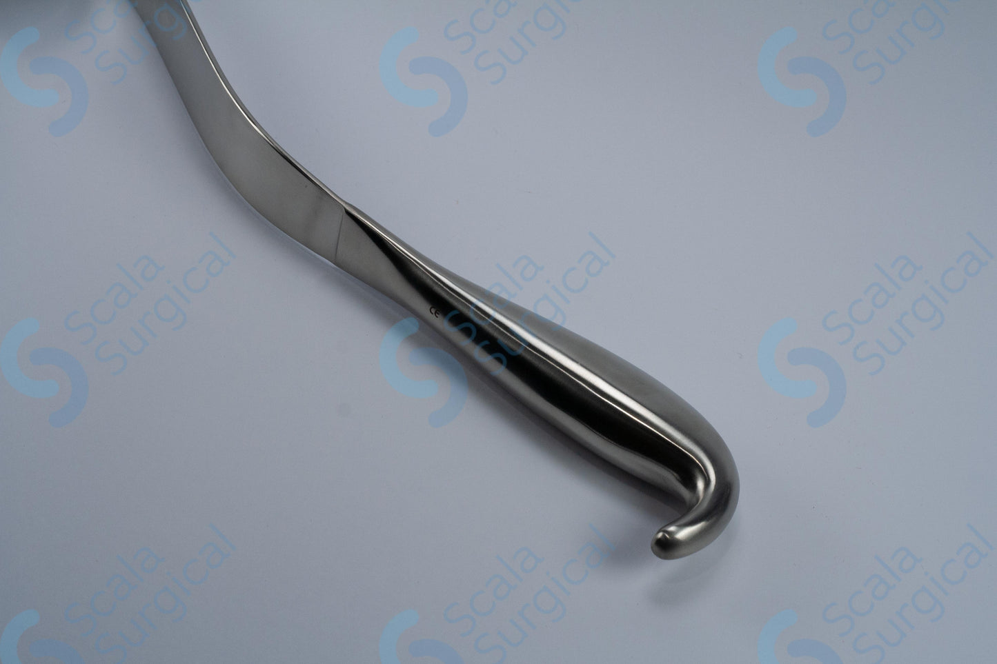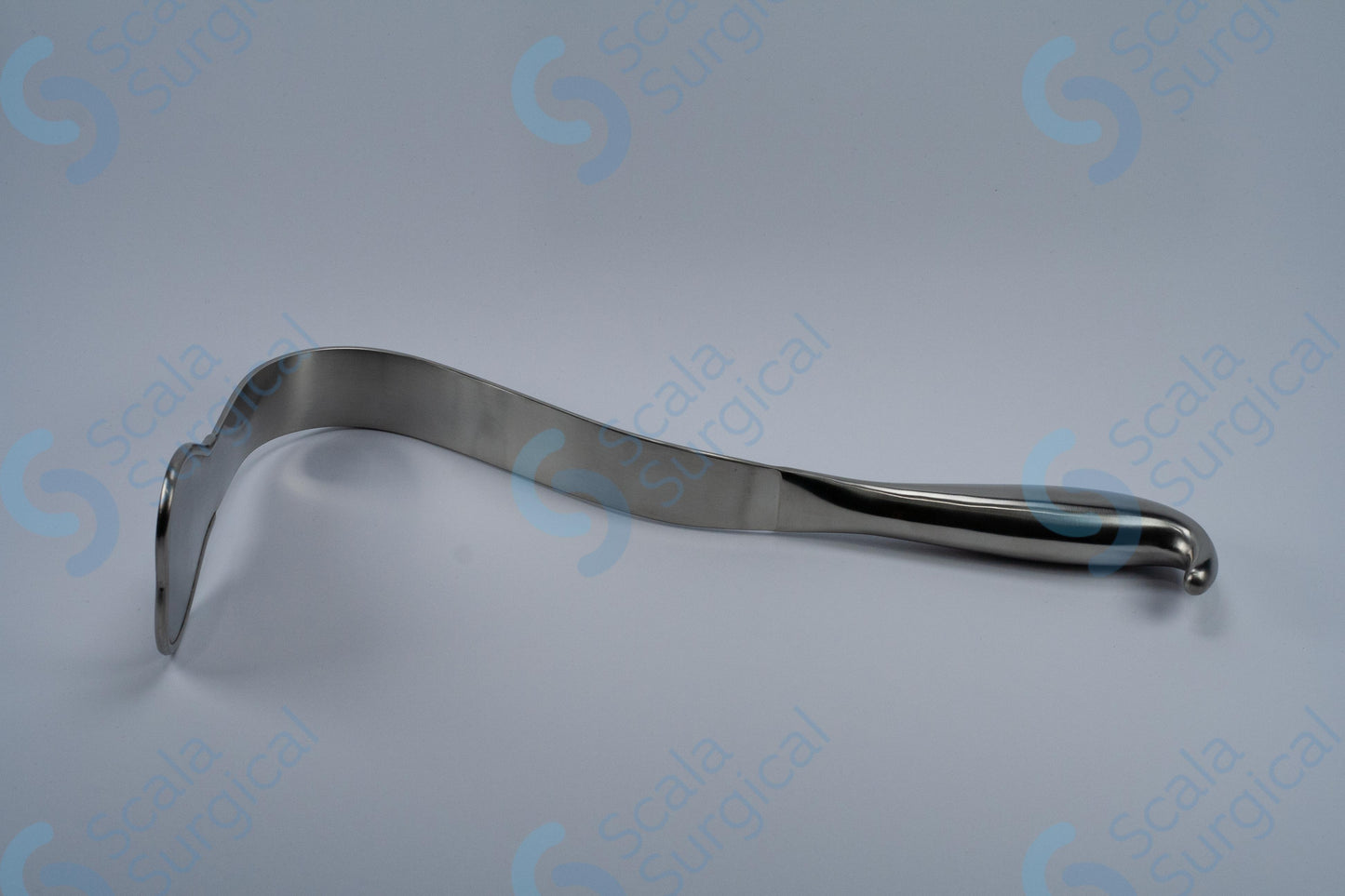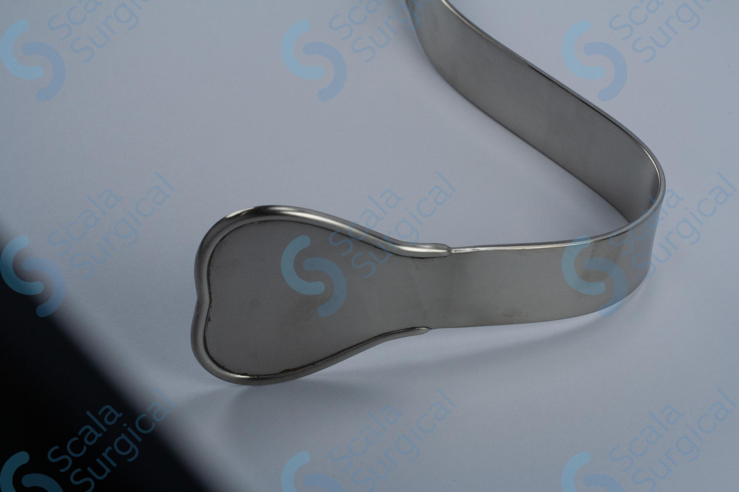 The Harrington Retractor is a surgical tool used to hold tissue apart during an operation. It has two flat blades with a handle at one end. The blades are hinged together, allowing them to move apart and hold open a wide area of tissue. The large size of this particular retractor has an end of blade width of 64mm and a total length of 304.8mm (12 inches).