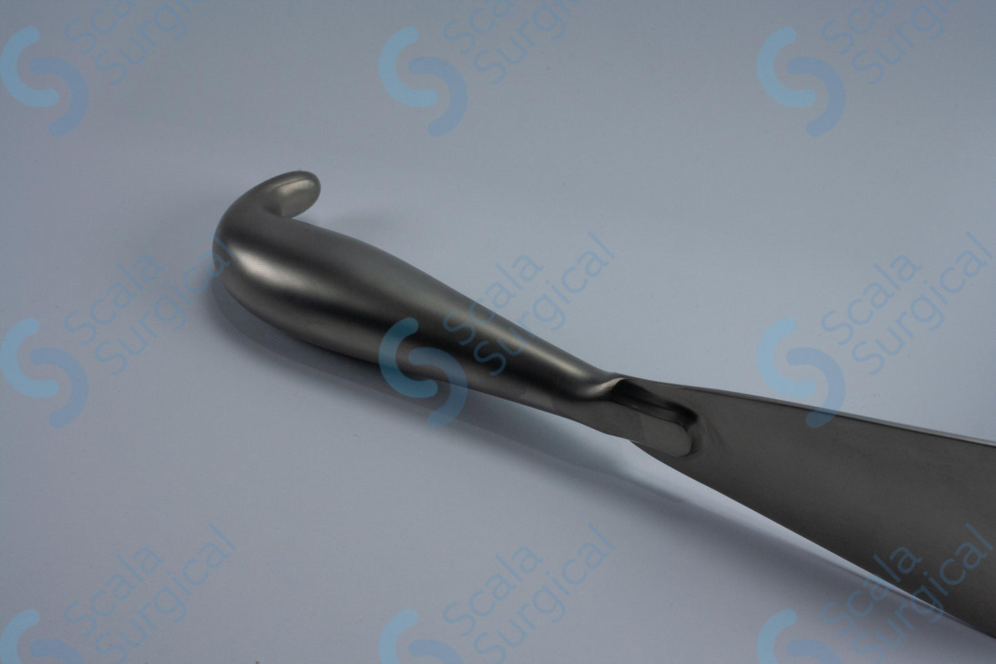 The Pyrah Retractor Medium is a surgical instrument used to spread apart and hold open tissue during a surgical procedure. It is used to provide access to the surgical site and to keep the tissue out of the way during the procedure.
