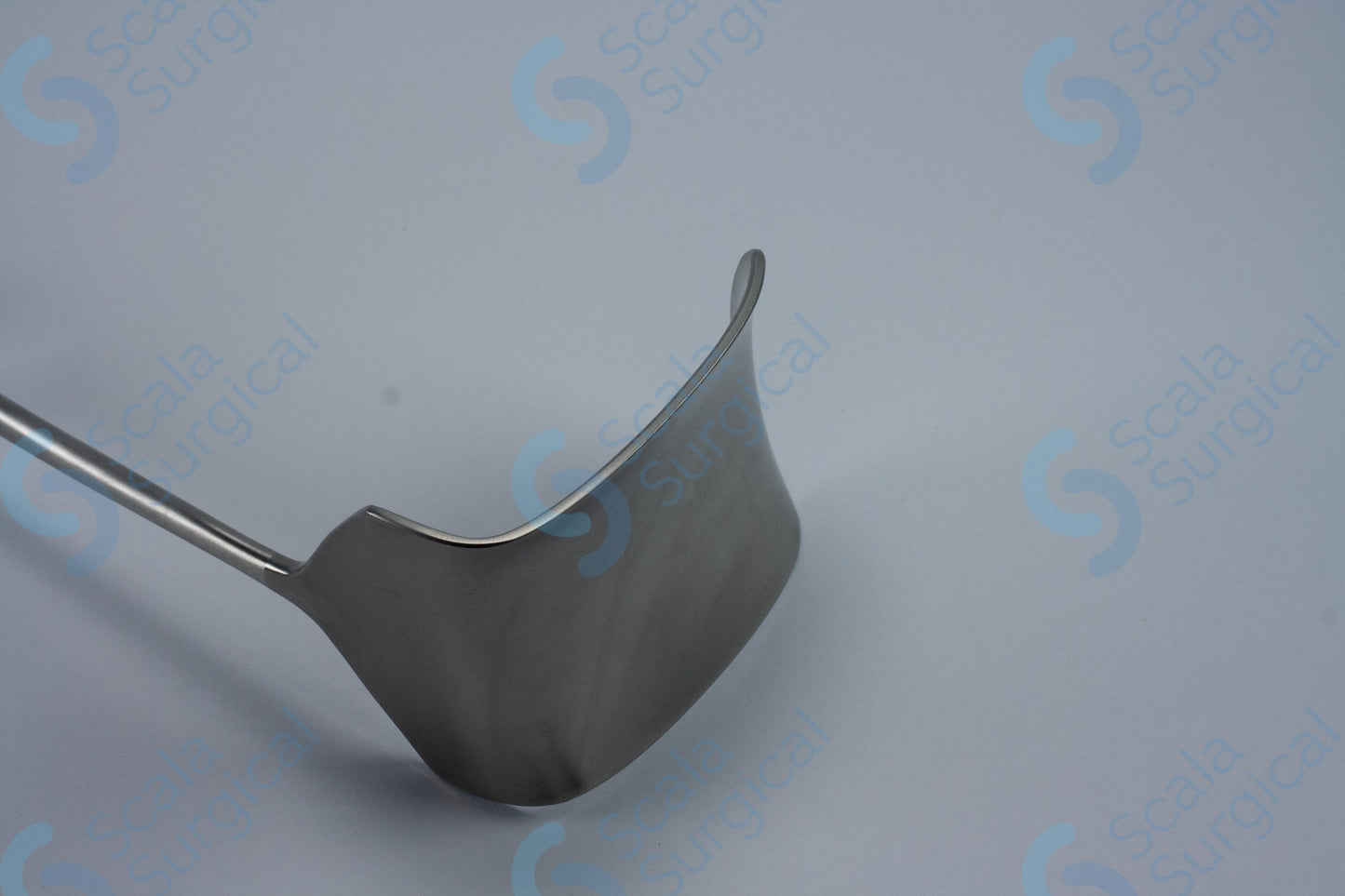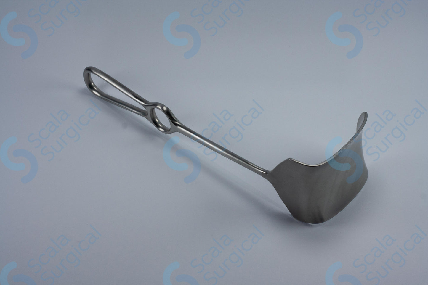 This Kocher Abdominal Retractor is used to hold open the abdominal wall during surgical procedures. It features a single-ended finger ring handle and a blade with an 80 x 60mm size. This retractor is used to provide access for surgical instruments and to improve visualization of the surgical field.