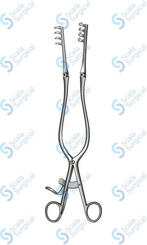 This item is a Beckmann Lamin SelfRet Retractor, which is used in surgical procedures to hold back tissue in order to expose an area of the body for surgery. The 4 x 4 prongs are 180 mm long and 317.5 mm wide.