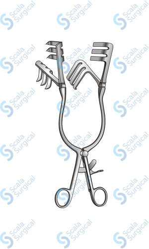 This item is used to spread apart the layers of tissue during a laminectomy, which is a surgical procedure to remove a portion of the vertebrae in order to relieve pressure on the spinal cord or nerves. The hinged arms and 3 x 3 prongs allow for a larger area to be spread apart, and the 11 inch size allows the surgeon to access deeper layers of tissue.