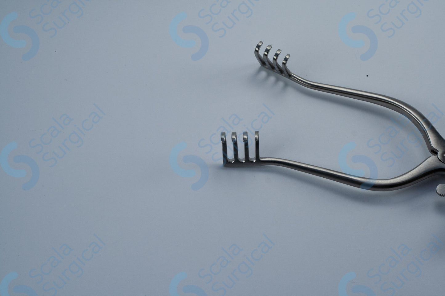 This item is a surgical retractor. It is used to hold back tissue and organs during surgery so that the surgeon has a clear view of the surgical site. It has four prongs that are blunt and are designed to prevent damage to the tissue and organs. The retractor is 177.8mm (7 inches) long.