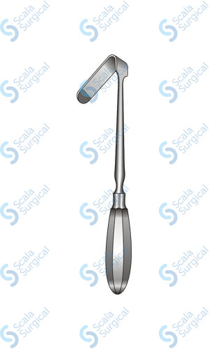 The Jackson Burrows Knee Retractor Angled is a surgical instrument used to hold back soft tissue during a knee surgery. Its angled blade design allows for easy access to the knee joint, and the 20mm width provides a secure grip on the tissue.