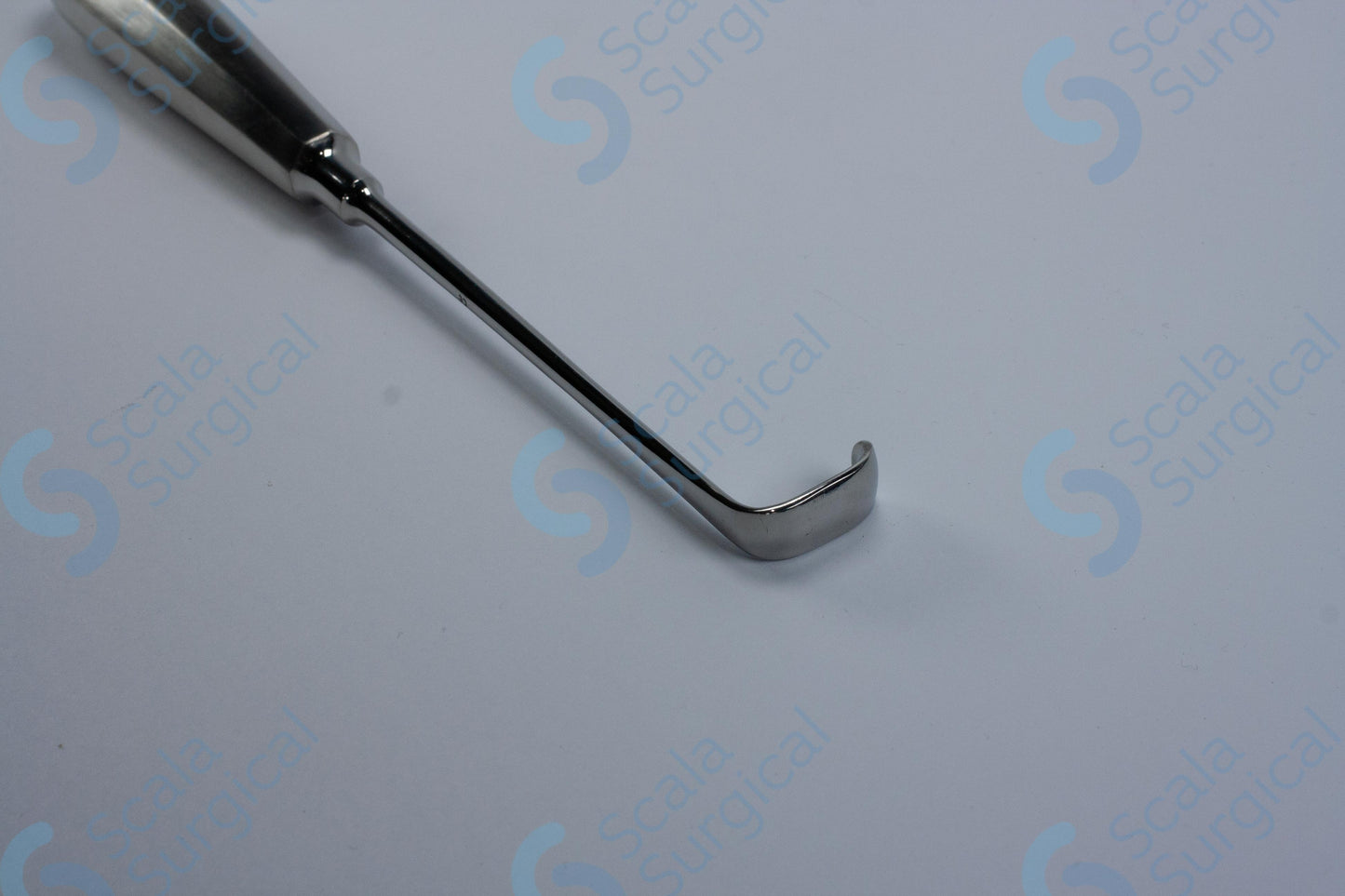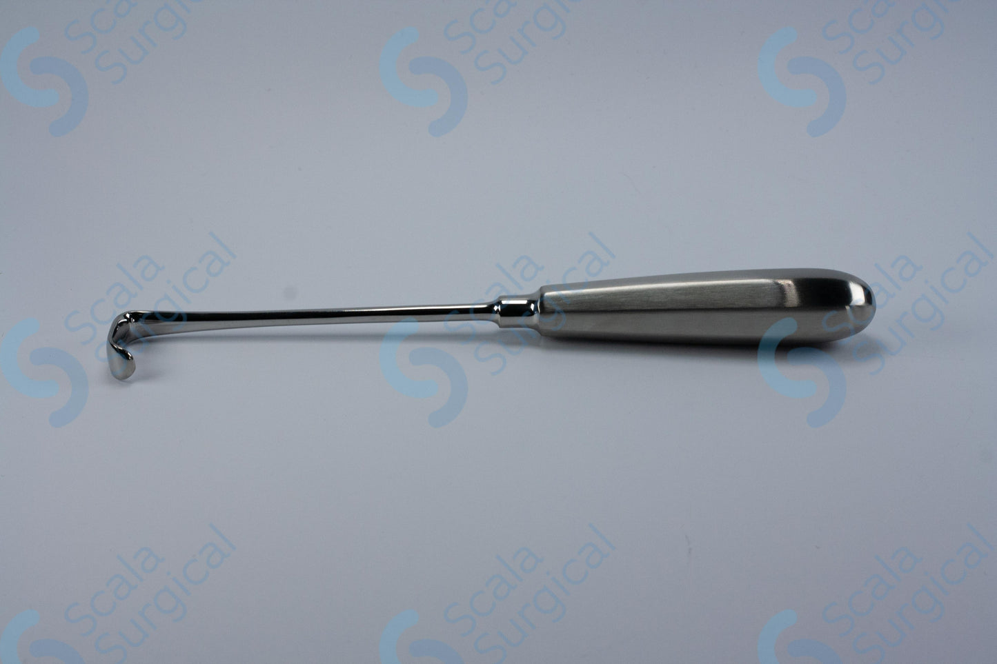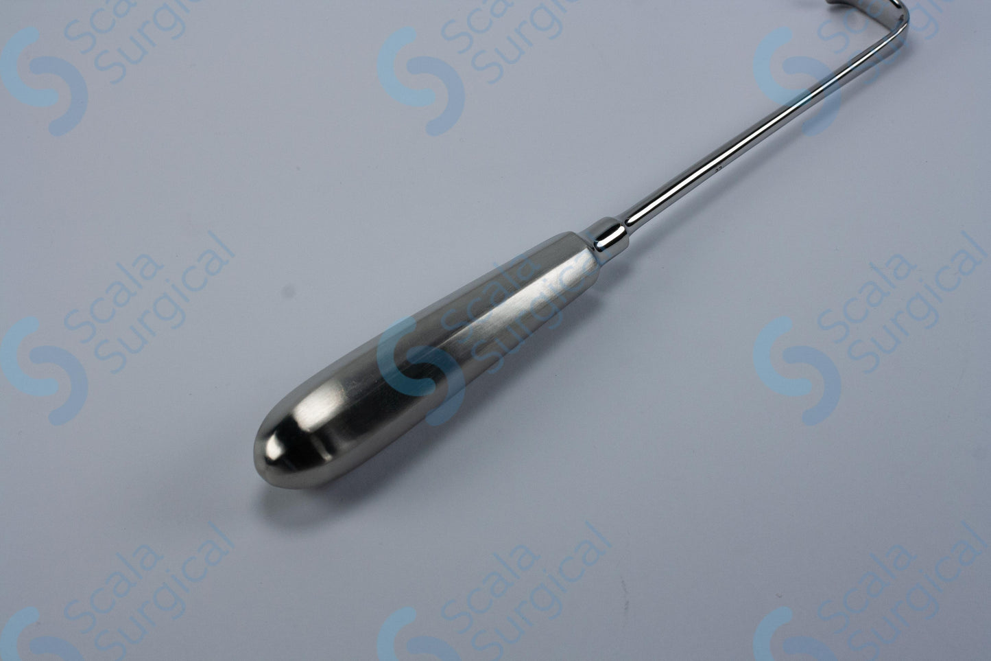 The Langenbeck Retractor is a surgical instrument used to hold back or retract tissue during a surgical procedure. It has a hollow handle and a round blade with a width of 13 mm and a depth of 45 mm (8? inch). It is used to expose and provide access to a surgical site.