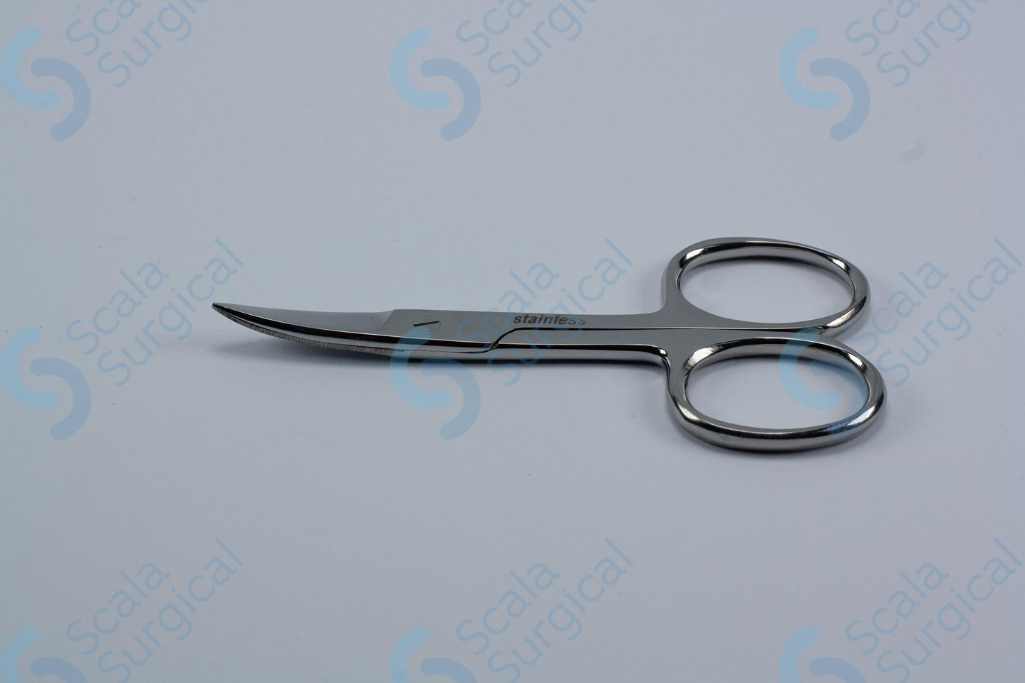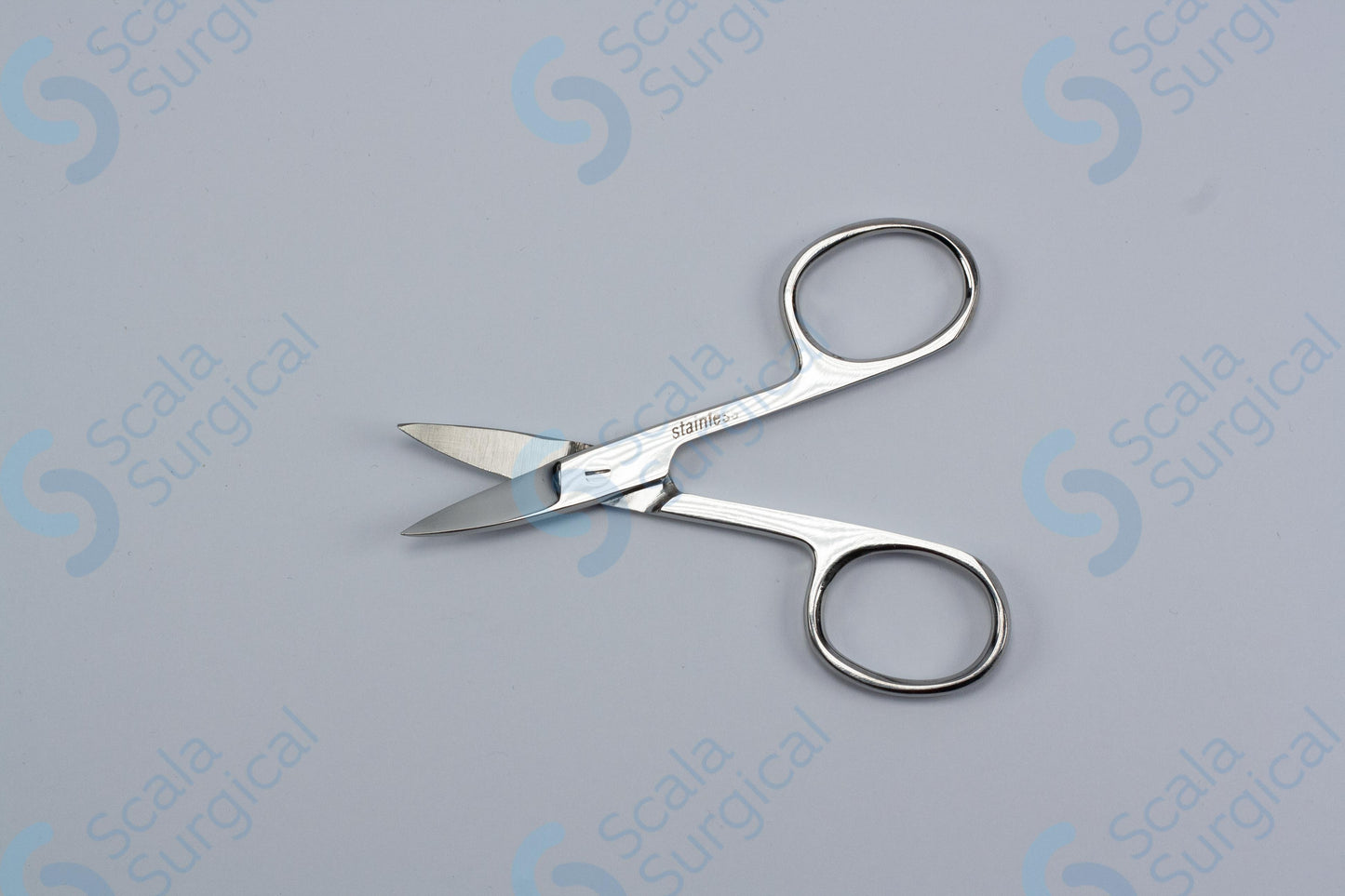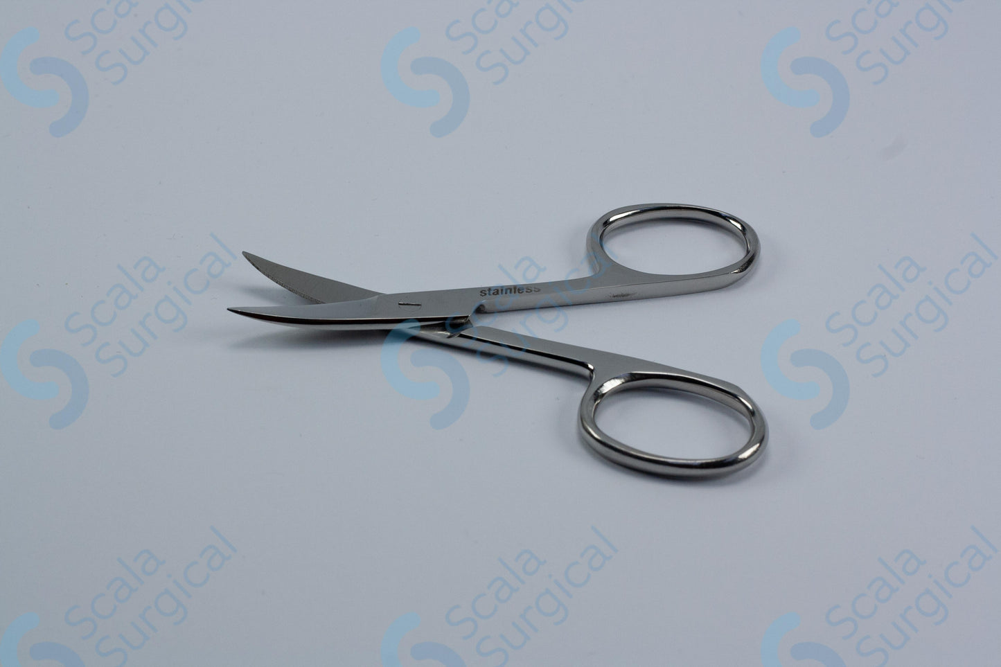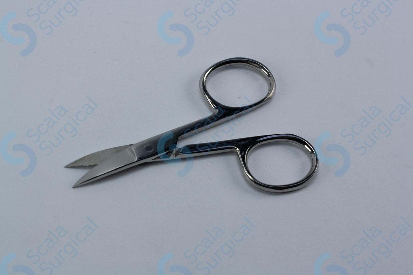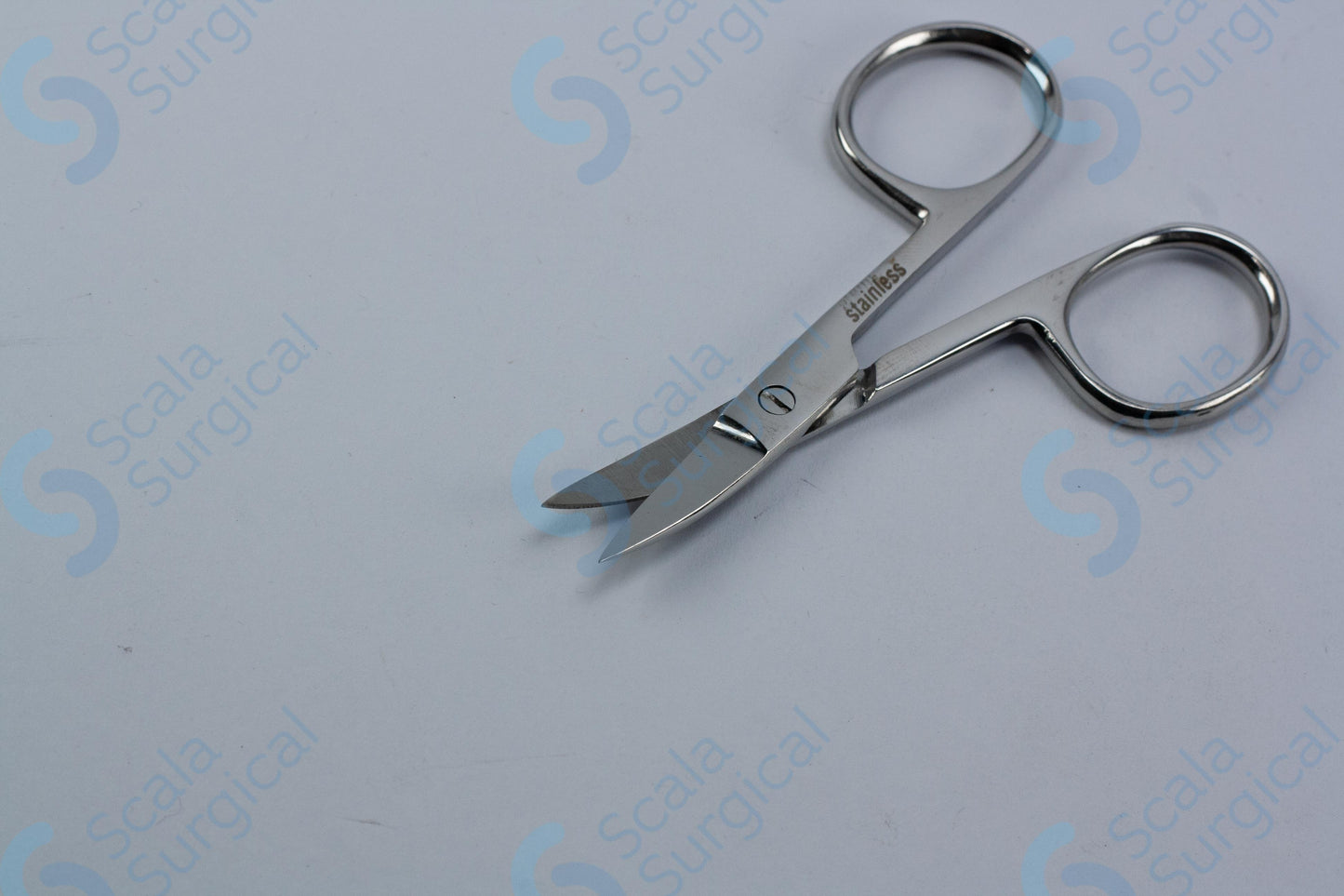 Nail scissors curved (88.9mm) (3? inch) are used in the surgical field for trimming and cutting nails. They are typically used to trim and shape fingernails and toenails before and after surgery. They are also used to trim away excess skin and cut away bandages.