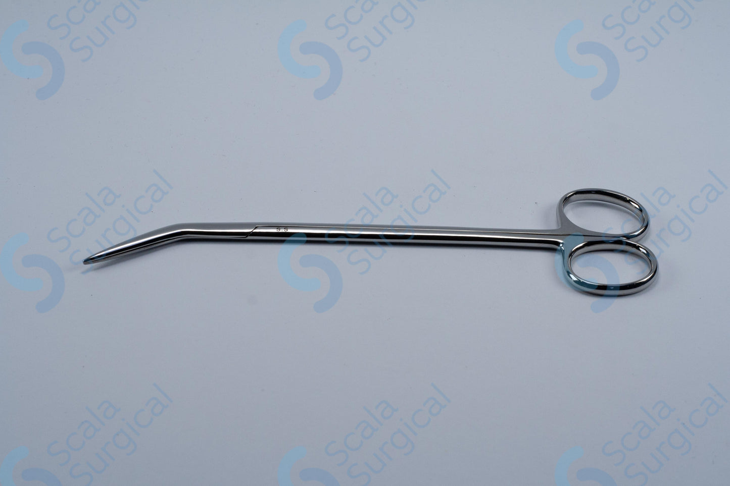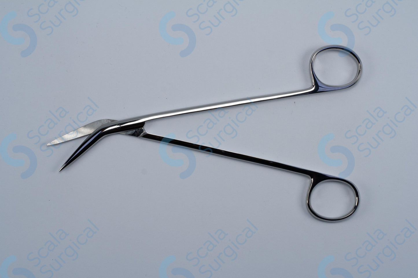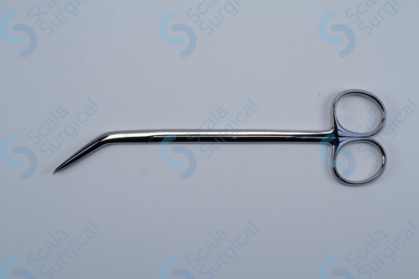 Fickling Oral Scissors Angled to Side (177.8mm) (7 inch) are used in the surgical field to cut through soft tissue in the oral cavity, such as the tongue or cheeks. They are angled to the side to allow for better access to the area being cut.