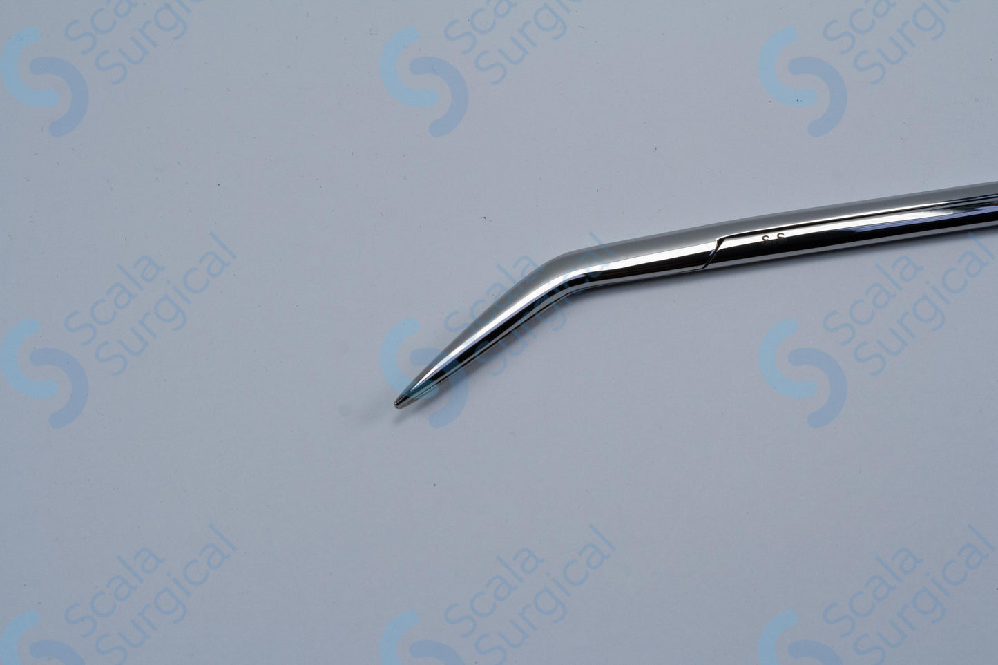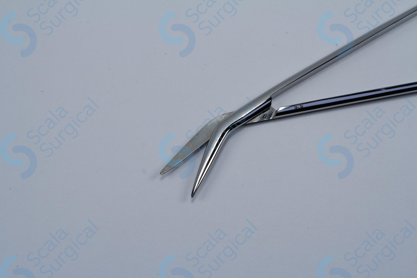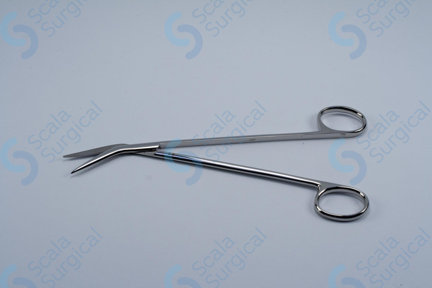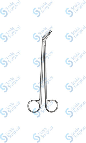Fickling Oral Scissors Angled to Side (177.8mm) (7 inch) are used in the surgical field to cut through soft tissue in the oral cavity, such as the tongue or cheeks. They are angled to the side to allow for better access to the area being cut.