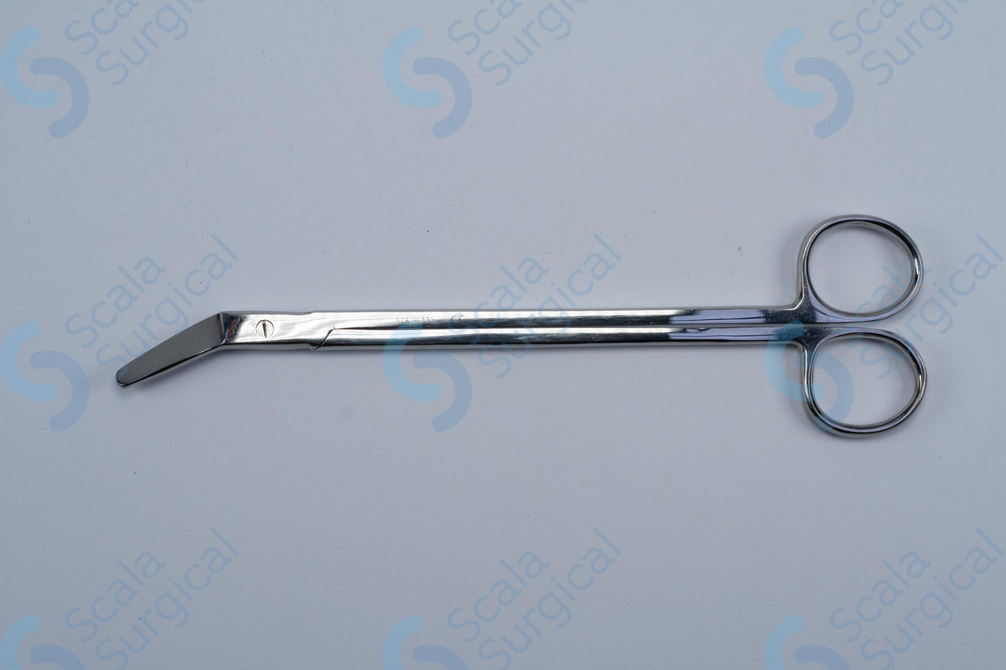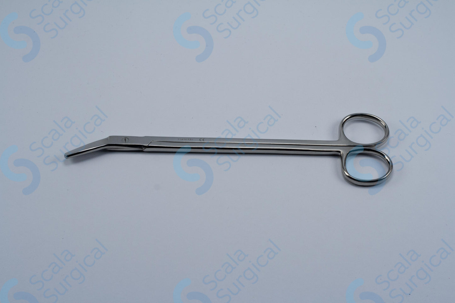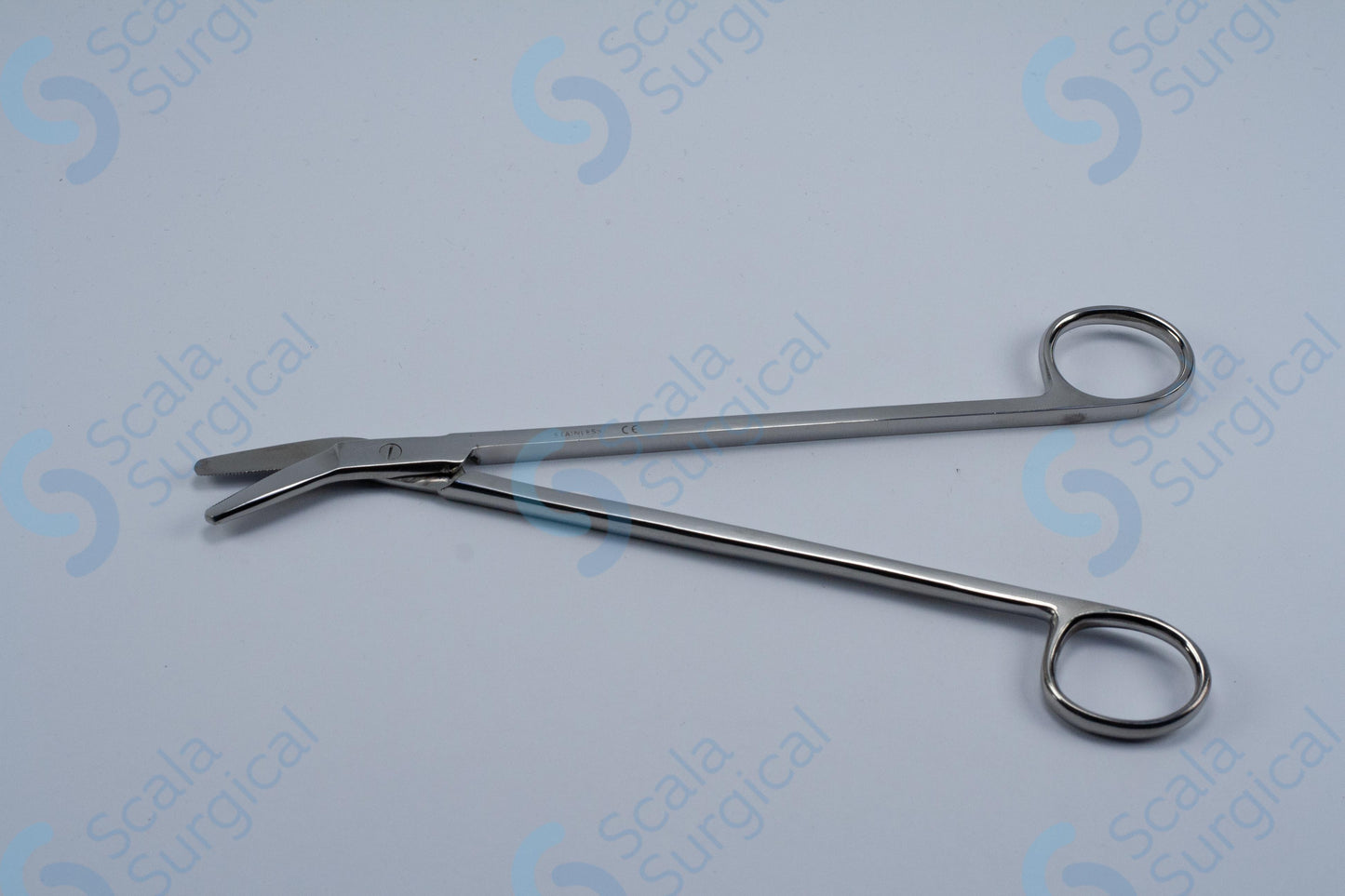 Mitchel Scissors Angled On Flat Serrated Blades (7 inch) are used to cut through tough tissue during surgery. The angled blades and serrated edges make it easier to cut through thick tissue without crushing or tearing it. The 7 inch size allows for precise cutting in tight spaces.