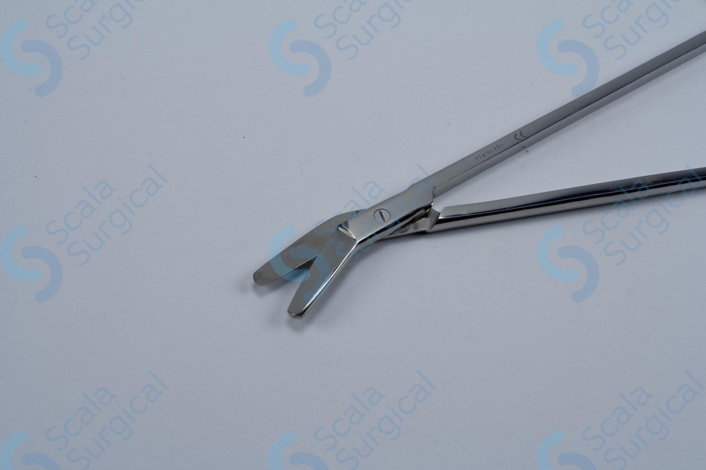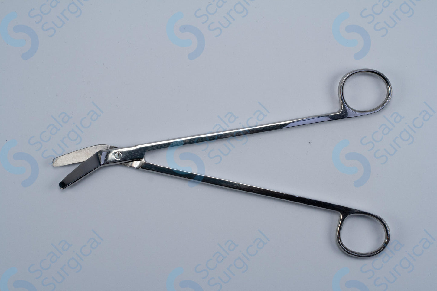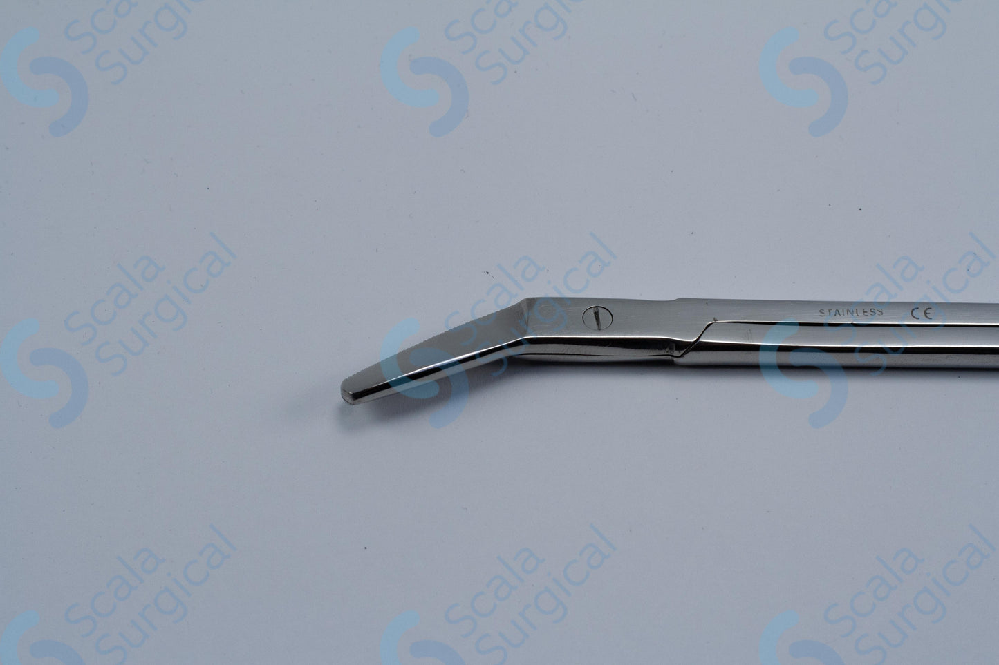 Mitchel Scissors Angled On Flat Serrated Blades (7 inch) are used to cut through tough tissue during surgery. The angled blades and serrated edges make it easier to cut through thick tissue without crushing or tearing it. The 7 inch size allows for precise cutting in tight spaces.