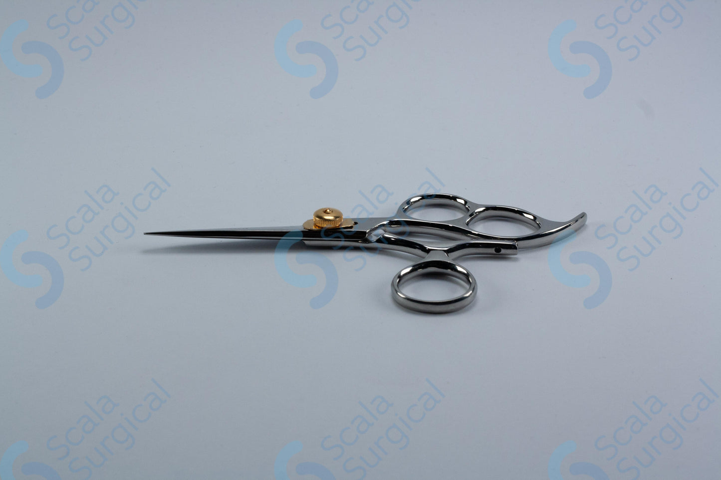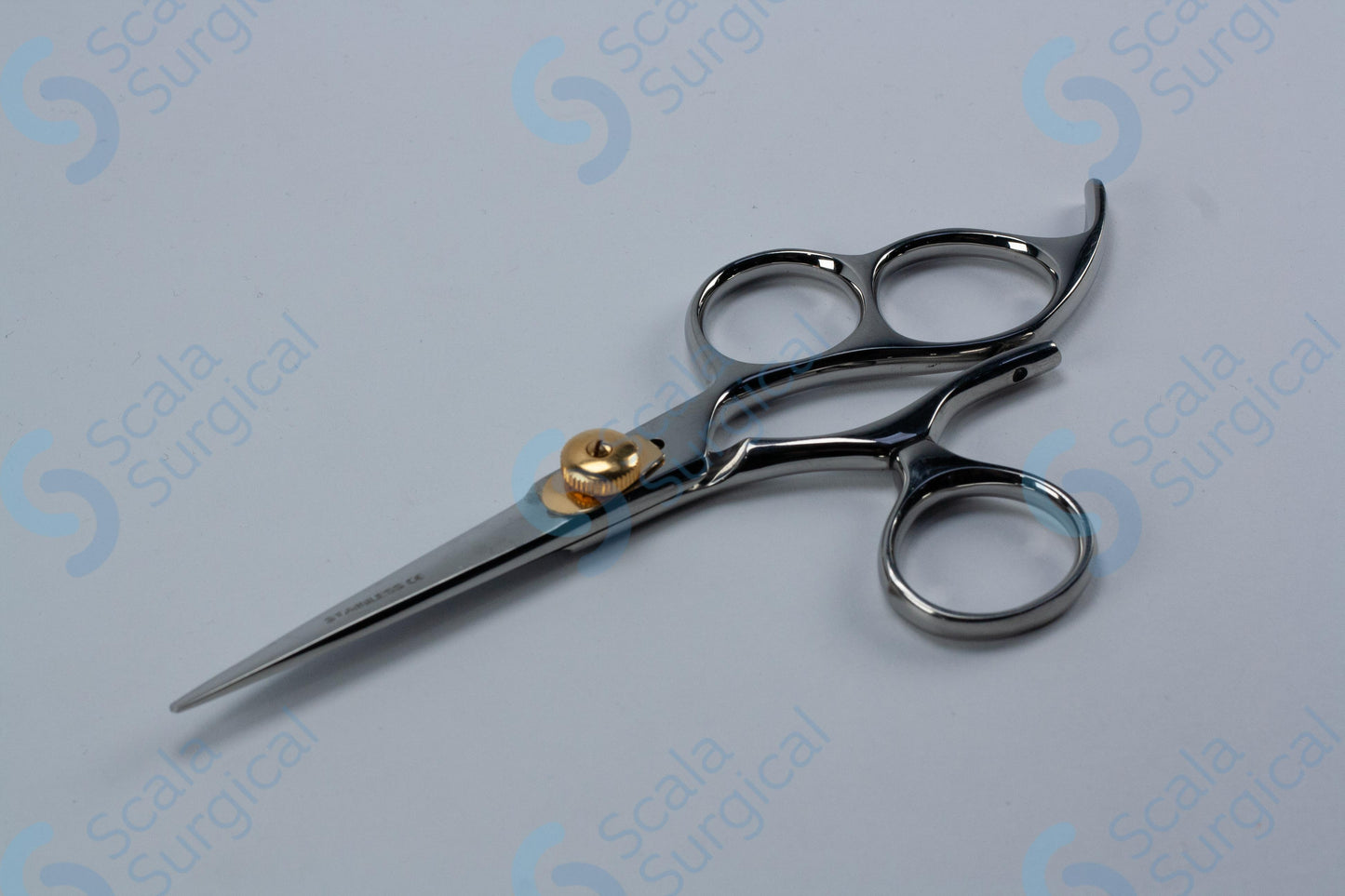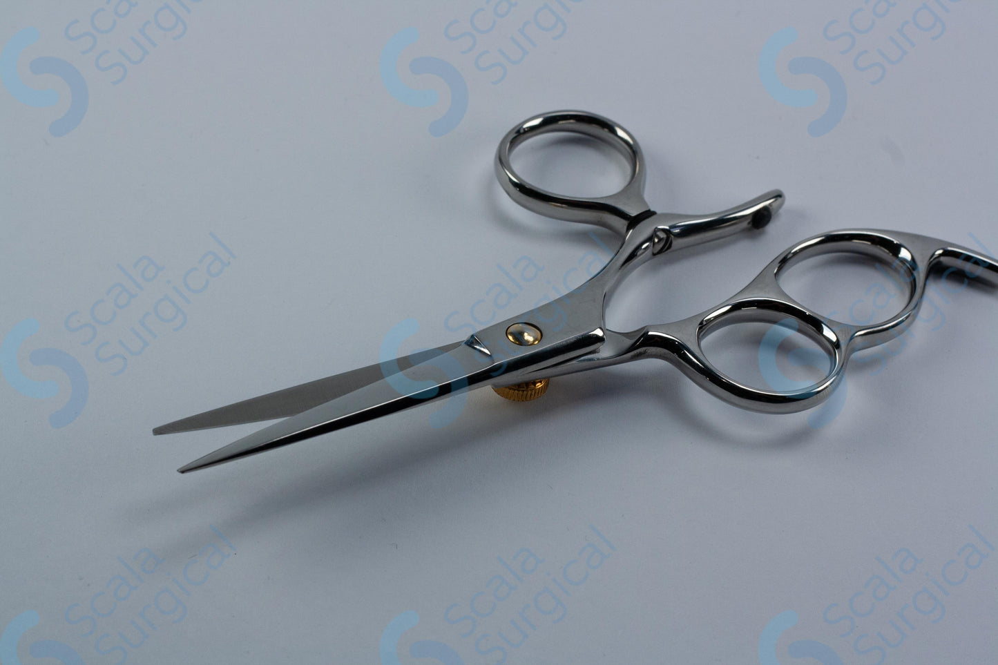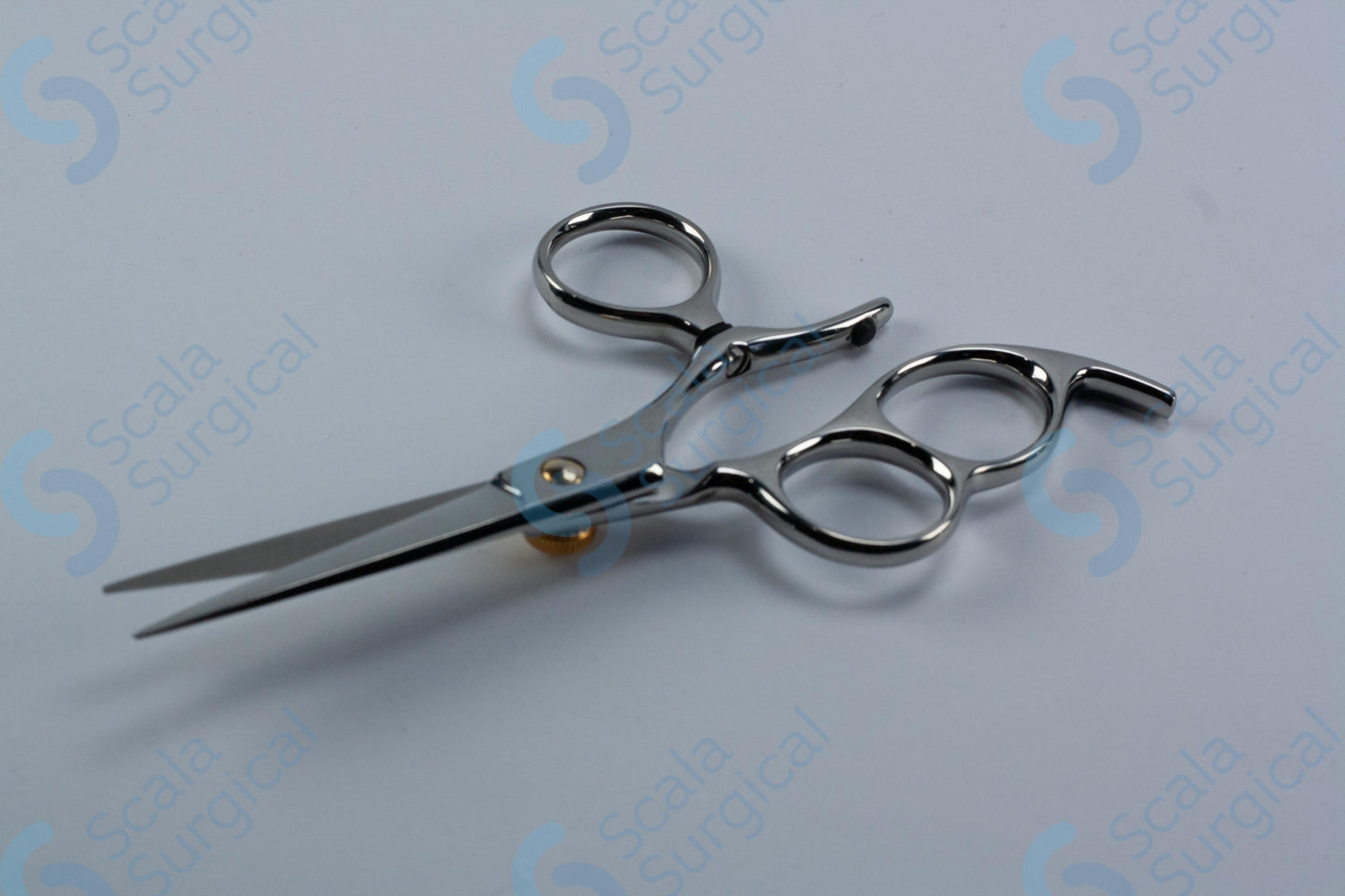 Barber scissors with three rings and a finger rest are used in the surgical field for cutting small, precise pieces of tissue and sutures. The three rings provide stability and control while the finger rest provides additional comfort and leverage. The 127mm (5 inch) size is ideal for small incisions and detailed work.