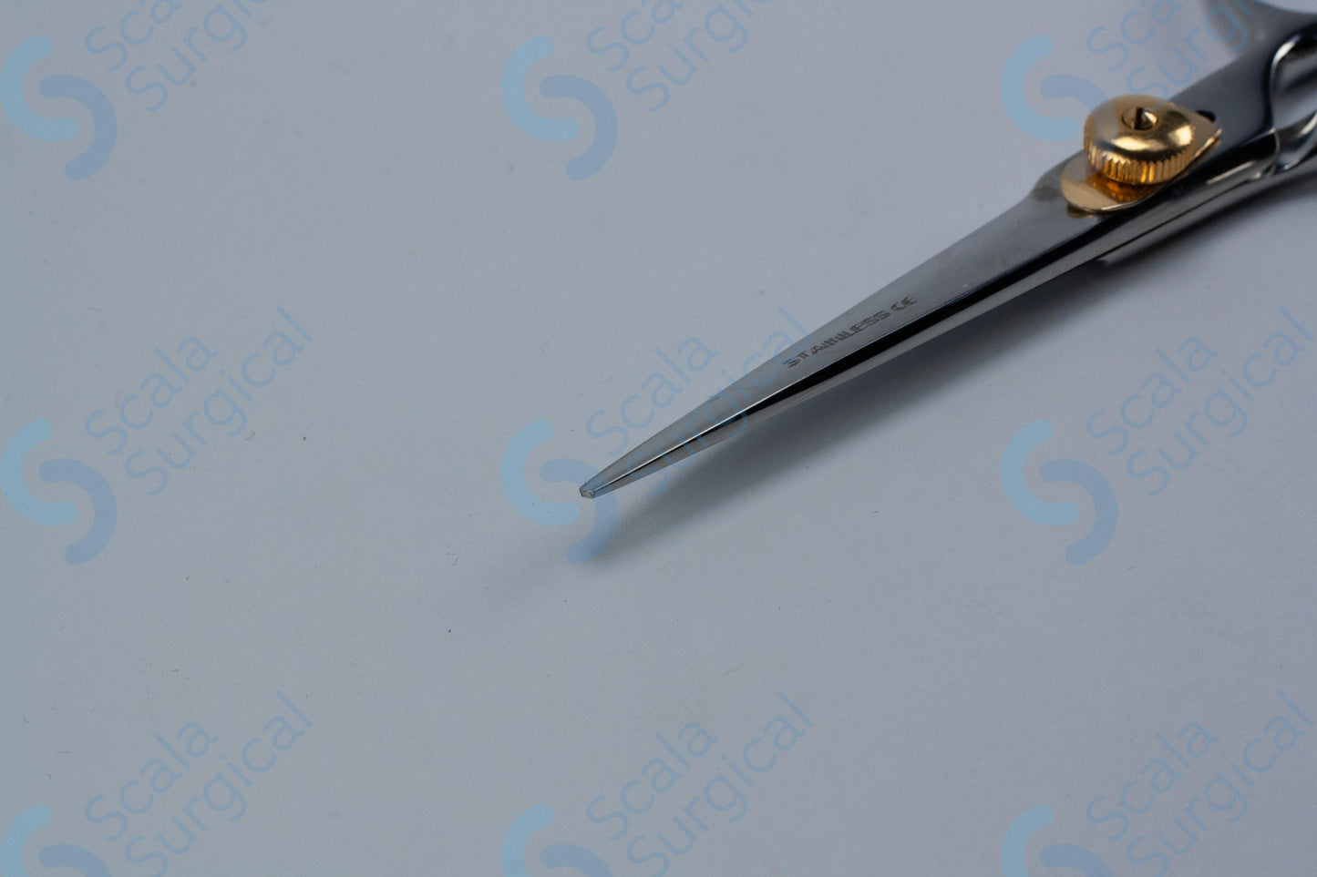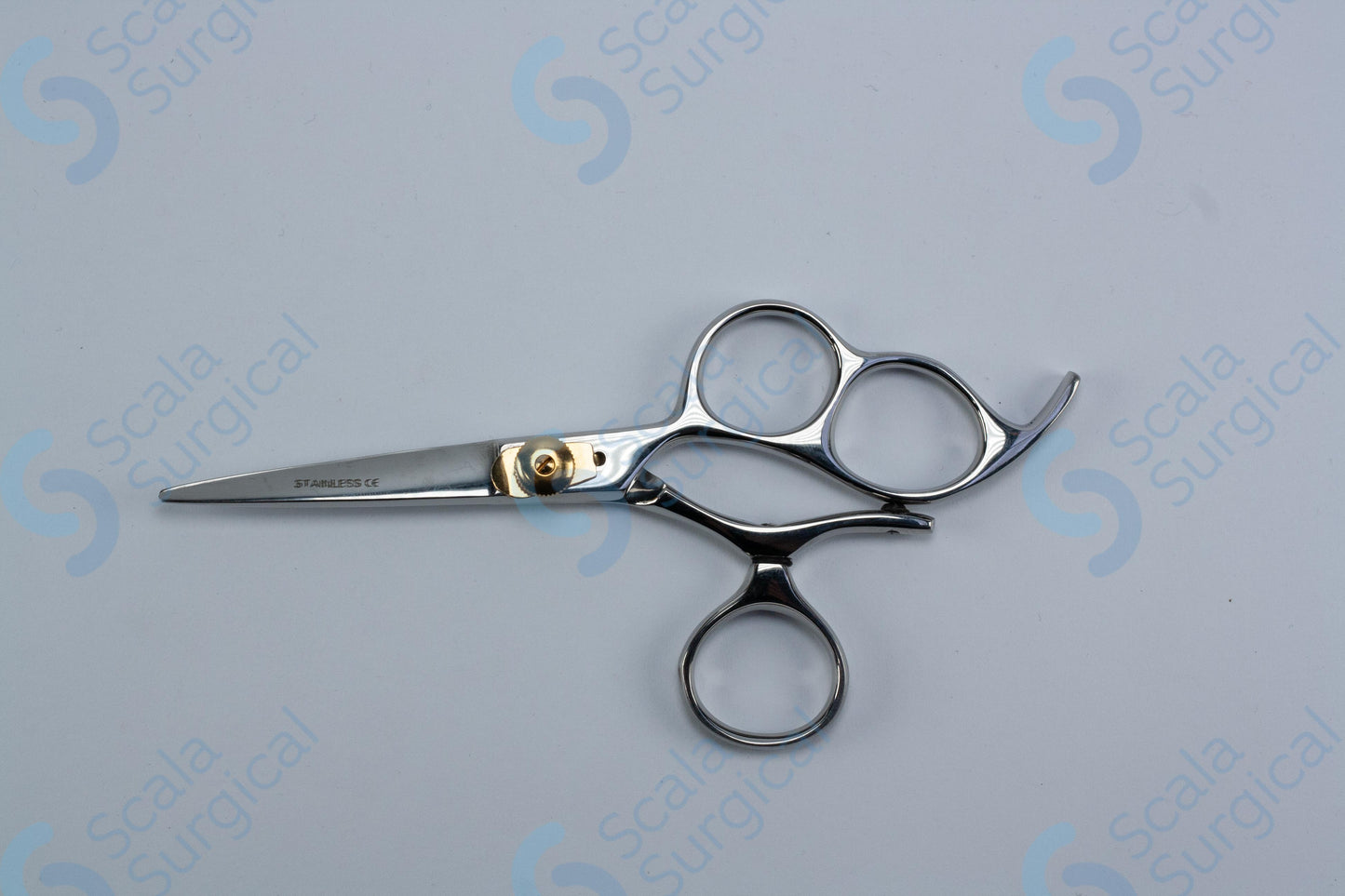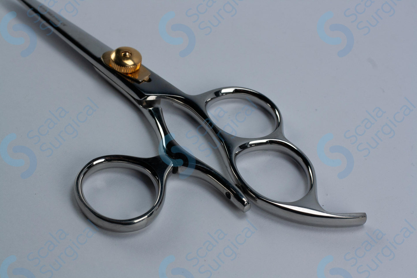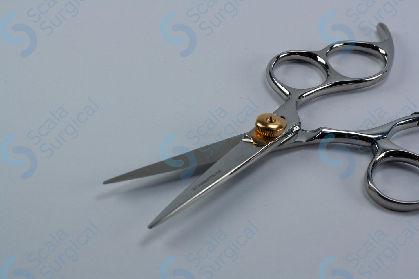Barber scissors with three rings and a finger rest are used in the surgical field for cutting small, precise pieces of tissue and sutures. The three rings provide stability and control while the finger rest provides additional comfort and leverage. The 127mm (5 inch) size is ideal for small incisions and detailed work.