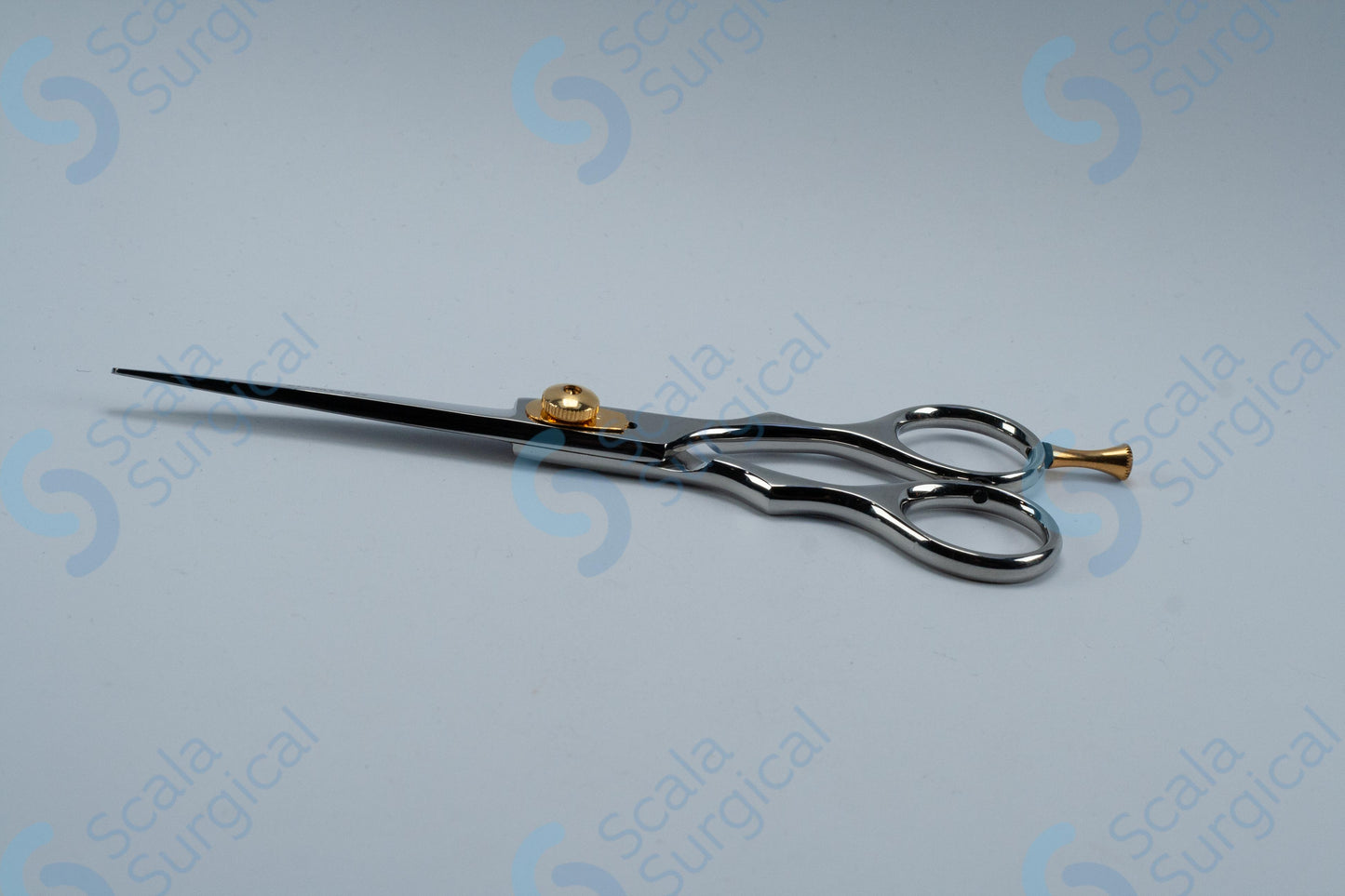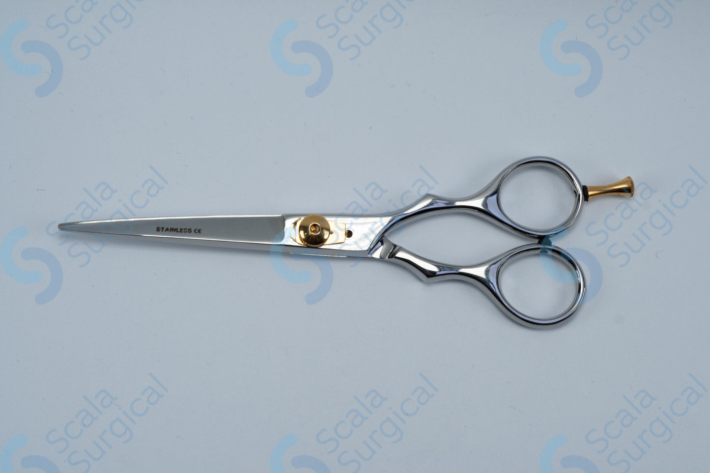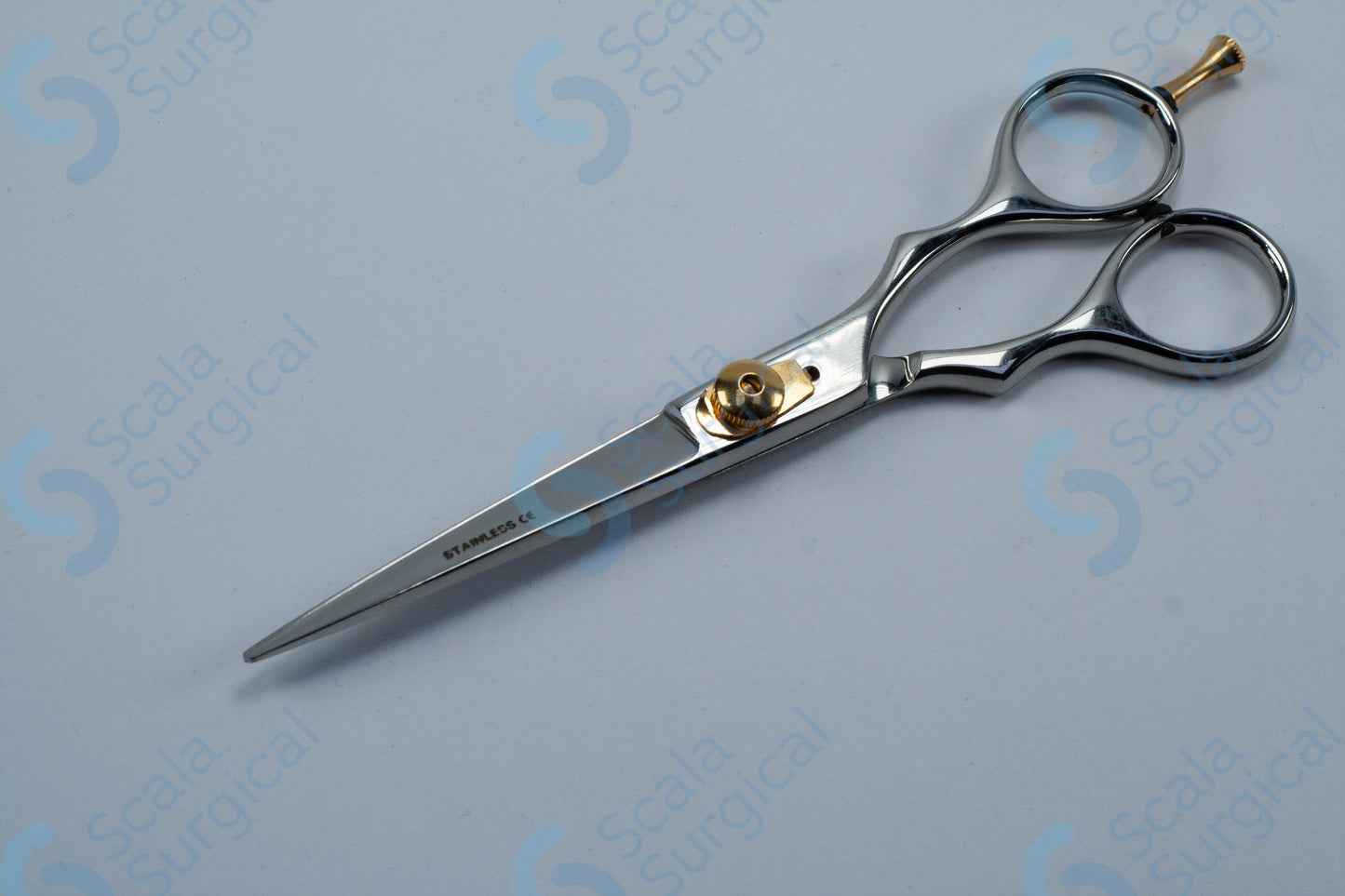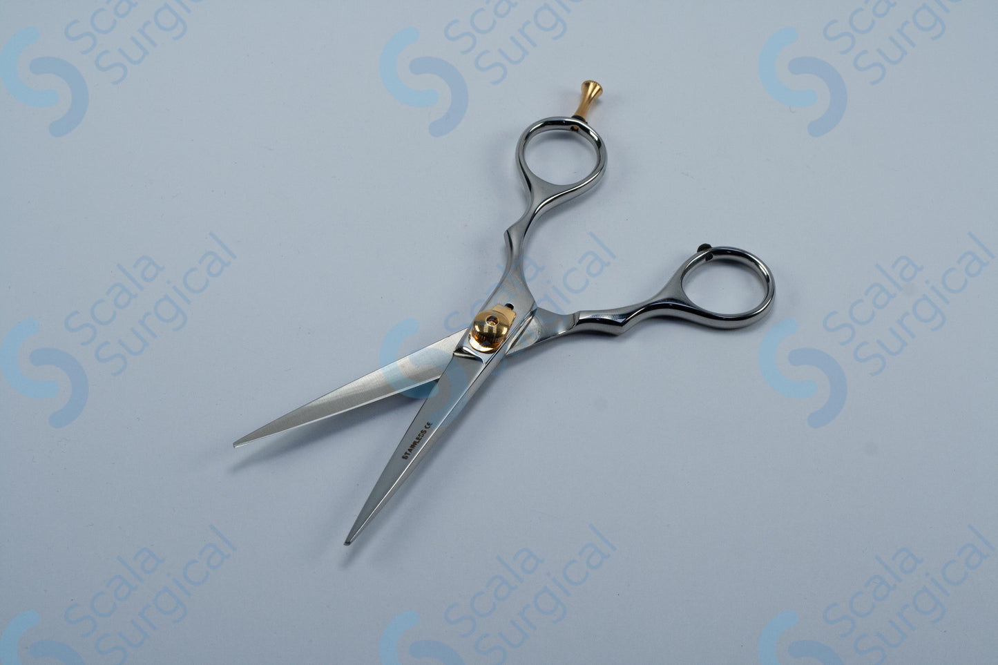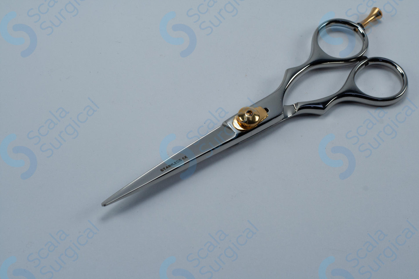 Barber scissors straight with replaceable finger rest and screw (154mm) (6 inch) are used in the surgical field to make precise cuts in tissue. They feature a replaceable finger rest and screw, allowing for a comfortable grip and precise control. The long, straight blades make it easy to cut through tissue and the 154mm (6 inch) length offers a good balance between reach and control.