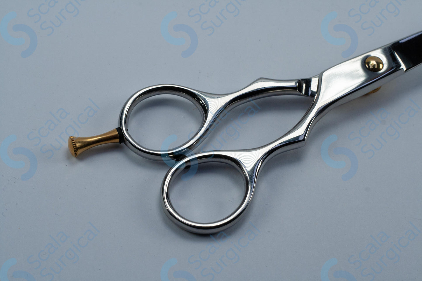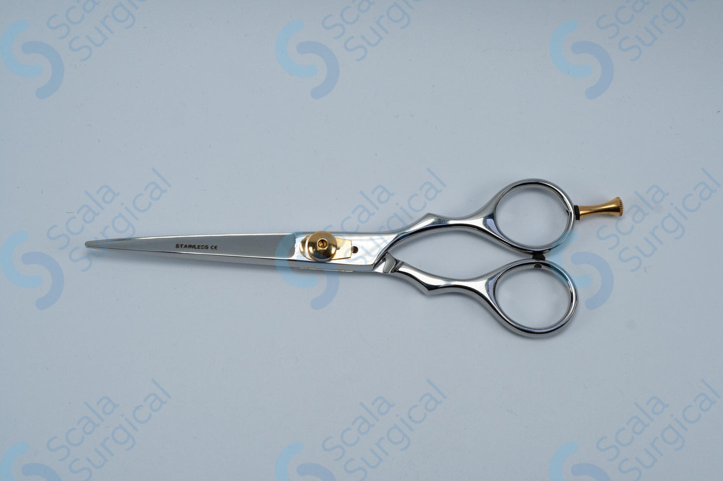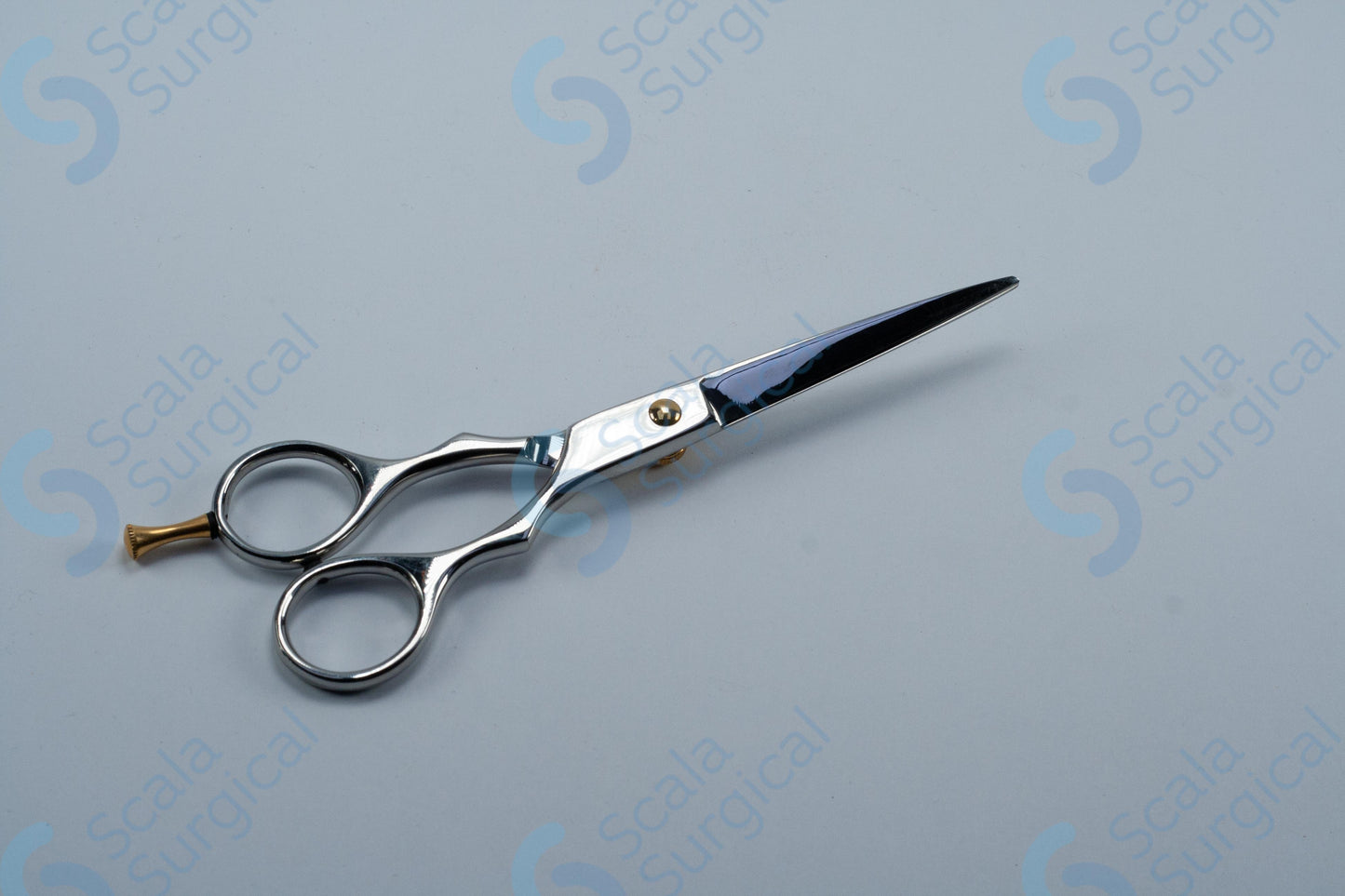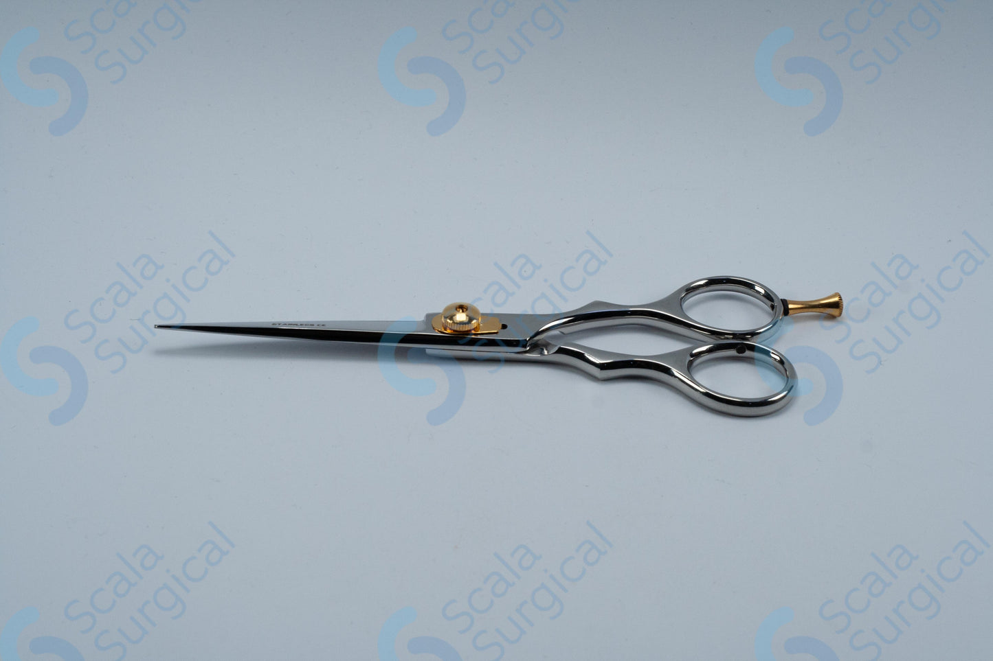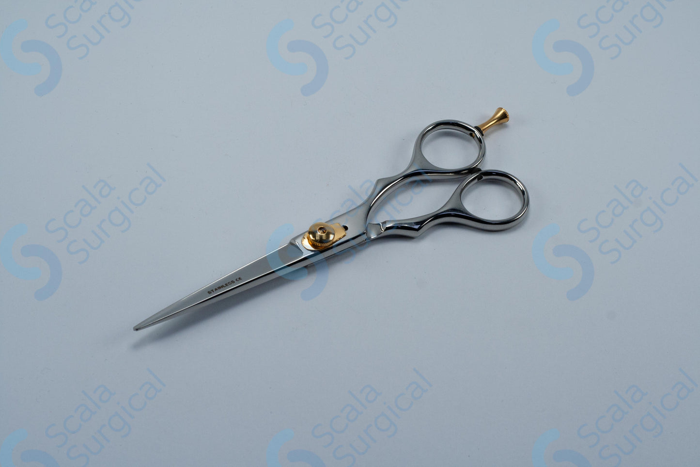 Barber scissors straight with replaceable finger rest and screw (154mm) (6 inch) are used in the surgical field to make precise cuts in tissue. They feature a replaceable finger rest and screw, allowing for a comfortable grip and precise control. The long, straight blades make it easy to cut through tissue and the 154mm (6 inch) length offers a good balance between reach and control.