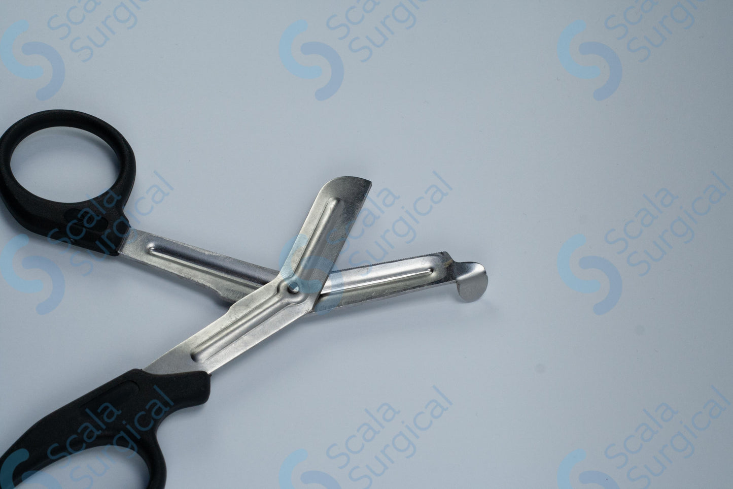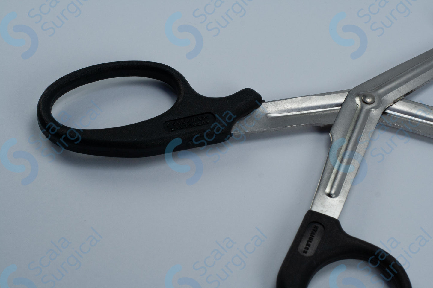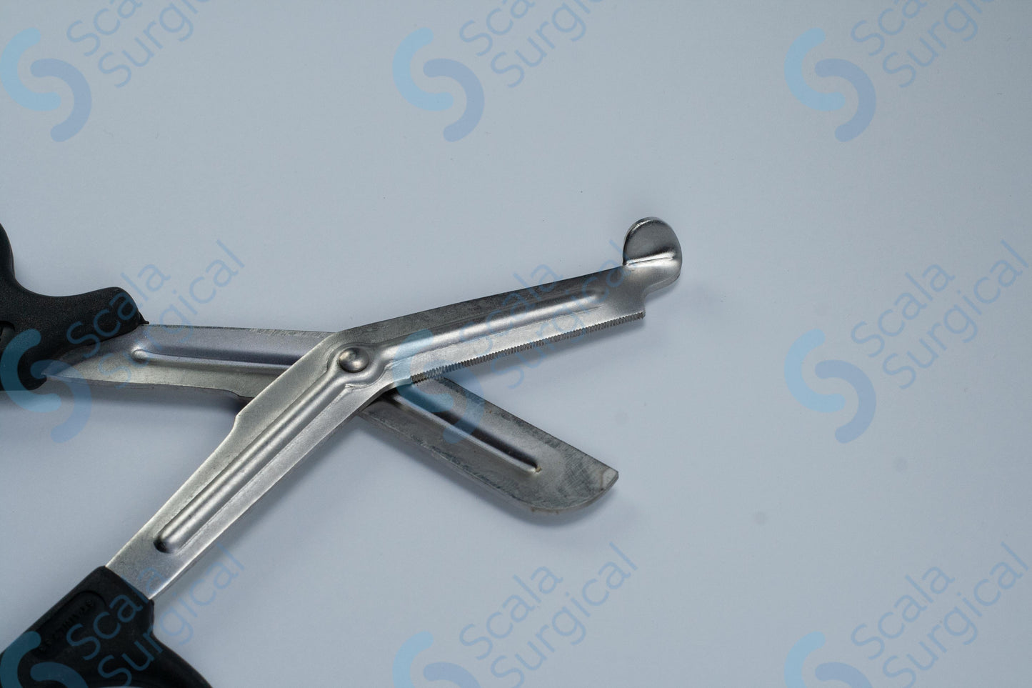 This item is a medical instrument used to cut through tissue and sutures during surgery. It is designed with a plastic handle and angled side for easier maneuvering and cutting. The handle is 7? inches (190.5mm) in length.