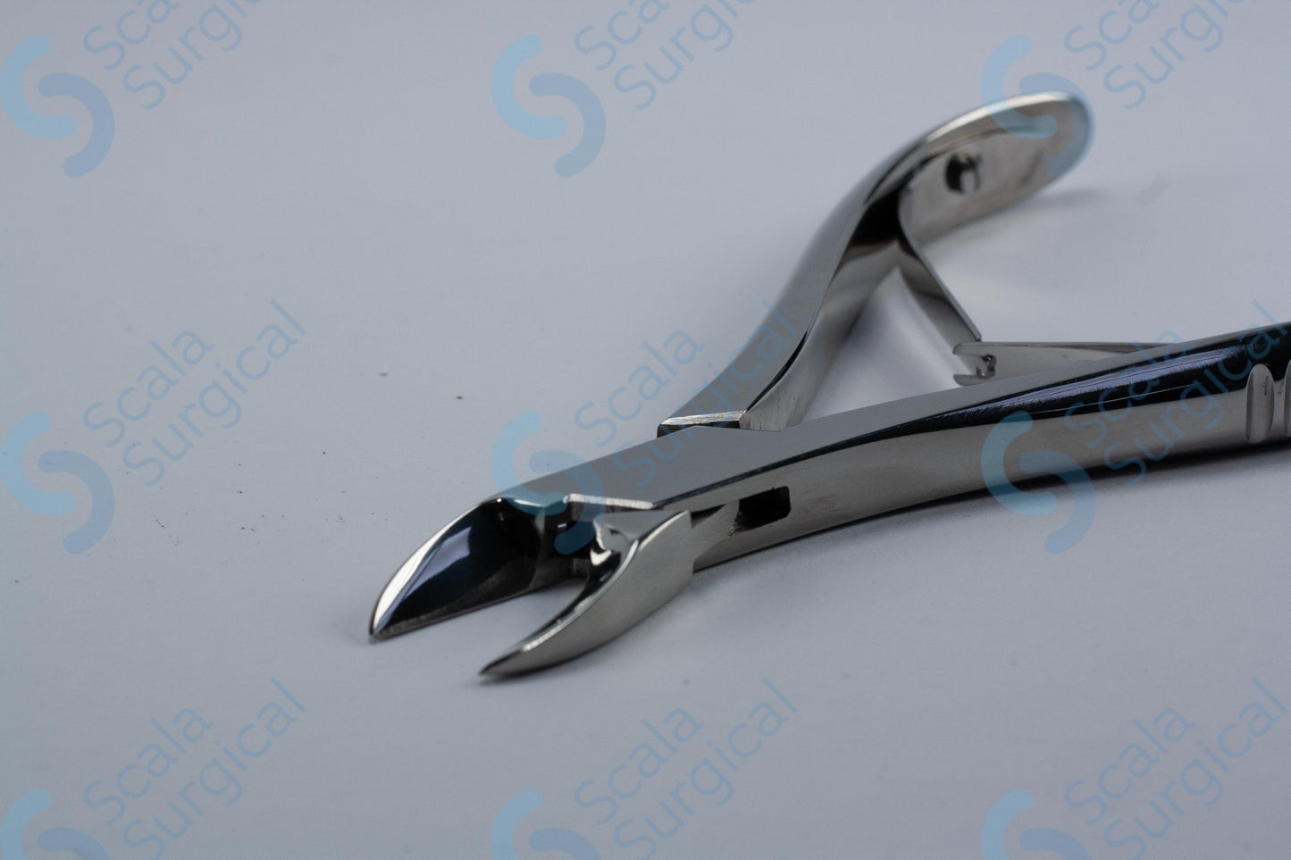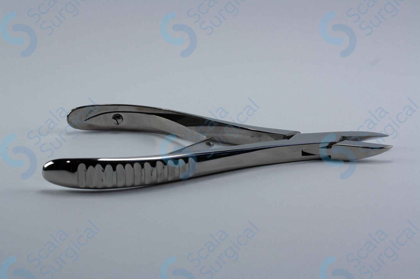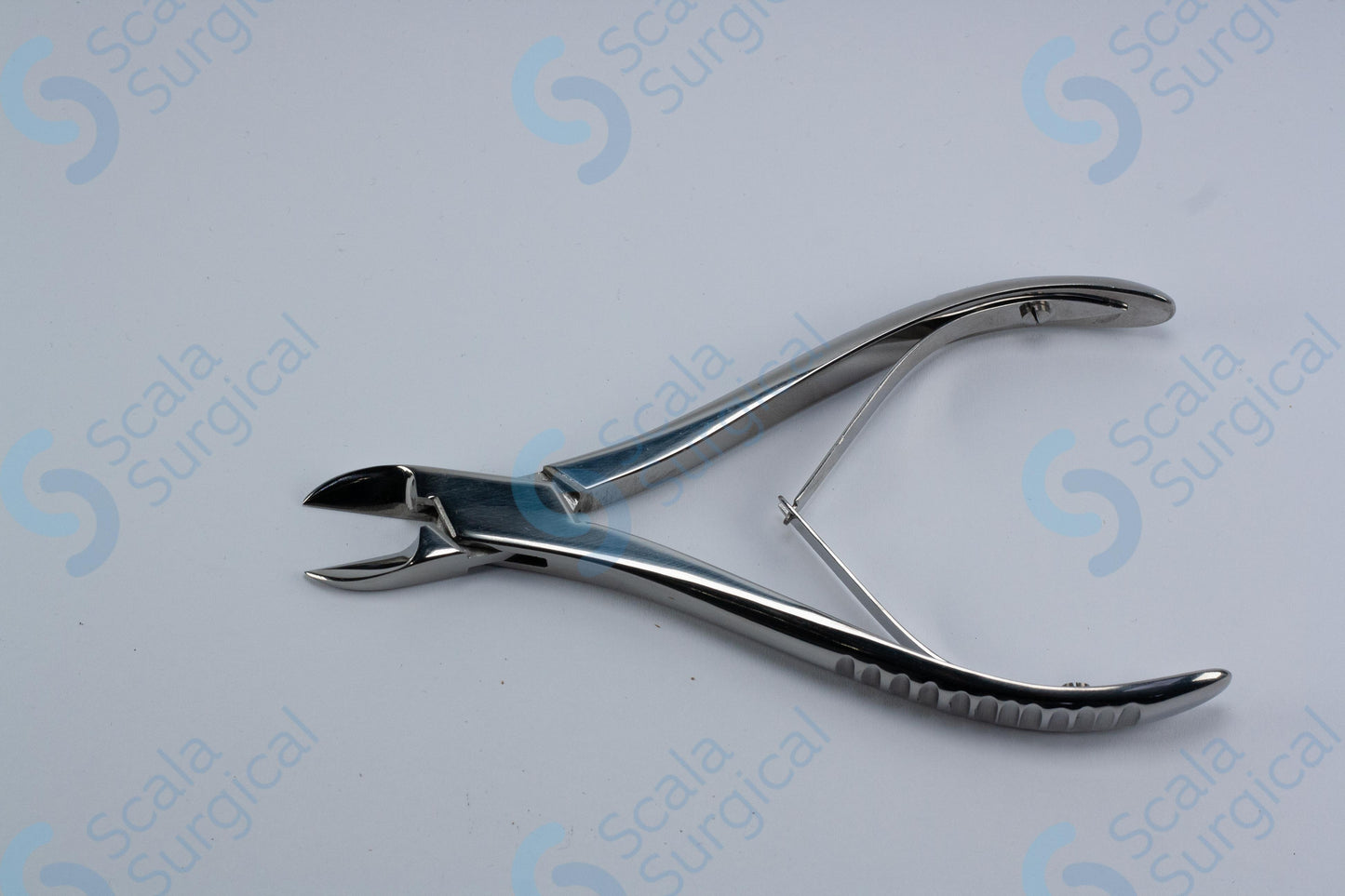 This item is used to trim and shape nails during a surgical procedure. It features a spring-action handle and concave blades with a box joint for precision.