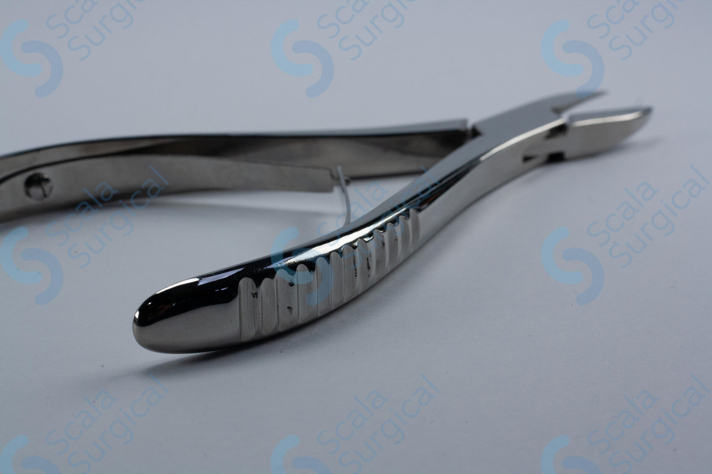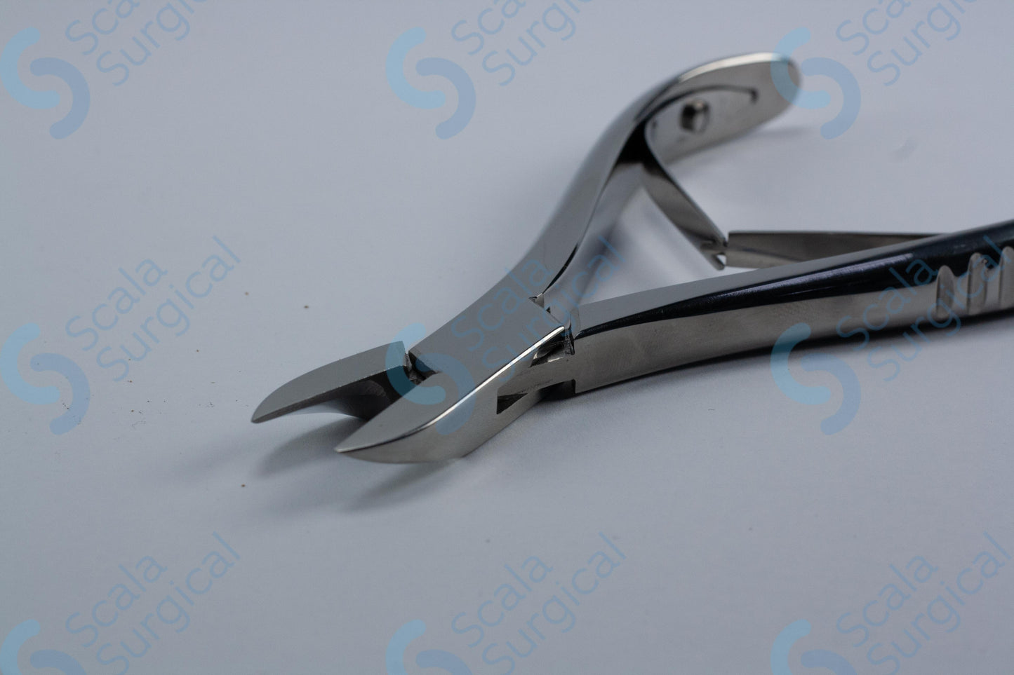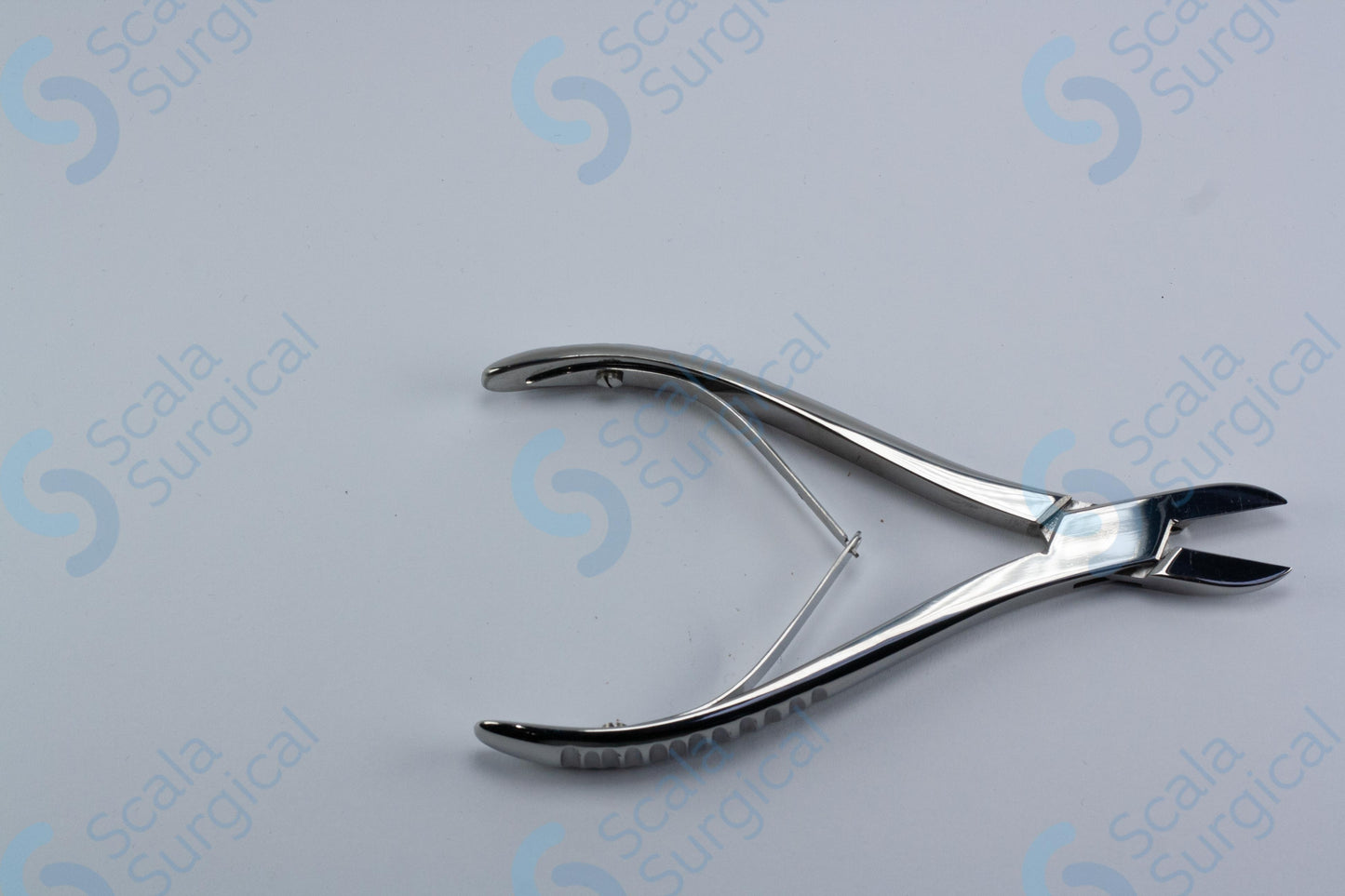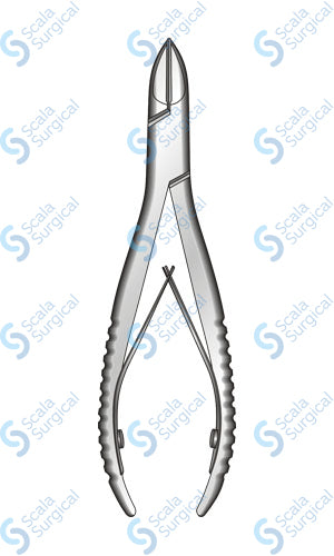 This item is used to trim and shape nails during a surgical procedure. It features a spring-action handle and concave blades with a box joint for precision.