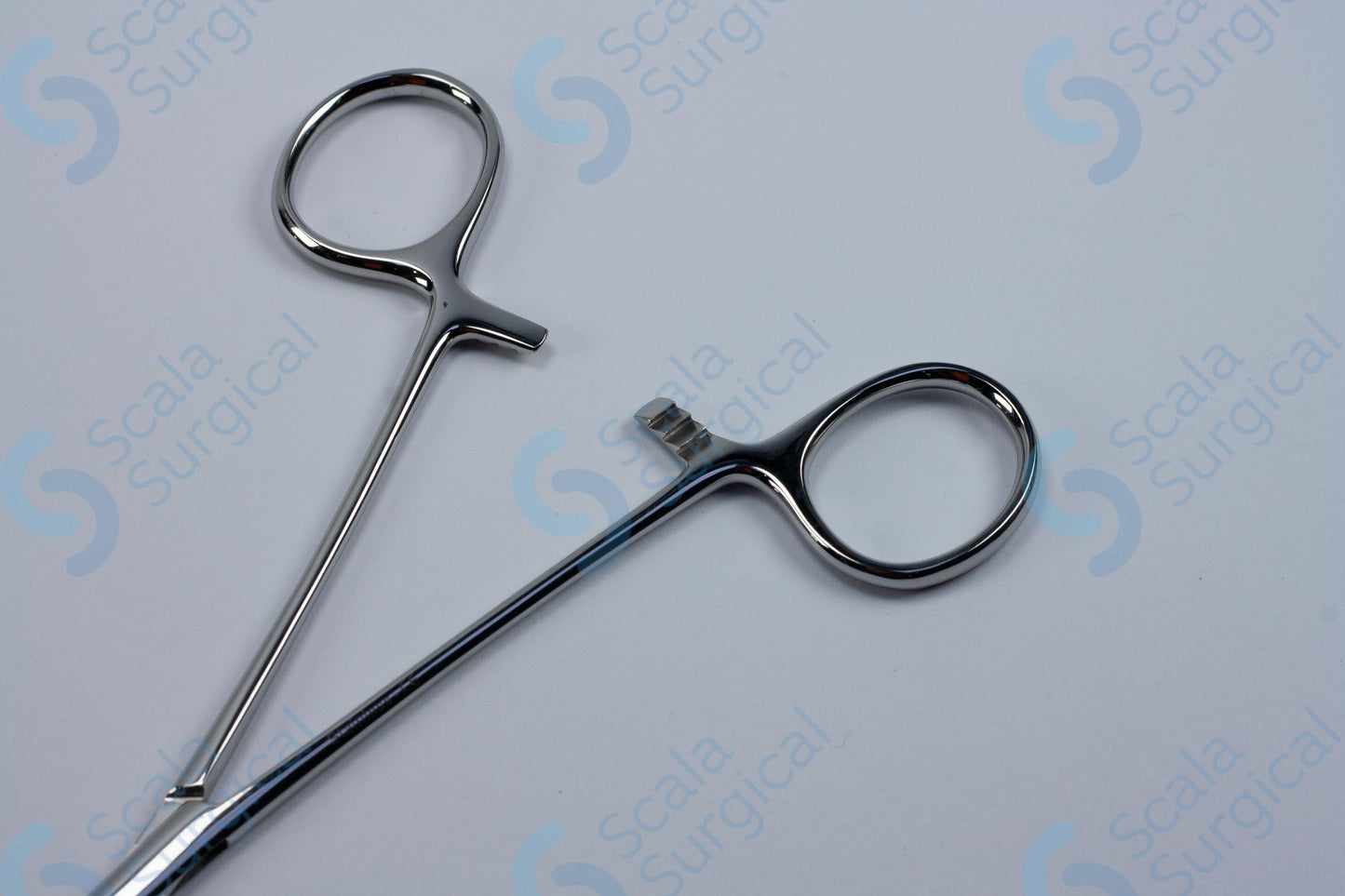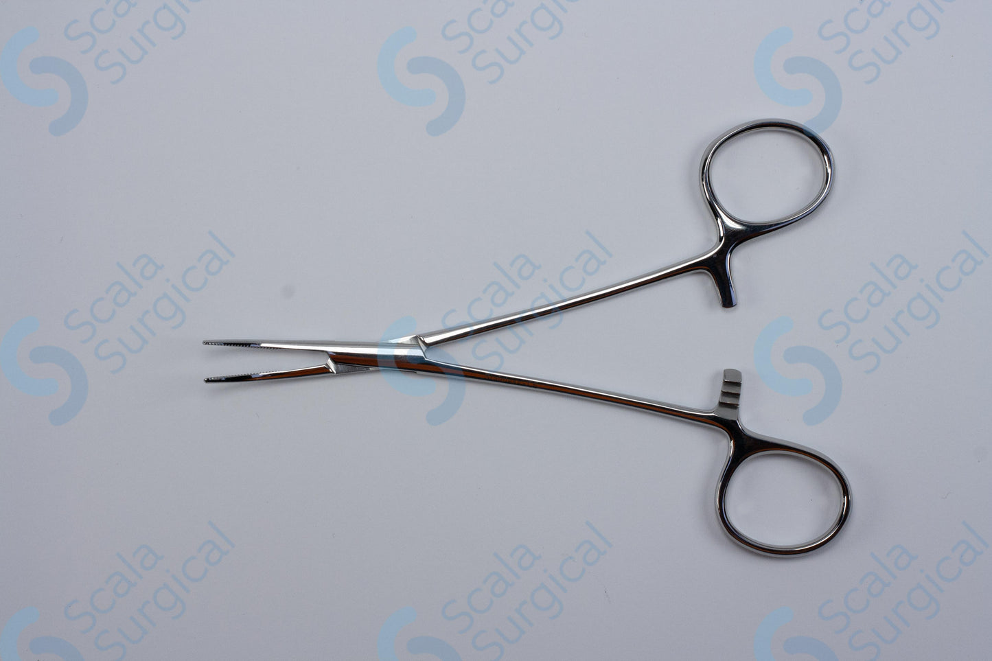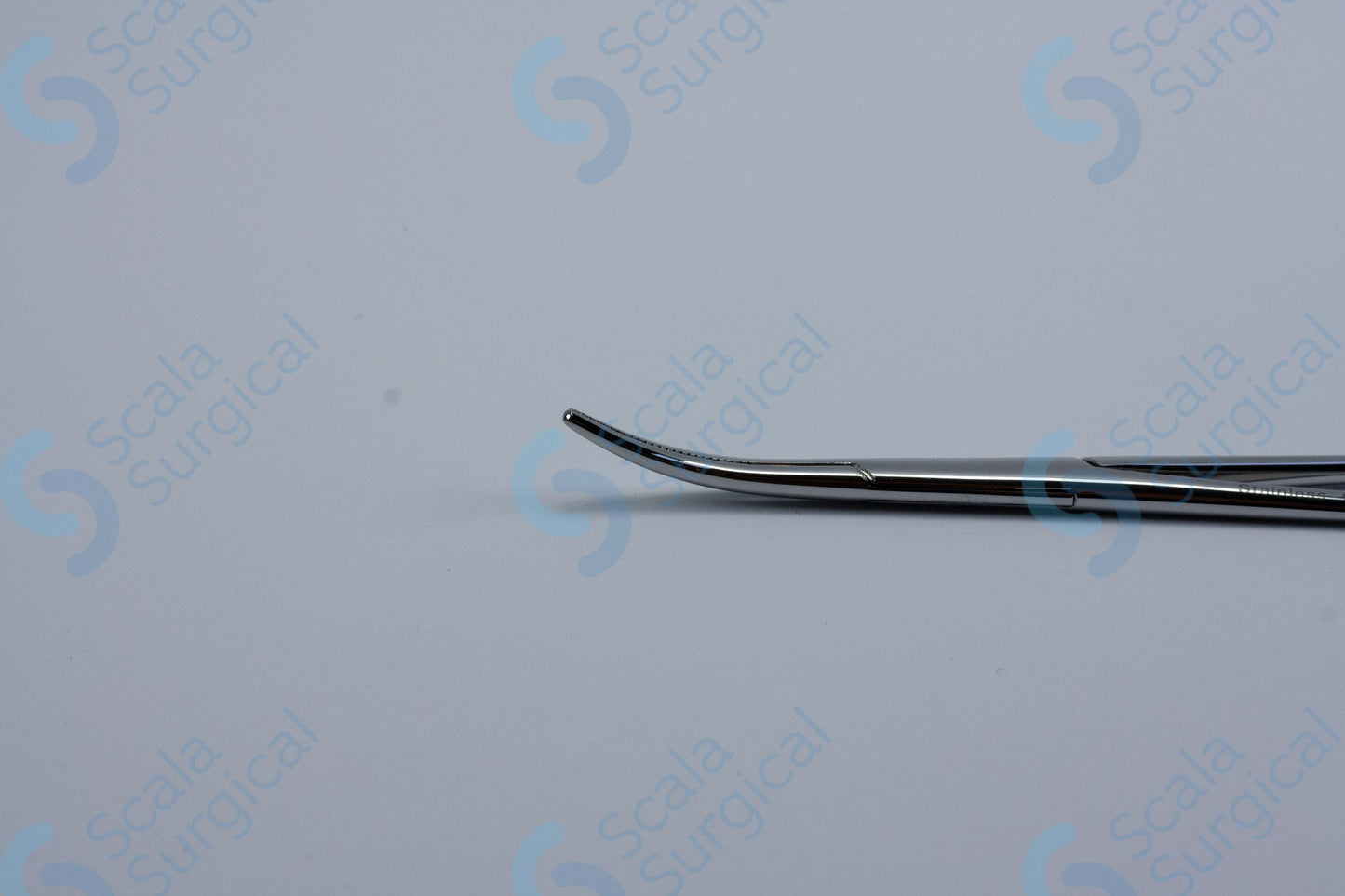 This item is a type of medical forceps used during surgeries. It is used to grasp and hold tissue or other objects during a procedure. The half-jaw design with horizontal serrations and curved tips allows for a secure grip. The 146mm (5? inch) size is suitable for a variety of surgical applications.