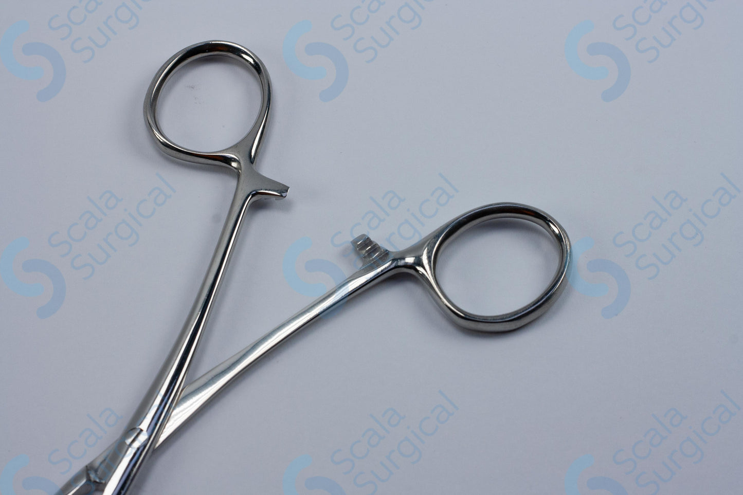The Dunhill Artery Forceps Horizontal Serrated Jaws Curved Screw Joint (127mm) (5 inch) is a surgical instrument used to clamp, cut, or hold tissue or blood vessels. It can be used for various procedures such as tying sutures, ligating vessels, or removing foreign objects.