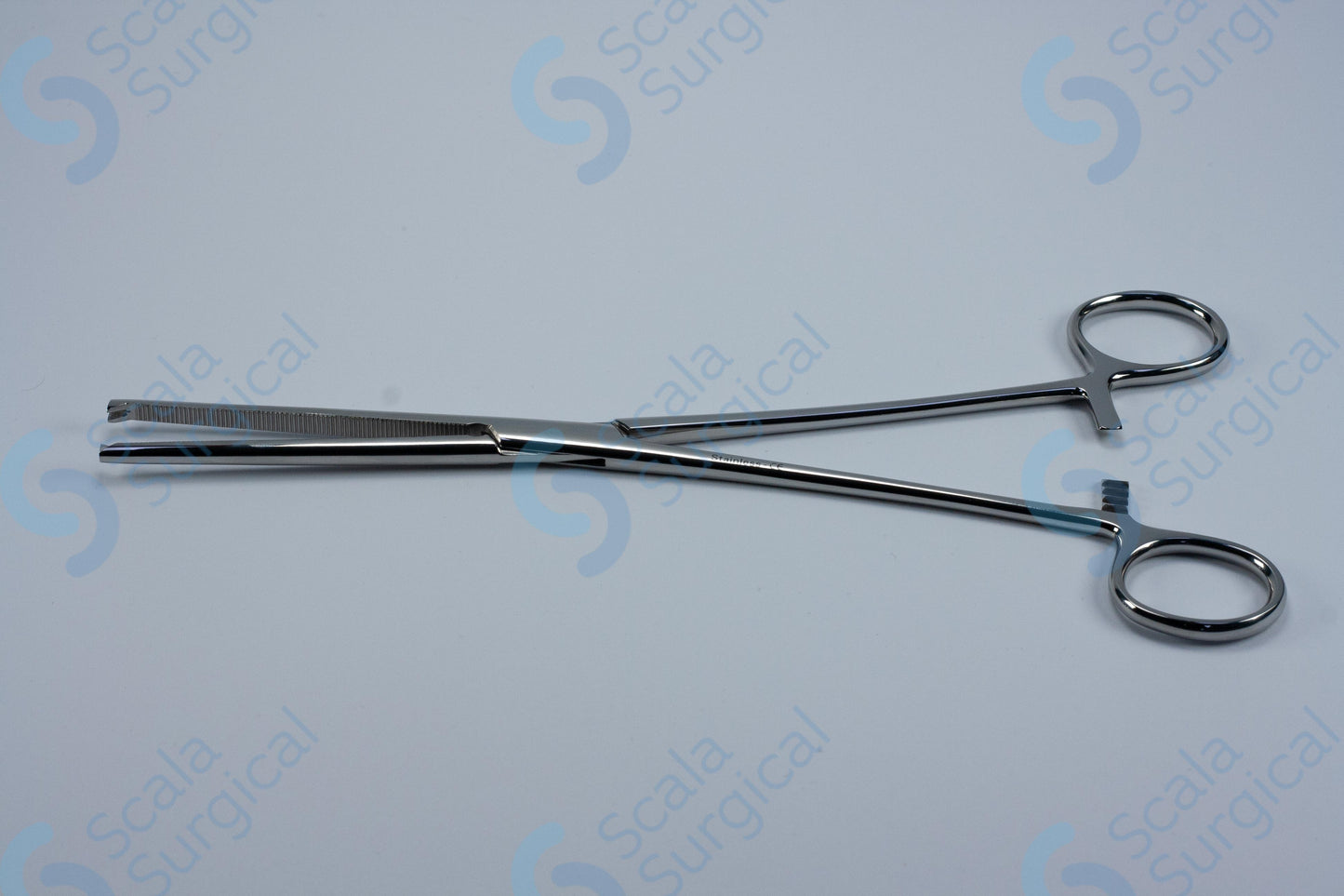 Kocher Artery Forceps are used in the surgical field to grasp and manipulate tissue during a procedure. They are used to clamp, hold, or cut vessels and other tissue. The 1 x 2 teeth horizontal serrated jaws and straight box joint provide a secure grip and precise control, allowing surgeons to perform delicate procedures with accuracy. The 228.6mm (9 inch) size of the forceps is designed for use in smaller surgical sites.