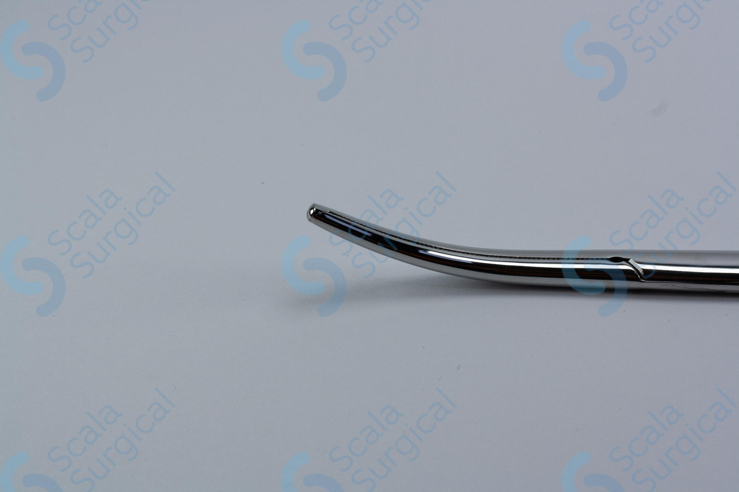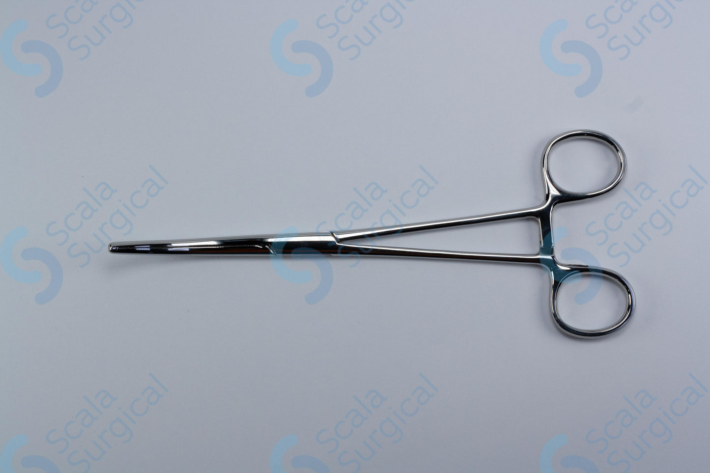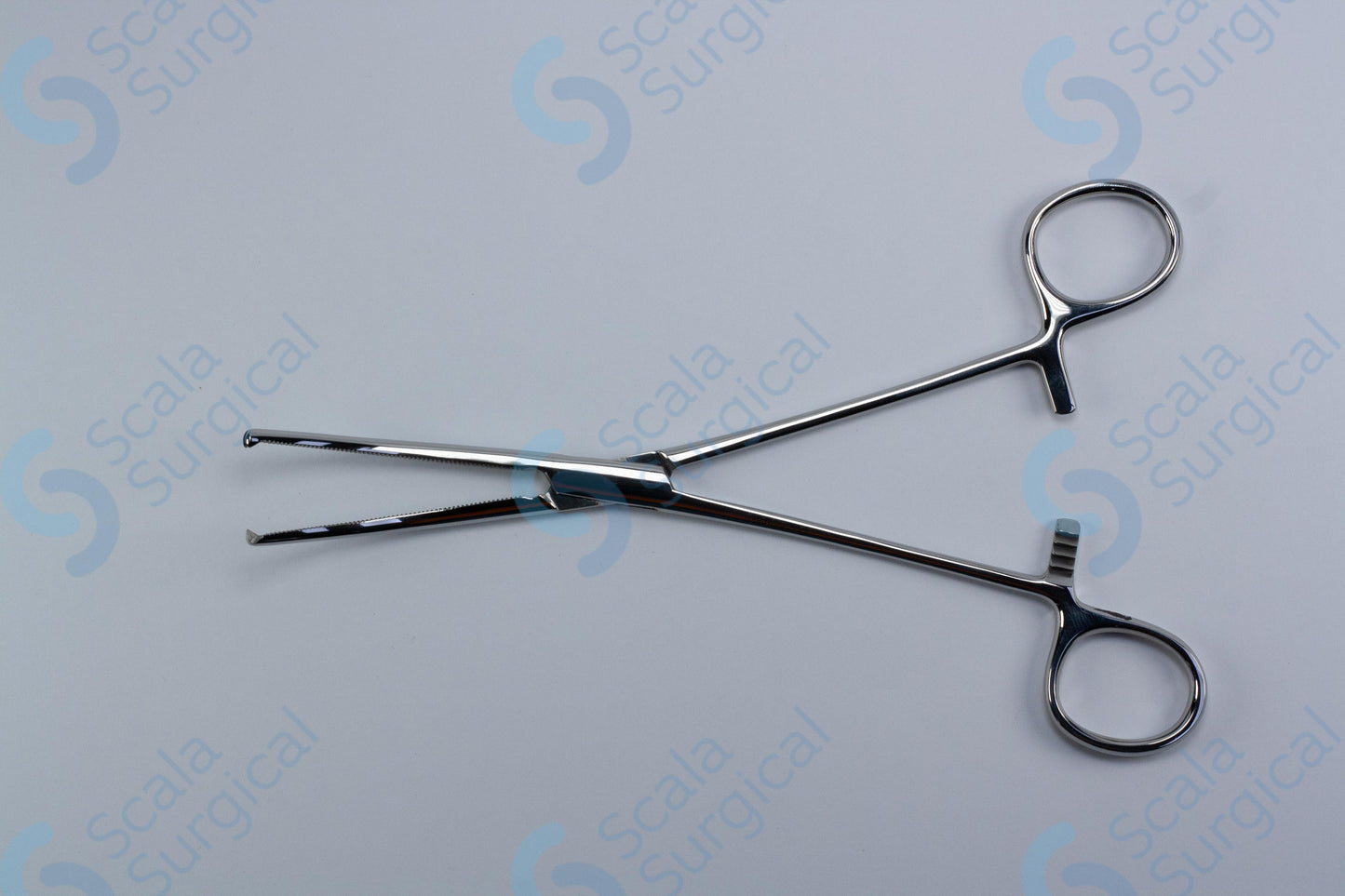 This item is a type of forceps used in surgery. It has horizontal serrated jaws and a round end, and is 203.2 mm in length. It is used to grasp, hold, and manipulate tissue or other objects during a surgical procedure.