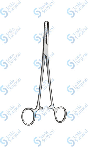 This item is a surgical instrument used for clamping and occluding vessels during a procedure. It is a Kocher-Ochsner Art Forceps with 1 x 2 teeth, horizontal serrations, round ends, and a cvd BJ 228.6 mm length.