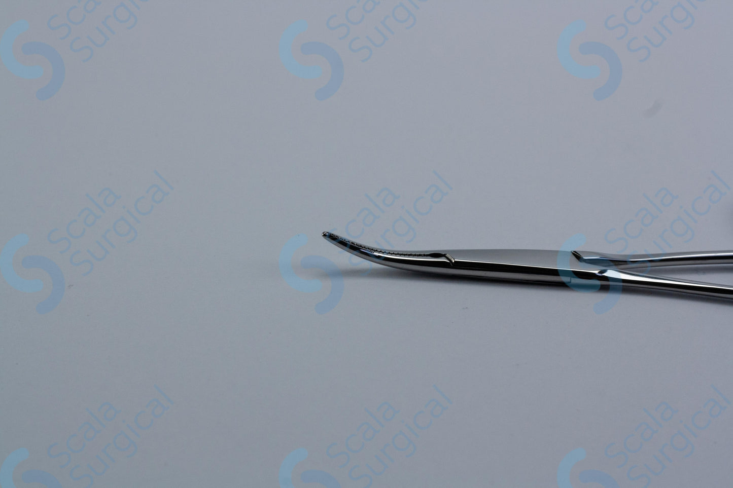 The Micron Artery Forceps Horizontal Serrated Jaws Curved Box Joint (88.9mm) (3? inch) is a surgical instrument used to grasp and hold delicate tissue and vessels, such as arteries, during surgical procedures. It is commonly used in cardiovascular, gynecologic, and plastic surgery. The serrated jaws provide a secure grip on tissue, and the curved box joint allows for smooth articulation of the forceps.