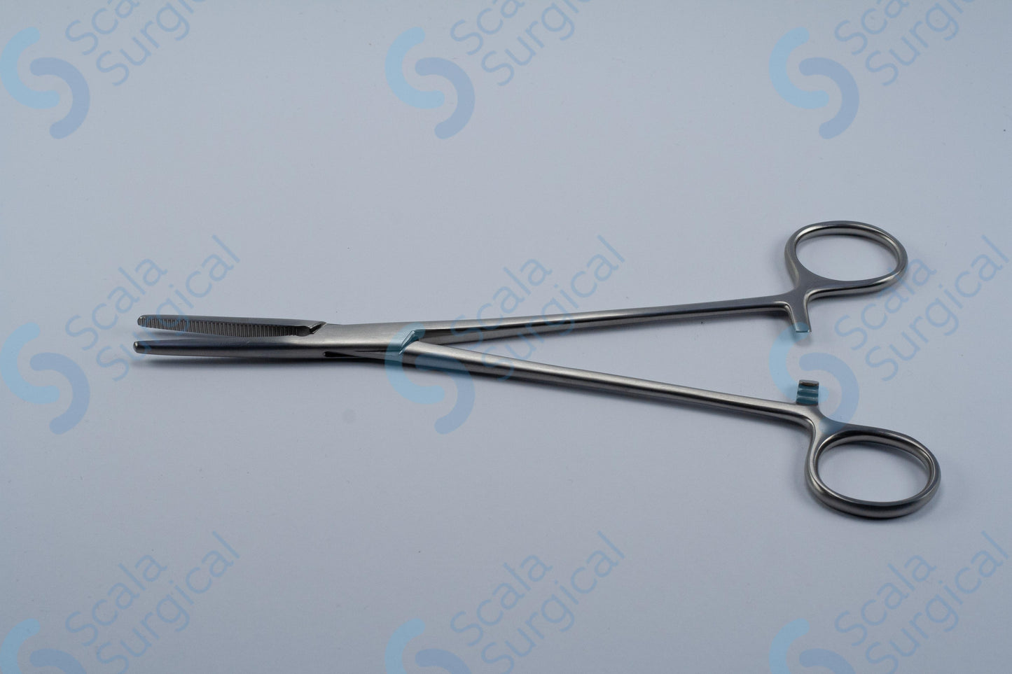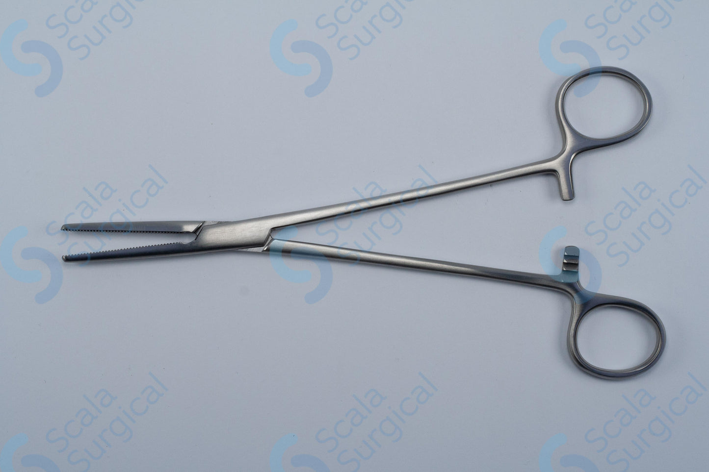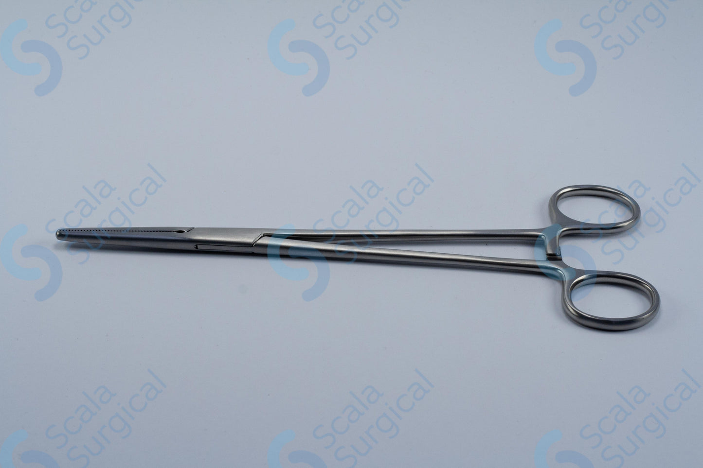 The Spencer Wells Artery Forceps Horizontal Serrated Jaws Straight Box Joint (203.2mm) (8 inch) is used to clamp, hold, and manipulate tissue during surgical procedures. It is commonly used to clamp off blood vessels during surgery to prevent bleeding.