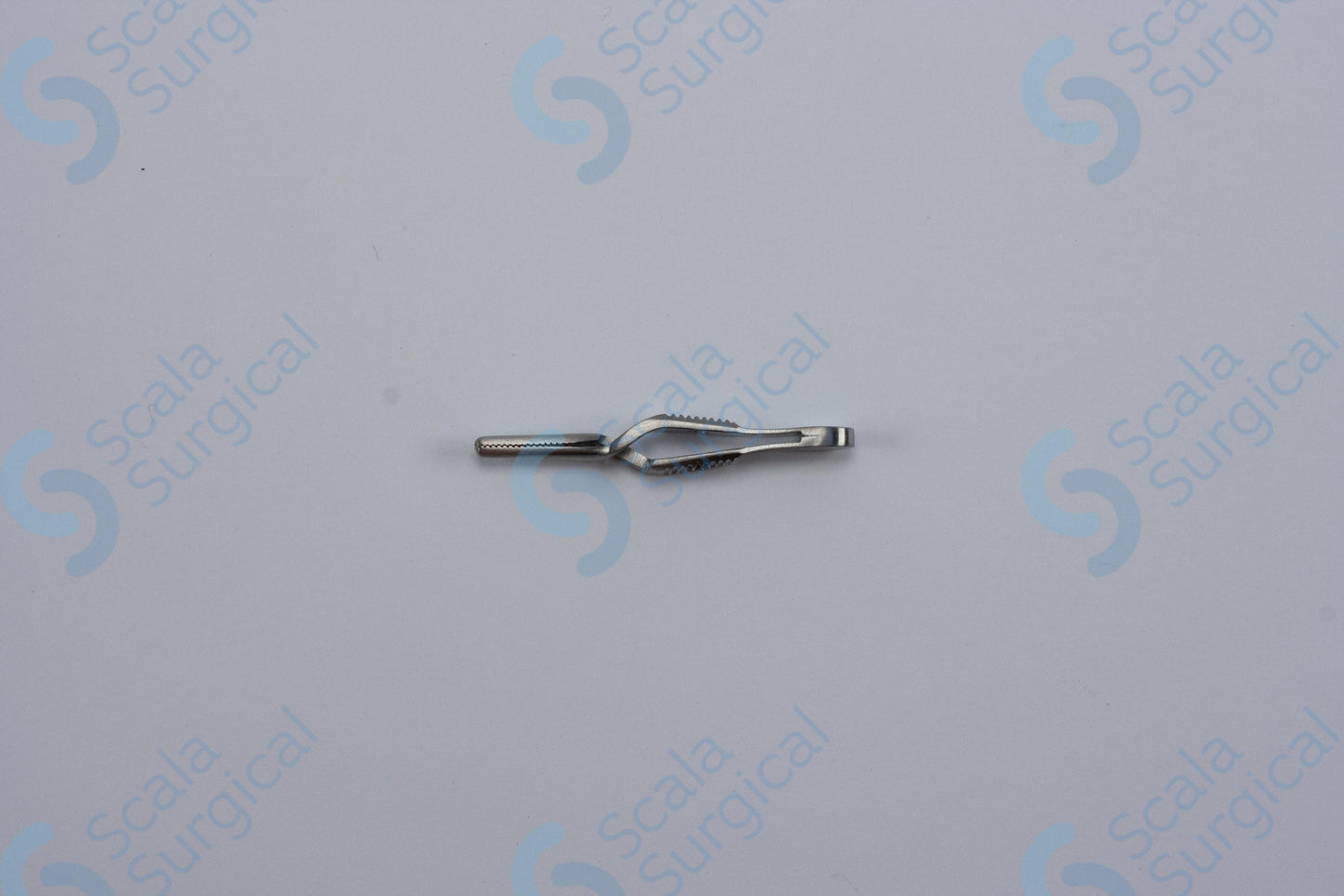 This type of clamp is used to hold blood vessels in place during surgical procedures. It is typically used to clamp a vessel before it is cut or sutured. The serrated jaws help to firmly grip the vessel so that it does not move during the procedure.