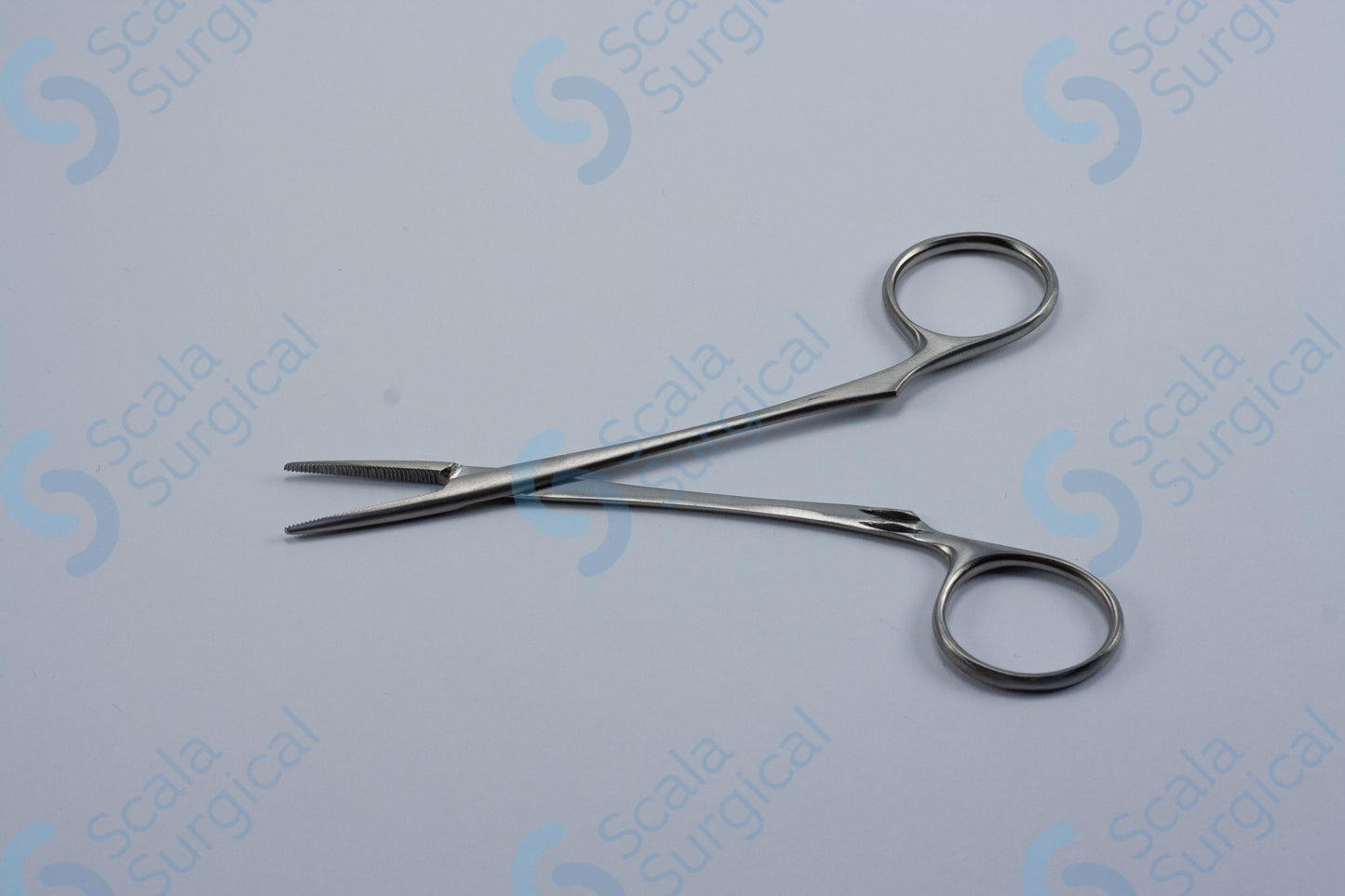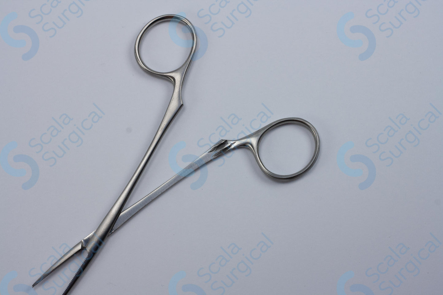 Halsted-Mosquito Artery Forceps are surgical instruments used to clamp and hold blood vessels during surgery. They have horizontal serrated jaws and a straight screw joint, which allows them to be adjusted to different sizes. The 127mm (5 inch) size is a common size used in many surgical procedures.