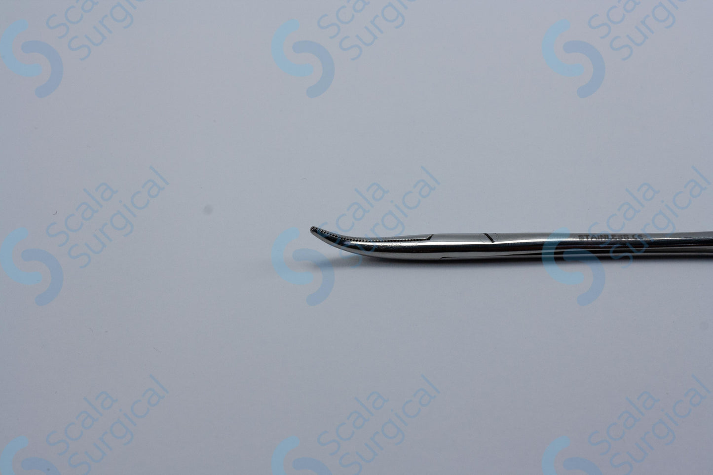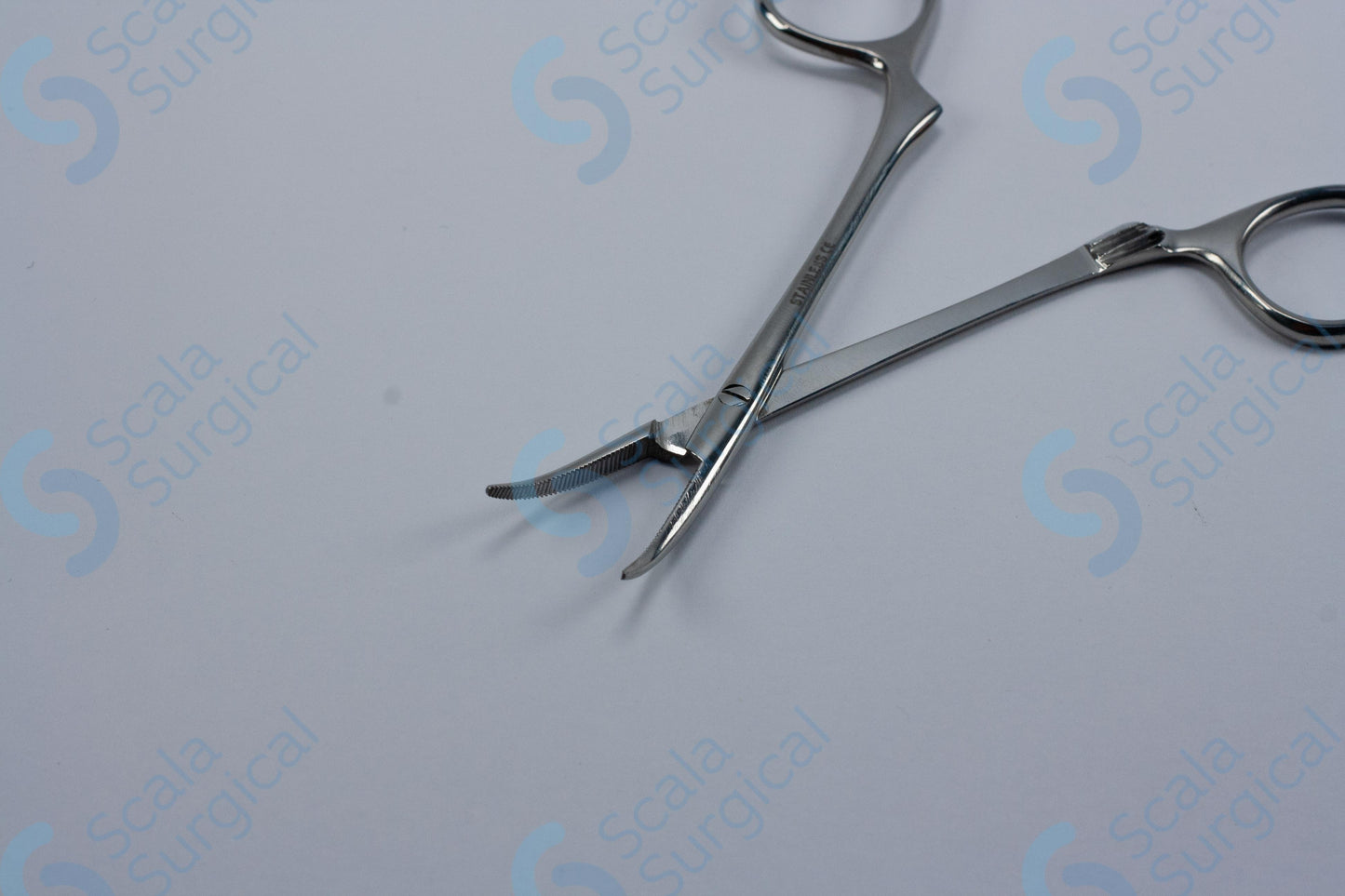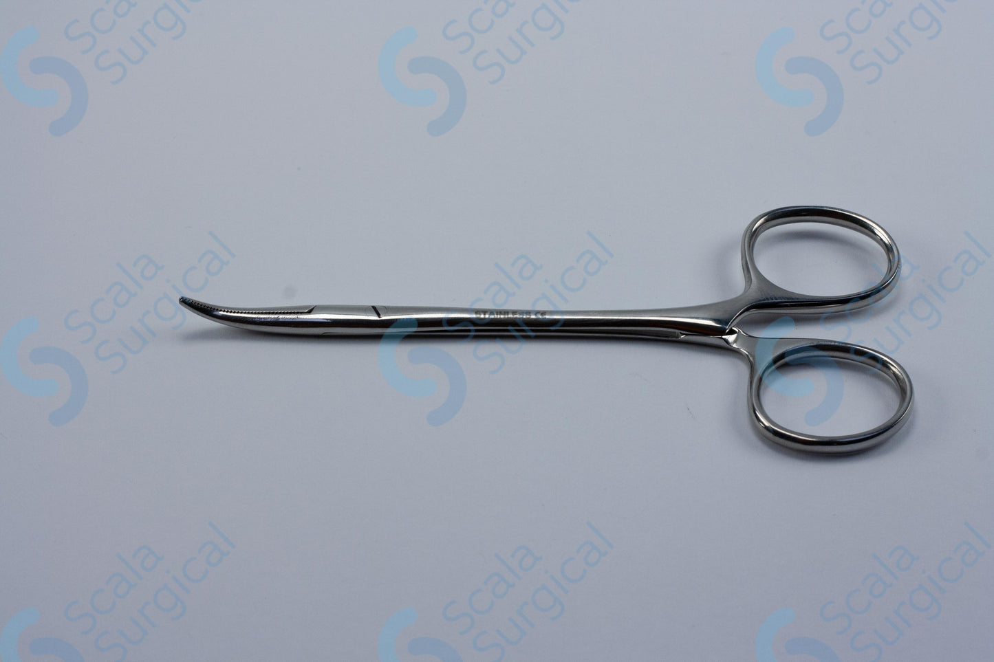 Halsted-Mosquito Artery Forceps are used to grasp and hold tissue during surgery. They have horizontal serrated jaws and are curved with an SJ open flat design. They measure 127mm (5 inches) in length.