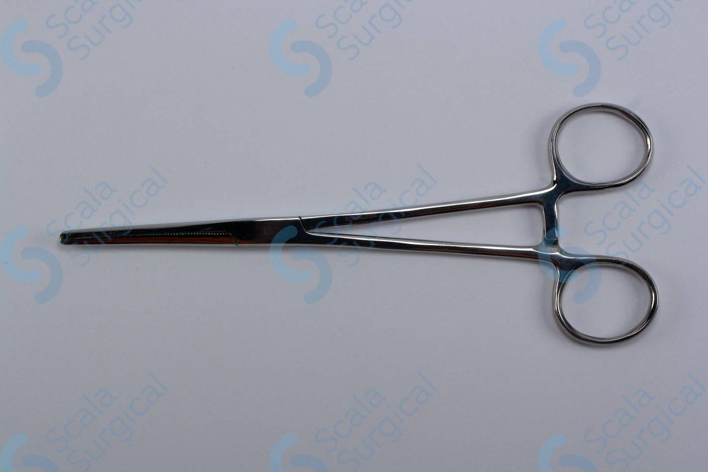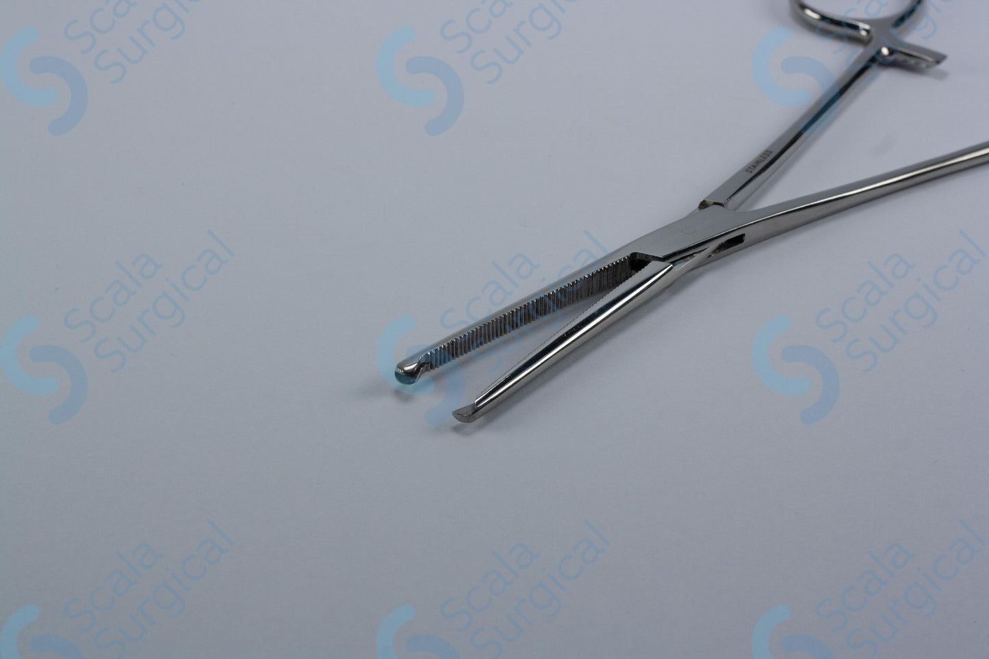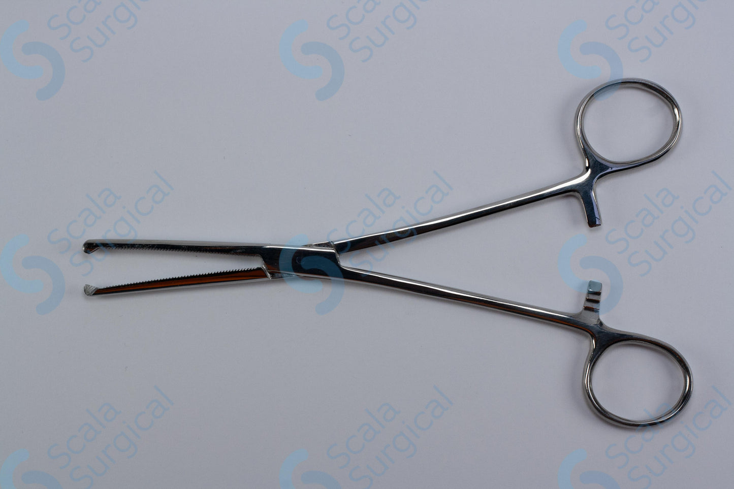This is a type of surgical forceps used for clamping and holding tissue during surgical procedures. It is designed with horizontal serrated jaws and a round end for maximum grip.