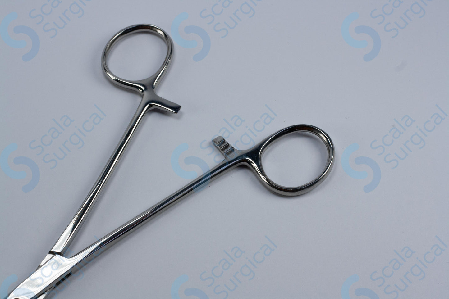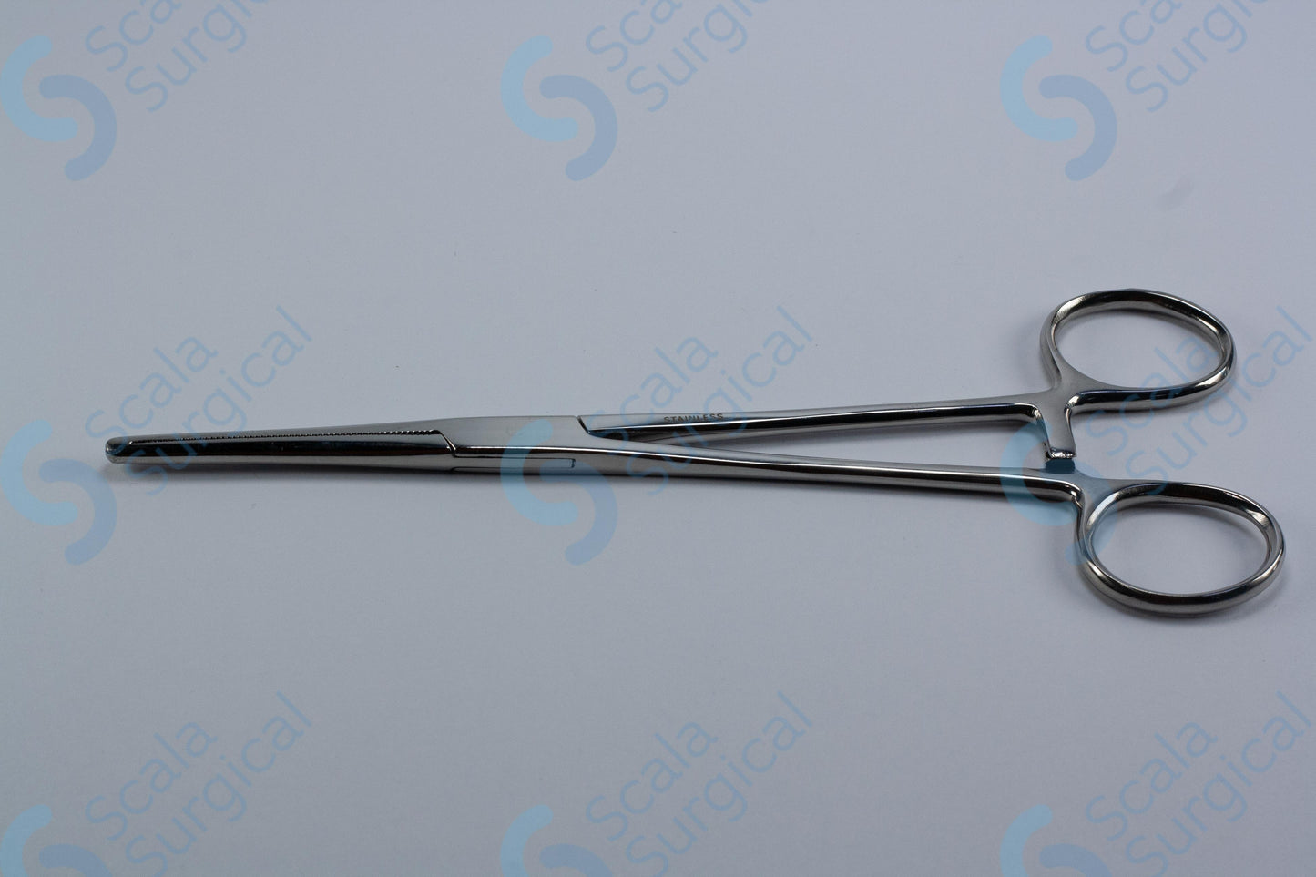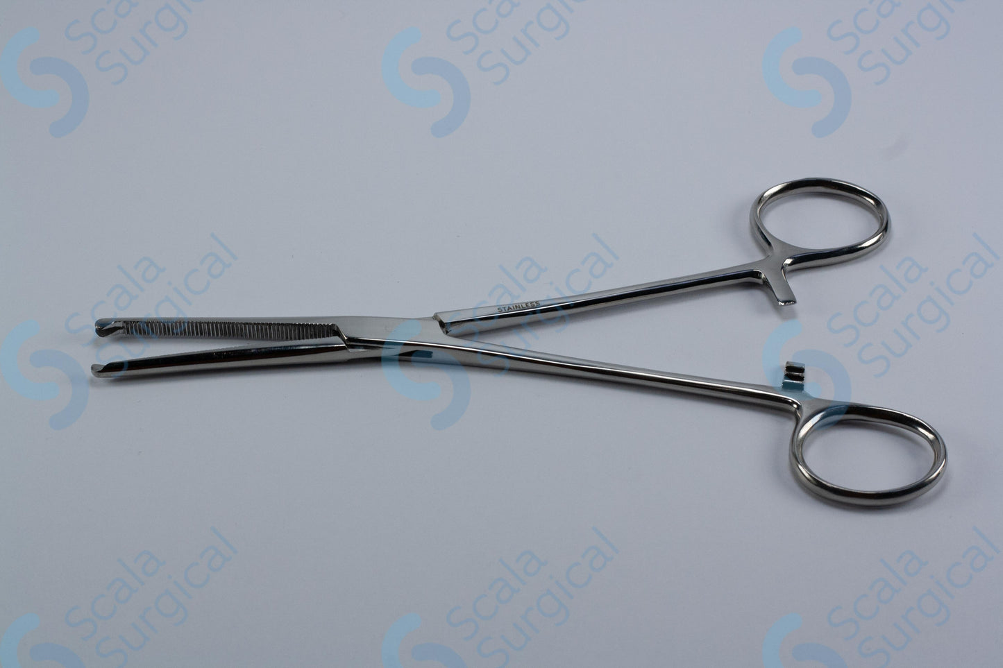This is a type of surgical forceps used for clamping and holding tissue during surgical procedures. It is designed with horizontal serrated jaws and a round end for maximum grip.