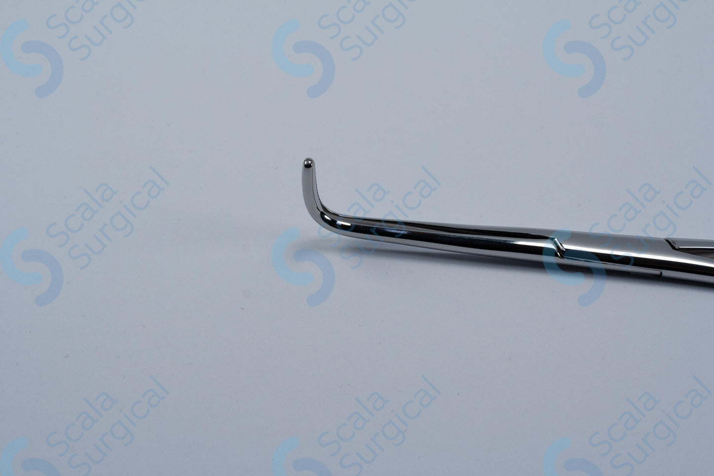 This Denis Browne Dissector is a surgical instrument used to dissect or separate tissue during a surgical procedure. It has plain jaws that are angled on a flat box joint, and it measures 203.2mm (or 8 inches).