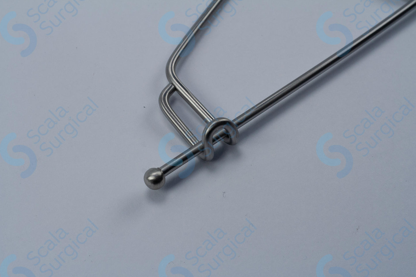 This Mayo Safety Pin is used to hold a ring handle forceps in place during a surgical procedure. The pin is 127mm (5 inch) long and is designed to securely attach the forceps to the patient's skin or clothing. It is made of stainless steel and is sterilized for single-use.